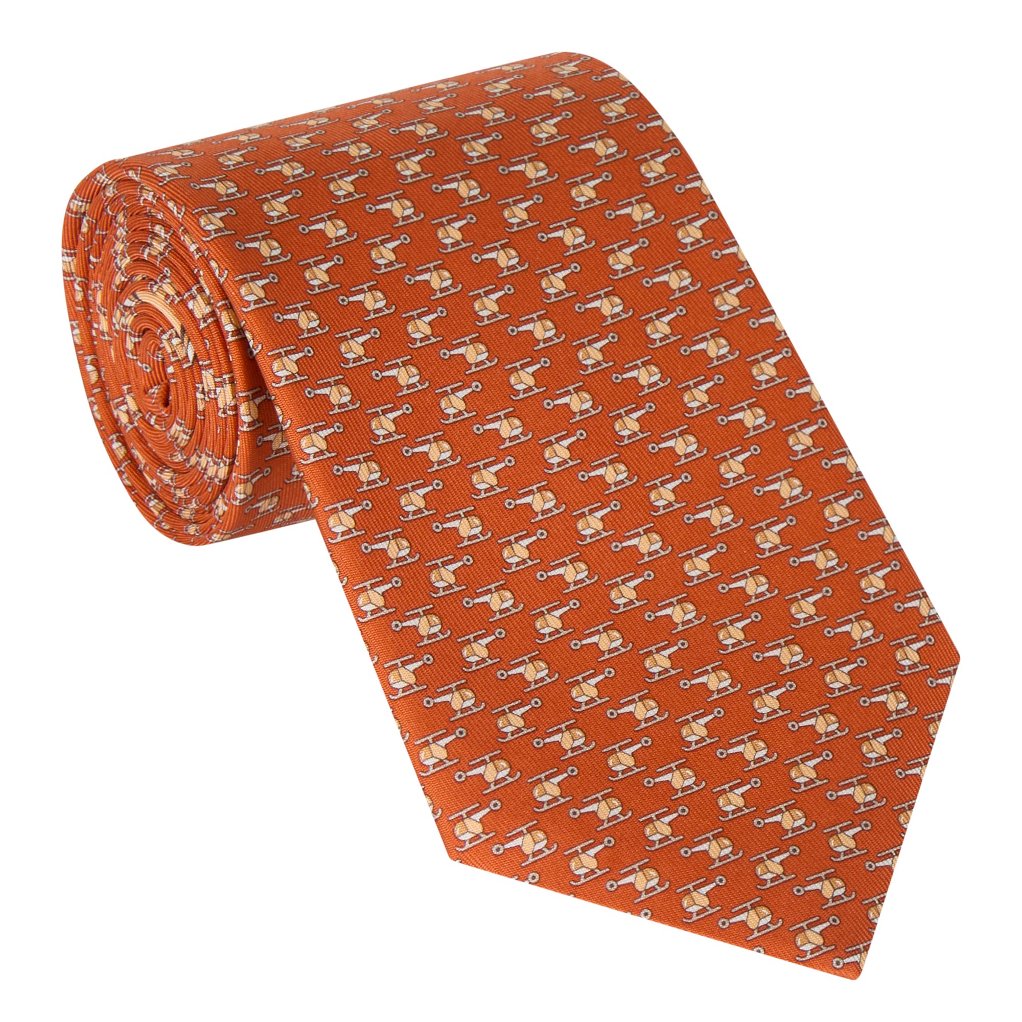 • Helicopter print, wide blade, pointed tip, fully lined