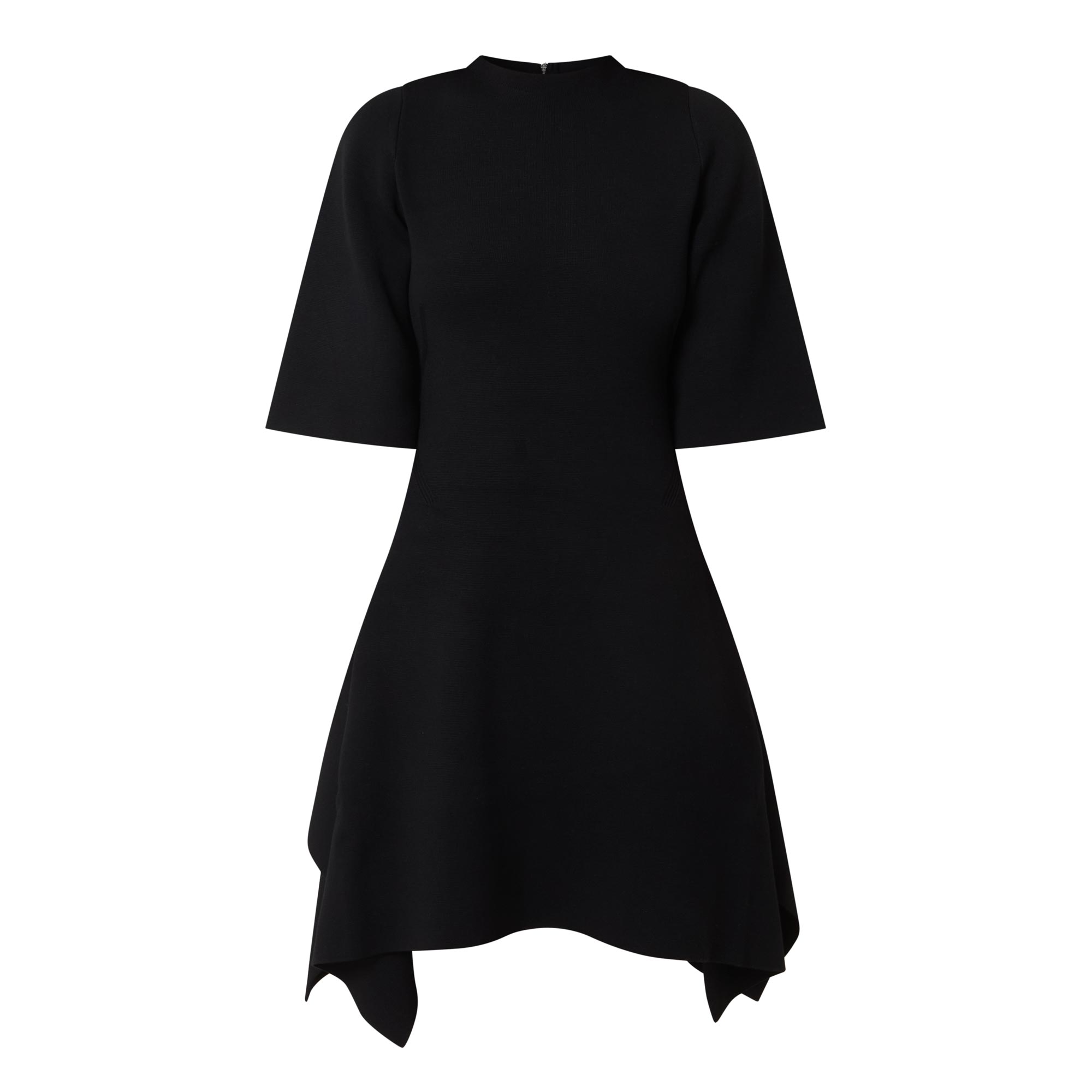 - Mock neck, half length sleeves, rear exposed zip fastening, flared skirt, asymmetric hem, mini length