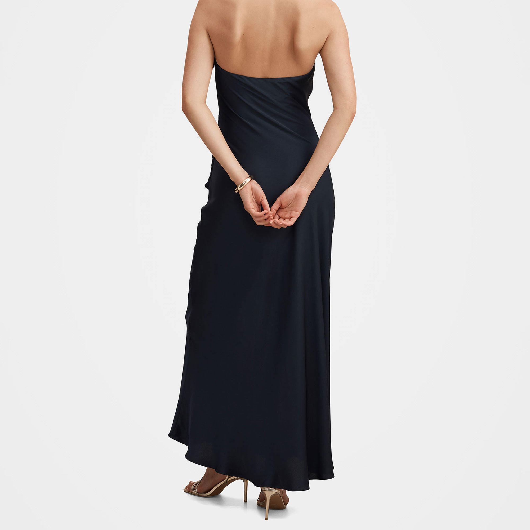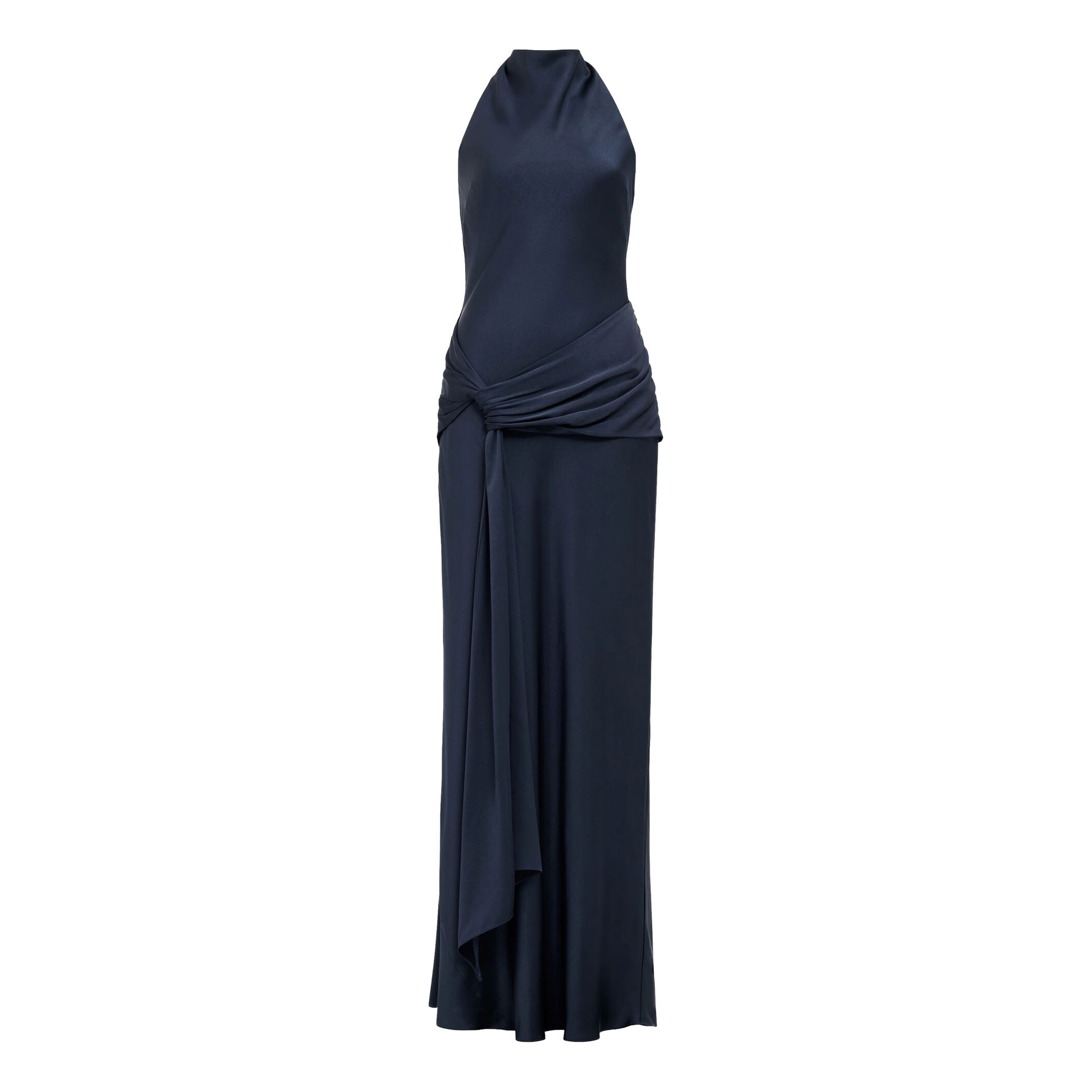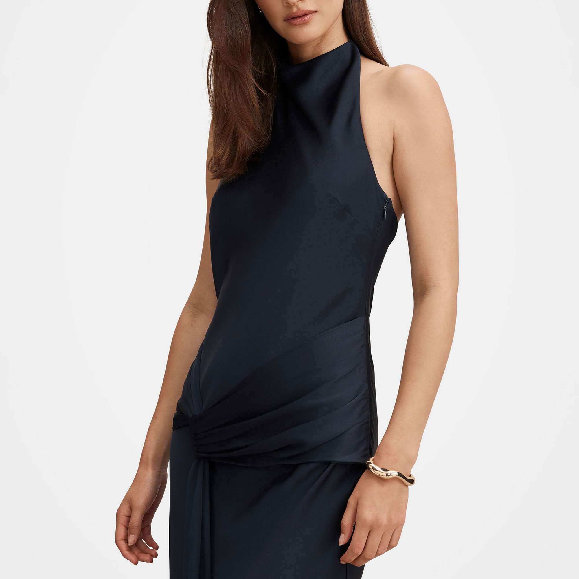 - Satin fabrication, maxi length, fitted bodice, gathered halter neckline, front knot detail, slip-on style, lined