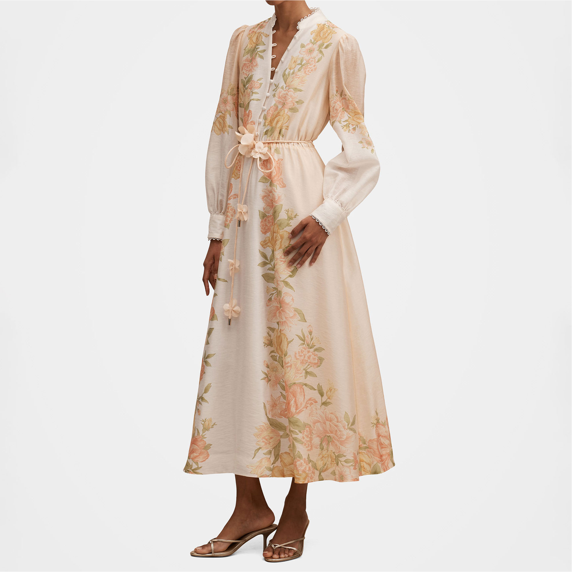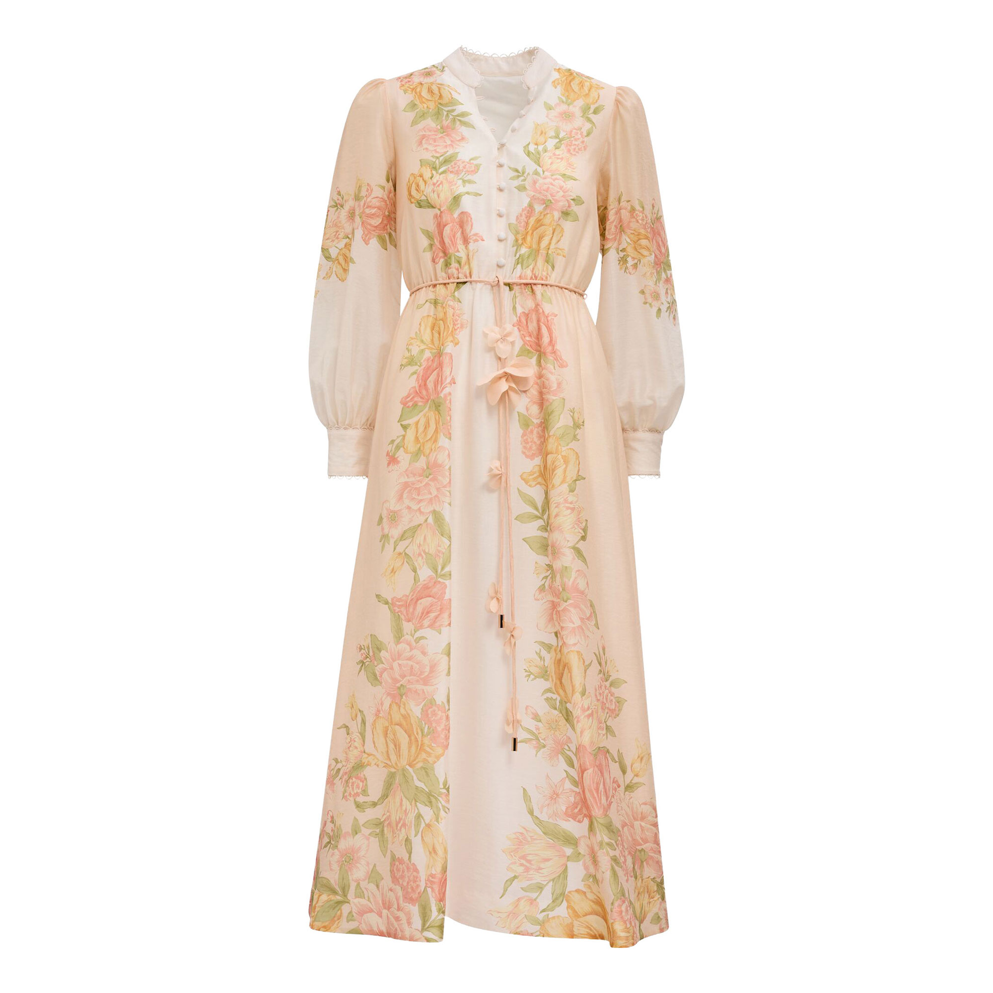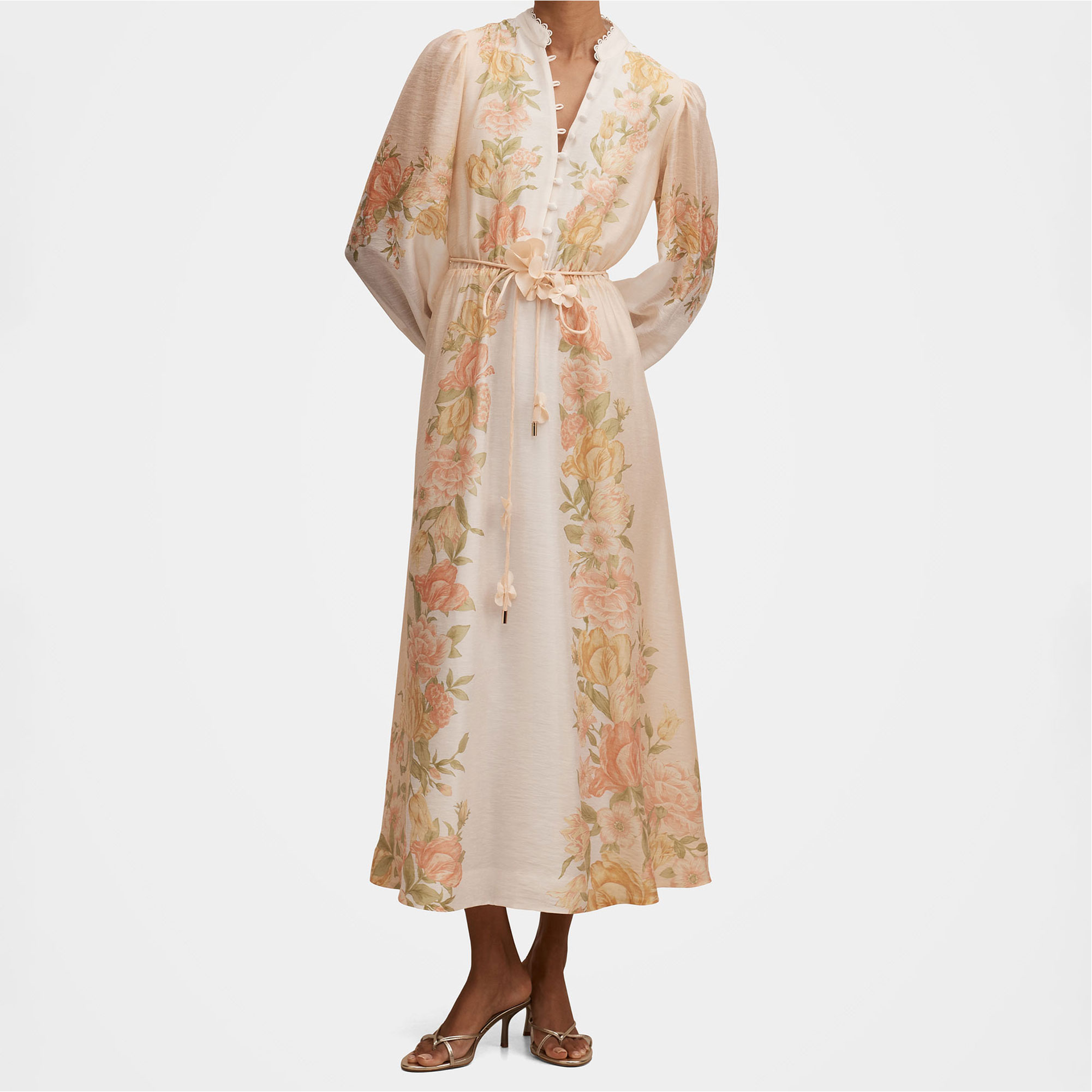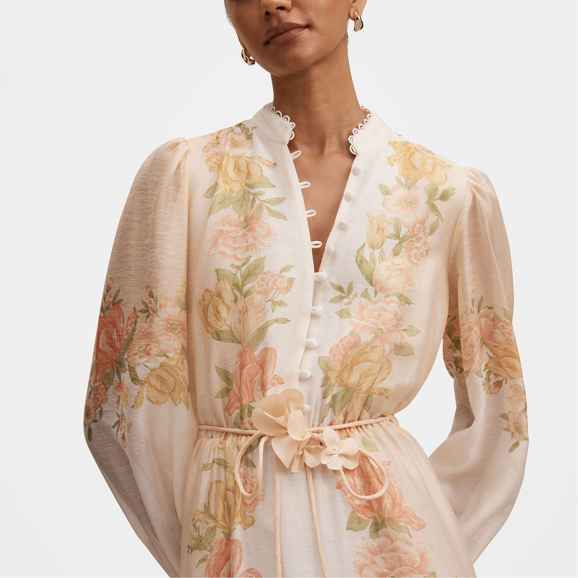 - Midi length, lightweight woven fabrication, stand neckline, lace trim, long blouson sleeves, gathered cuffs, belted, floral decals on tassel details, A-line silhouette, floral print, button- front placket, lined