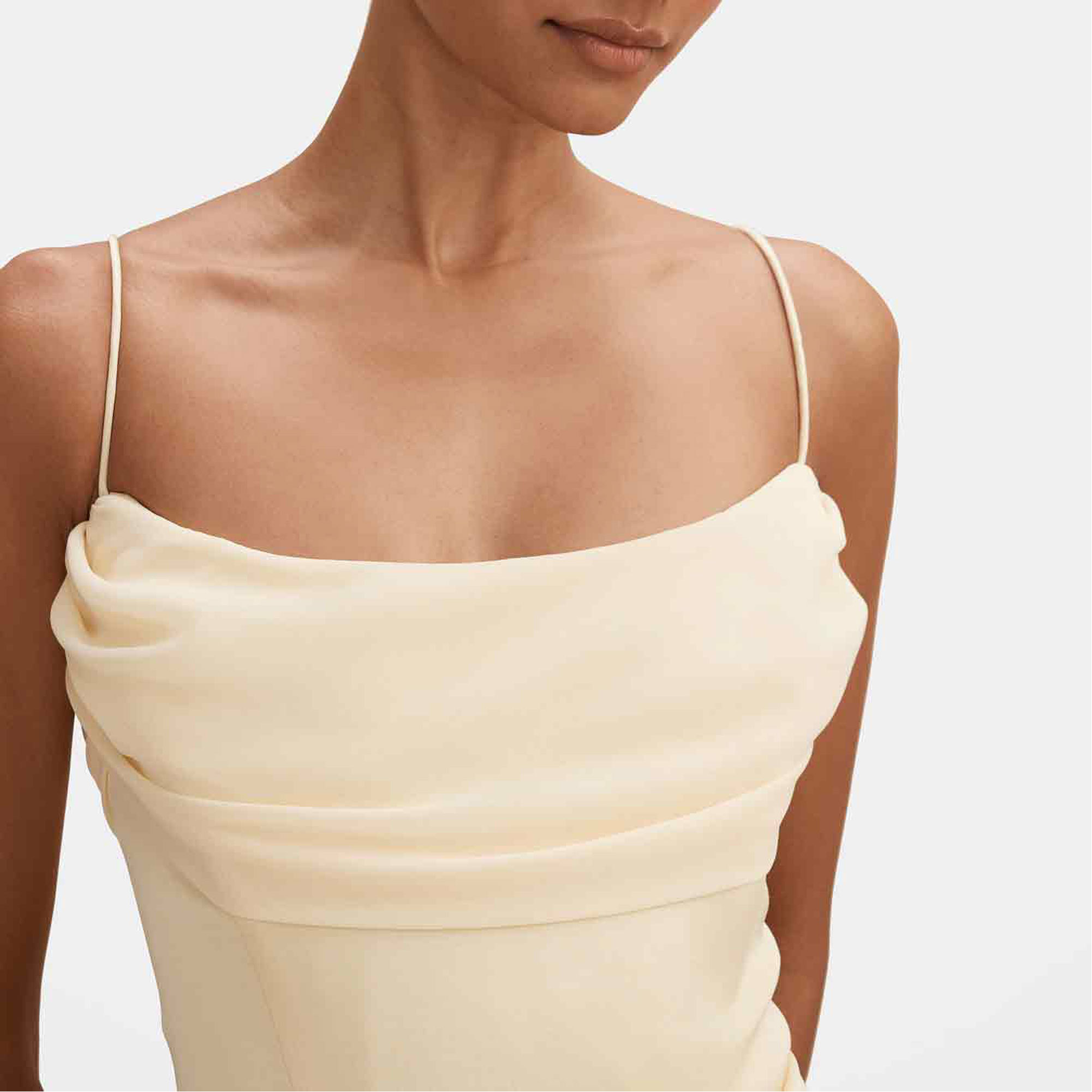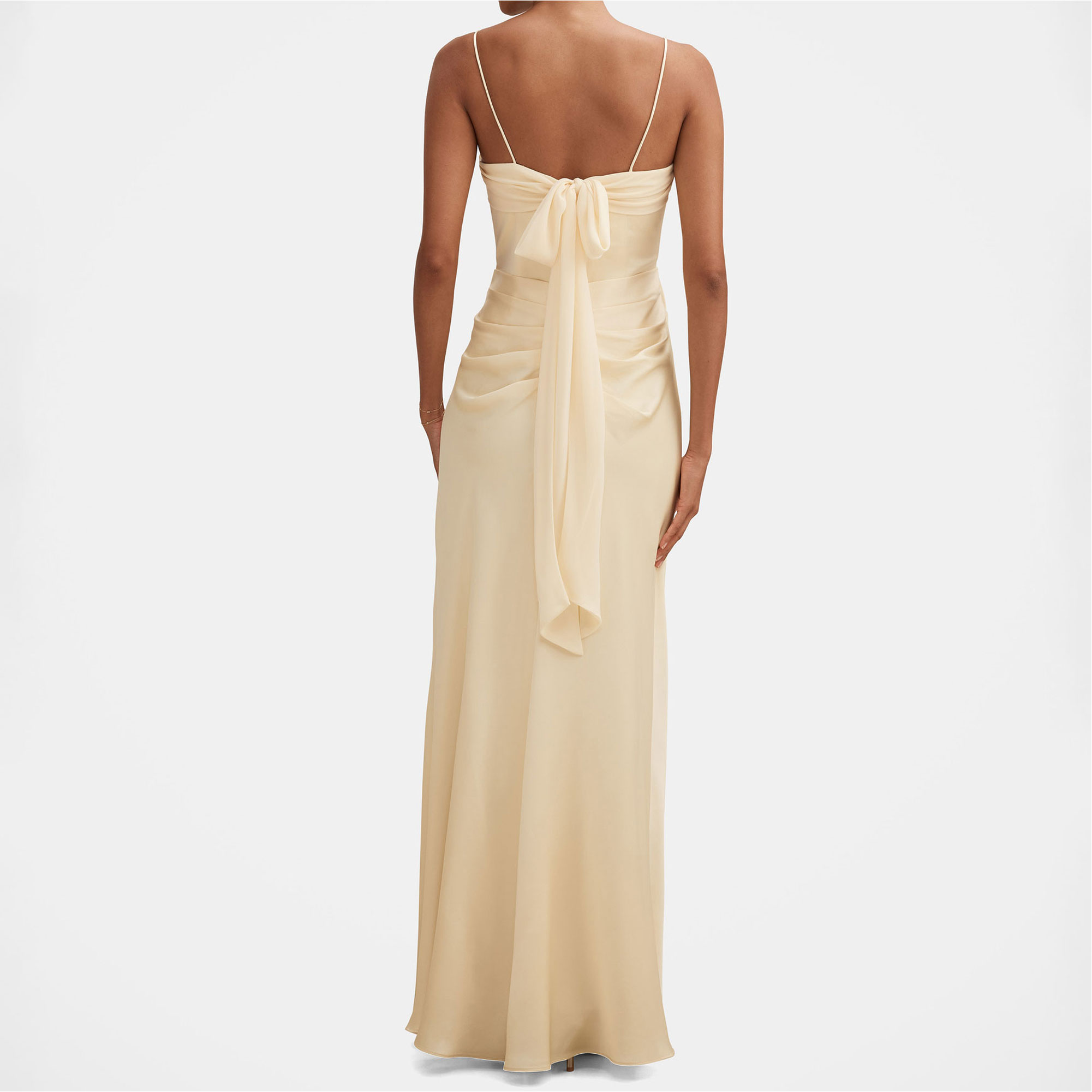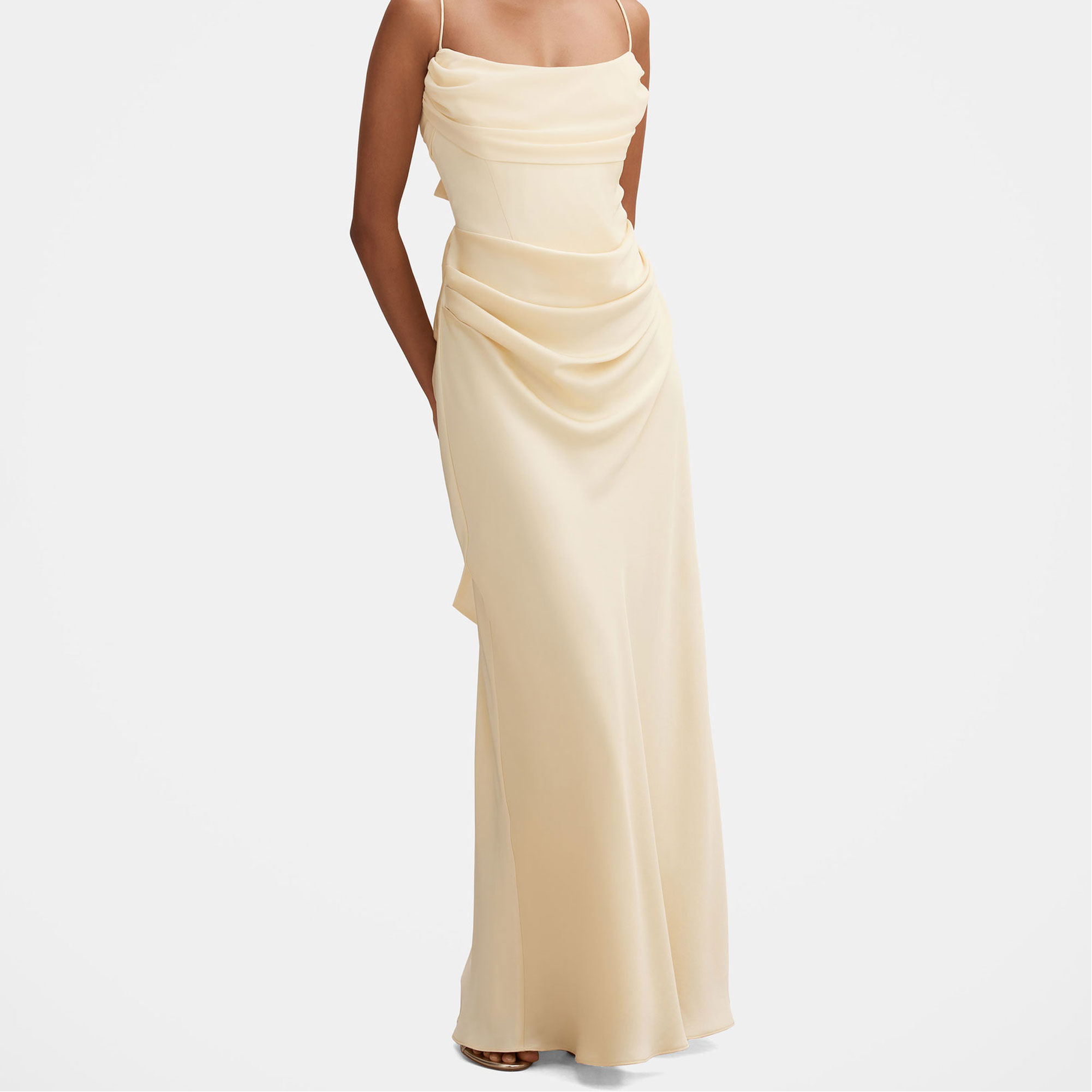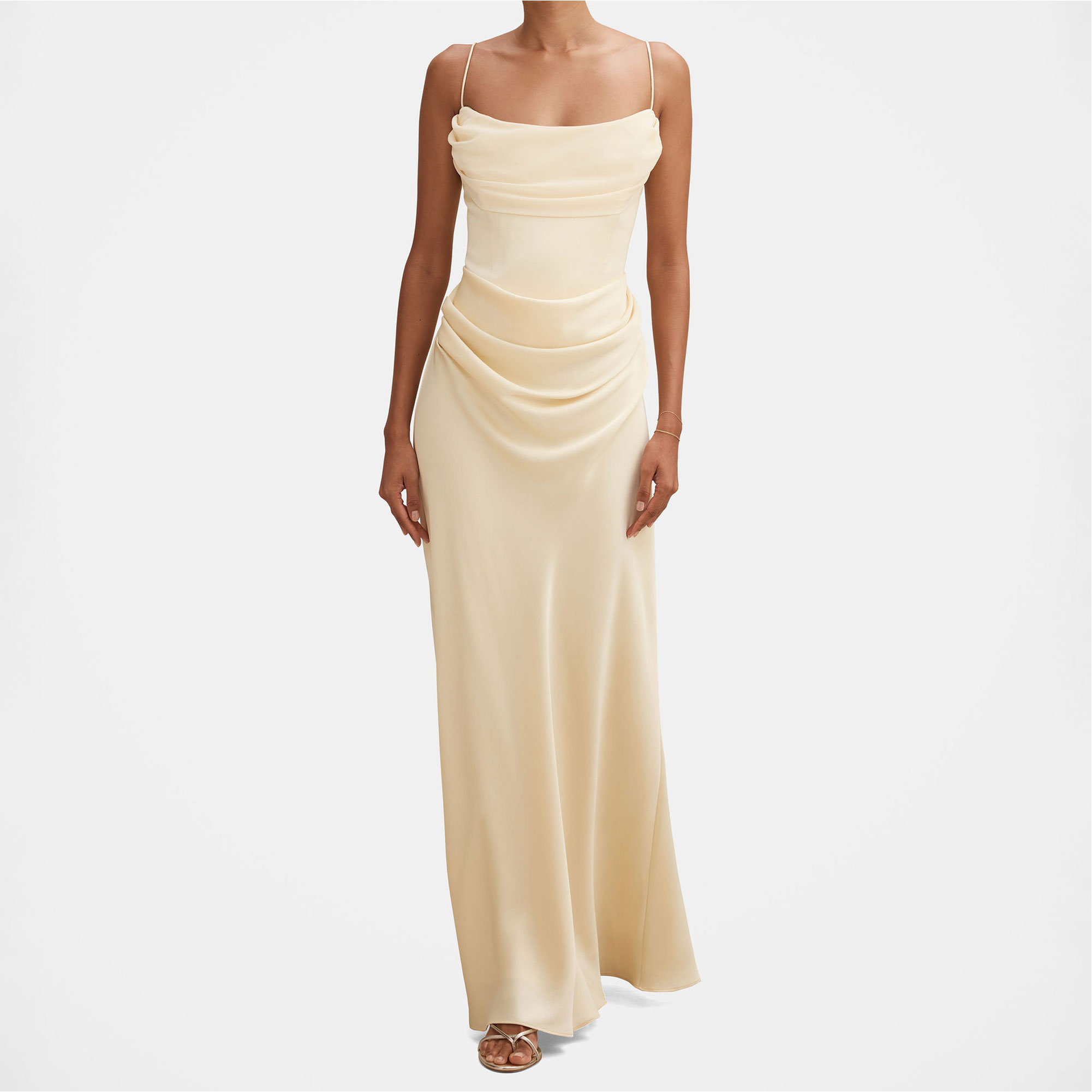 - Maxi length, satin finish, scoop neckline, draped front, structured corset panel, column skirt, rear tie detail, spaghetti straps, zip fastening, lined