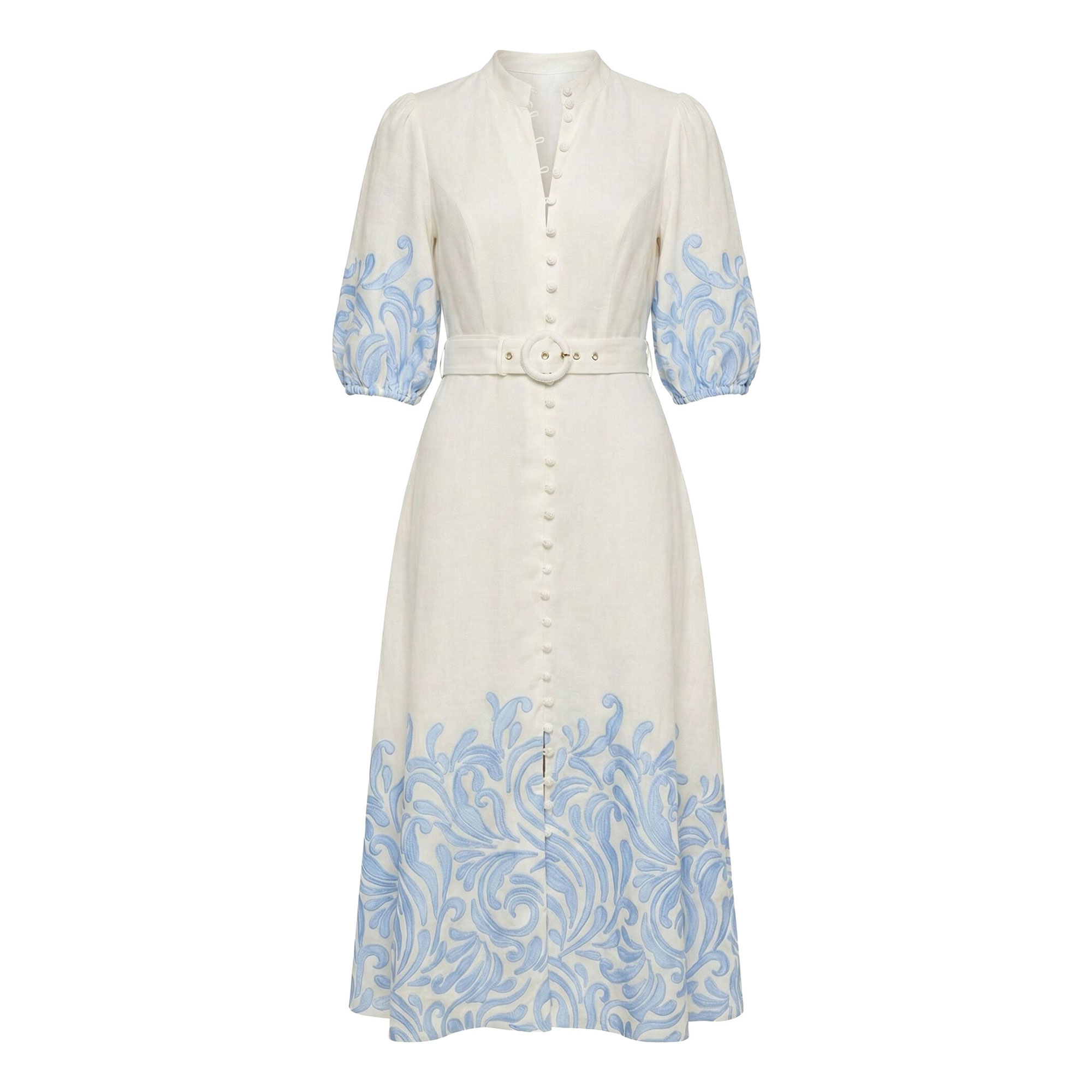 - Embroidered detailing, midi length, lightweight woven fabrication, stand neckline, blouson sleeves, elasticated cuffs, princess seams, A-line silhouette, belted waist, floral detailing, lined