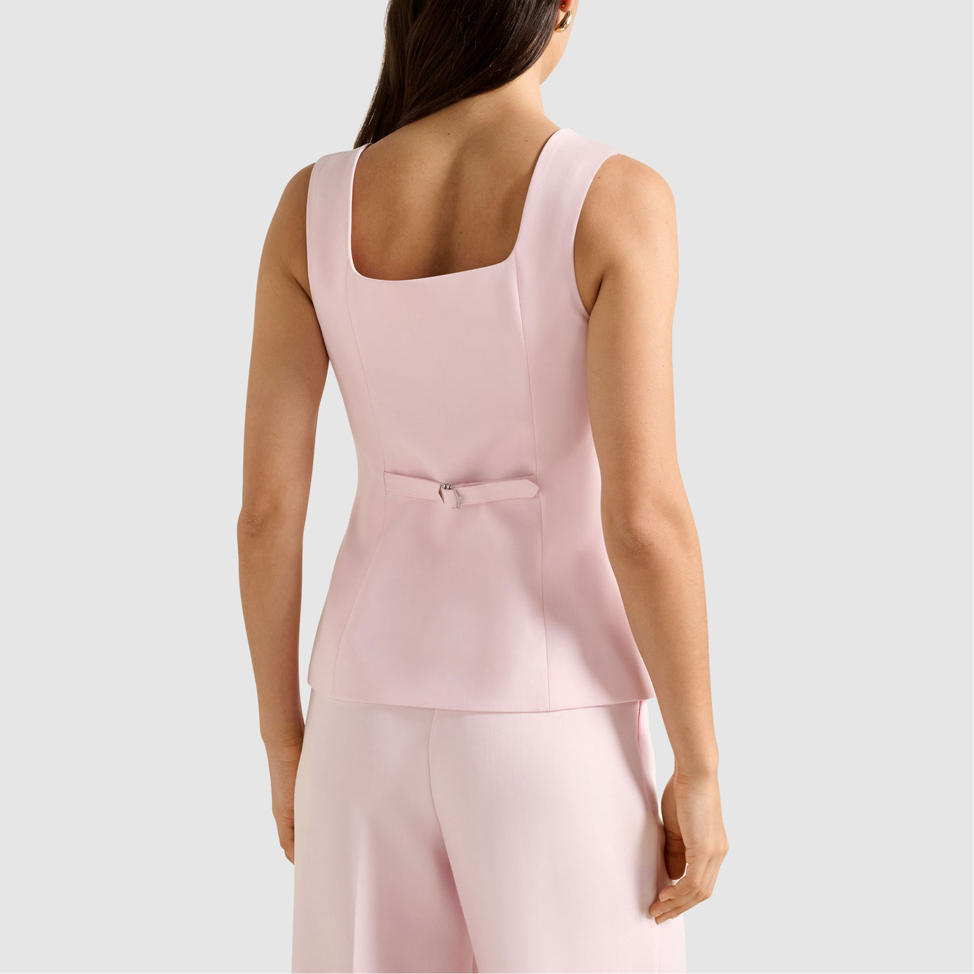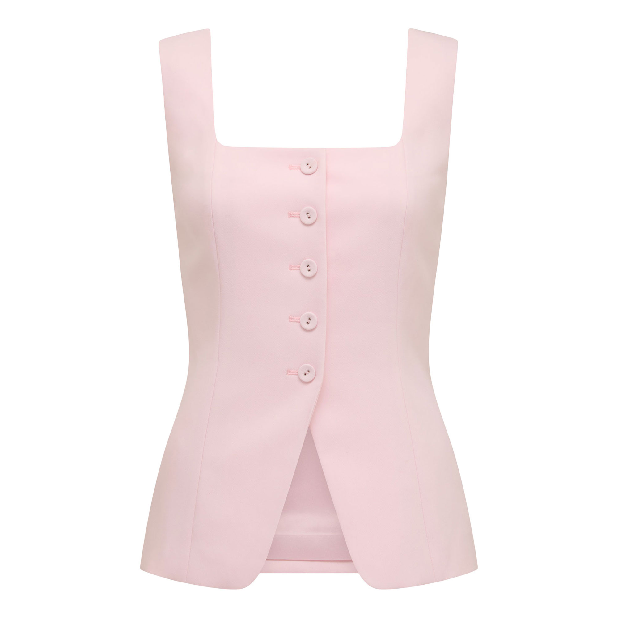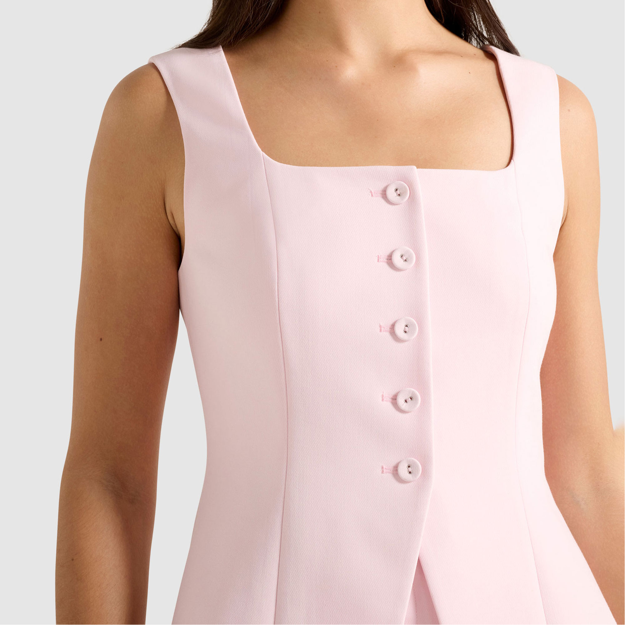- Square neck, sleeveless, structured