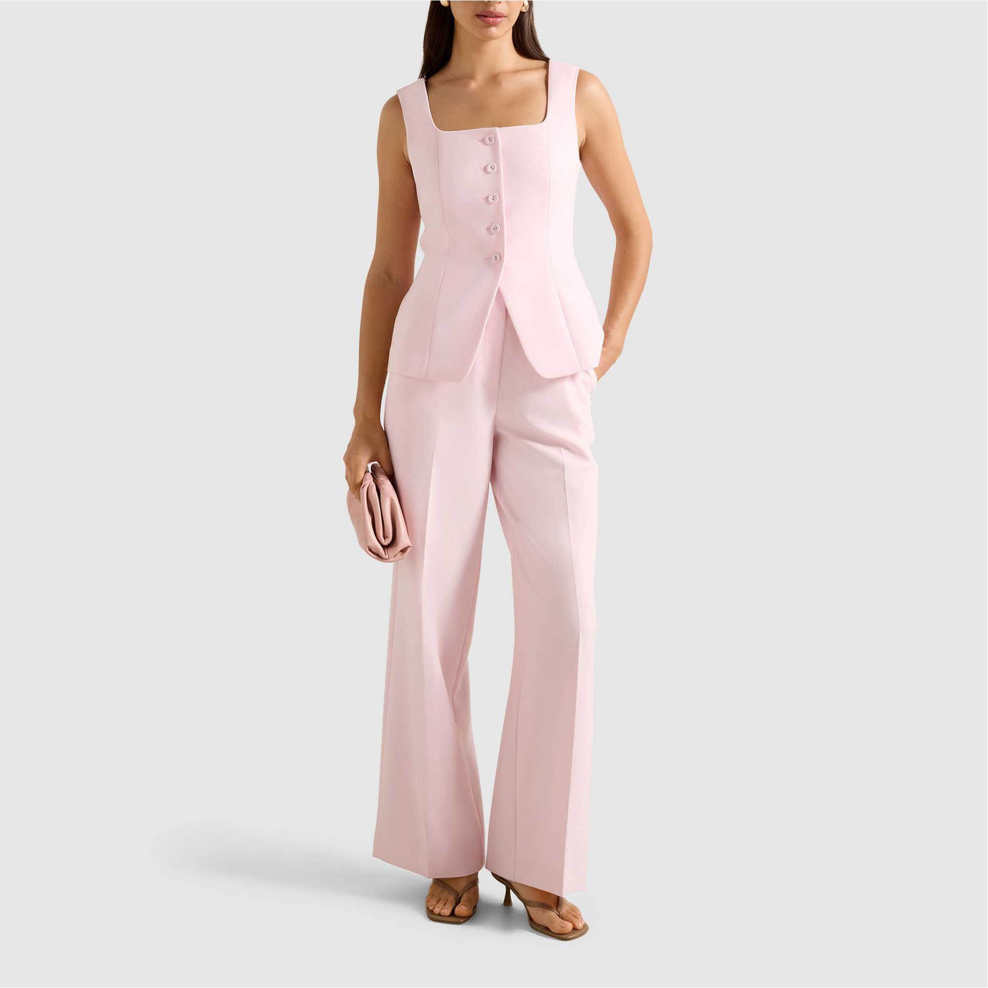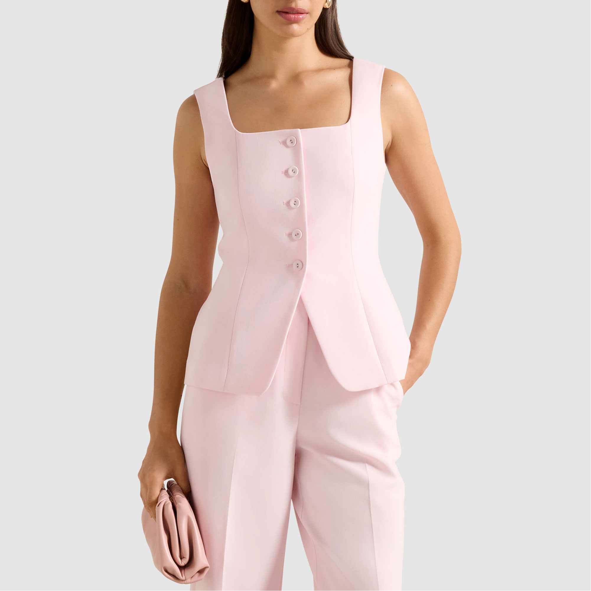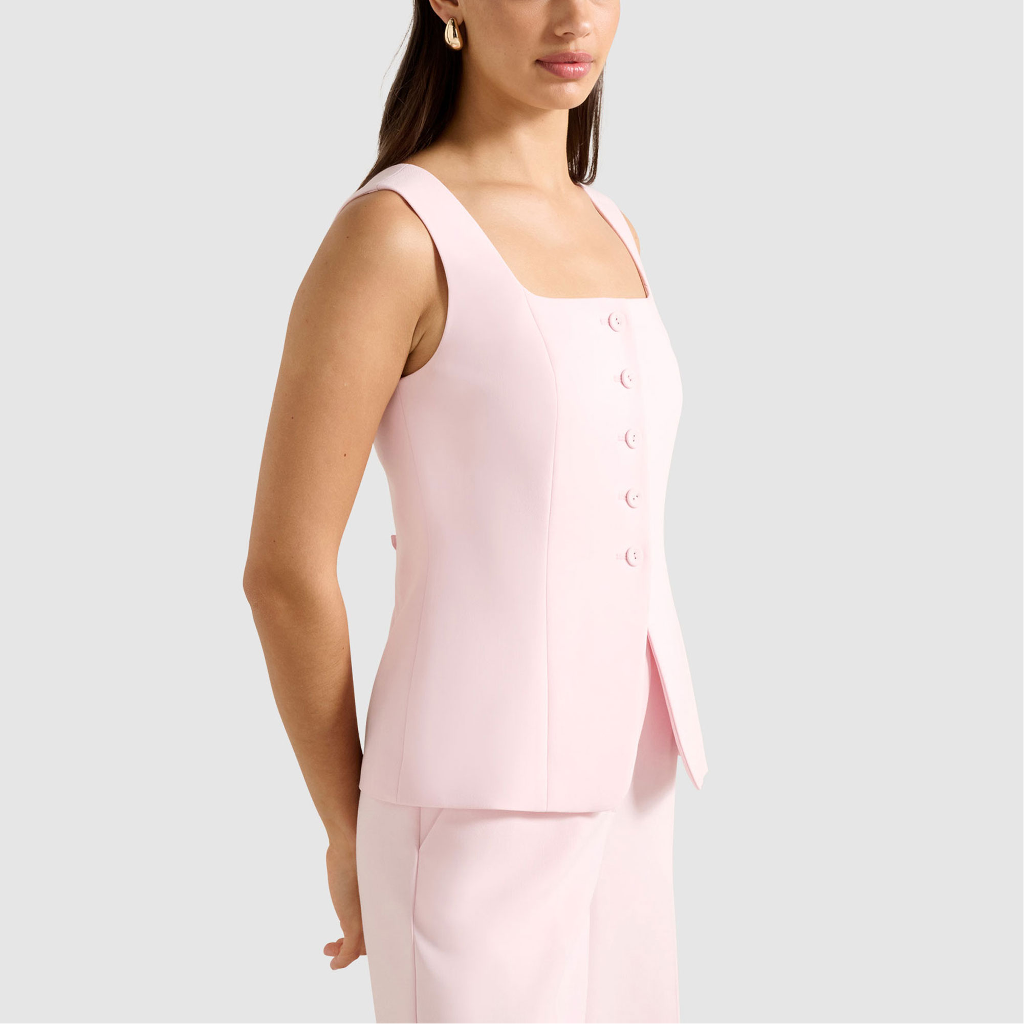 - Square neck, sleeveless, structured