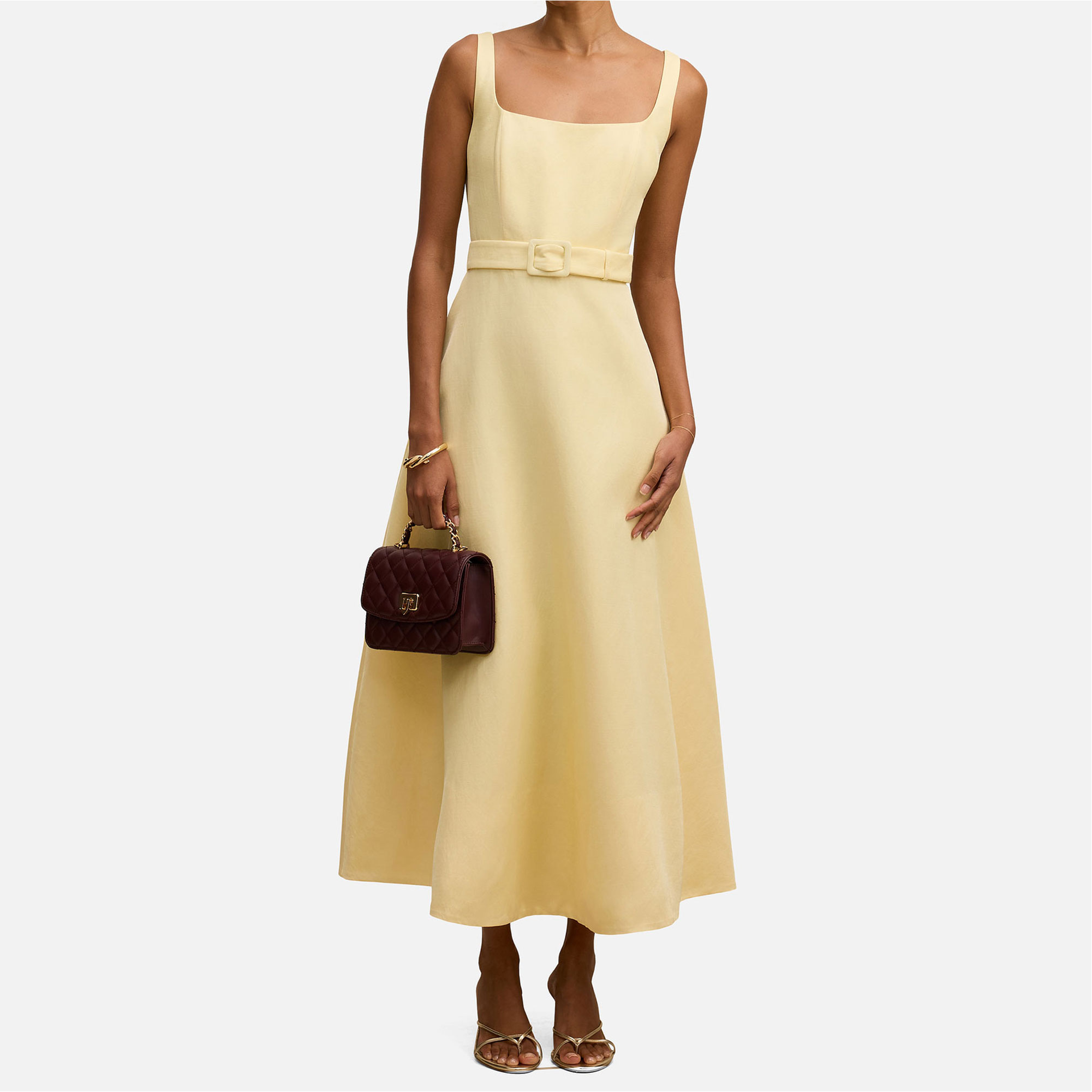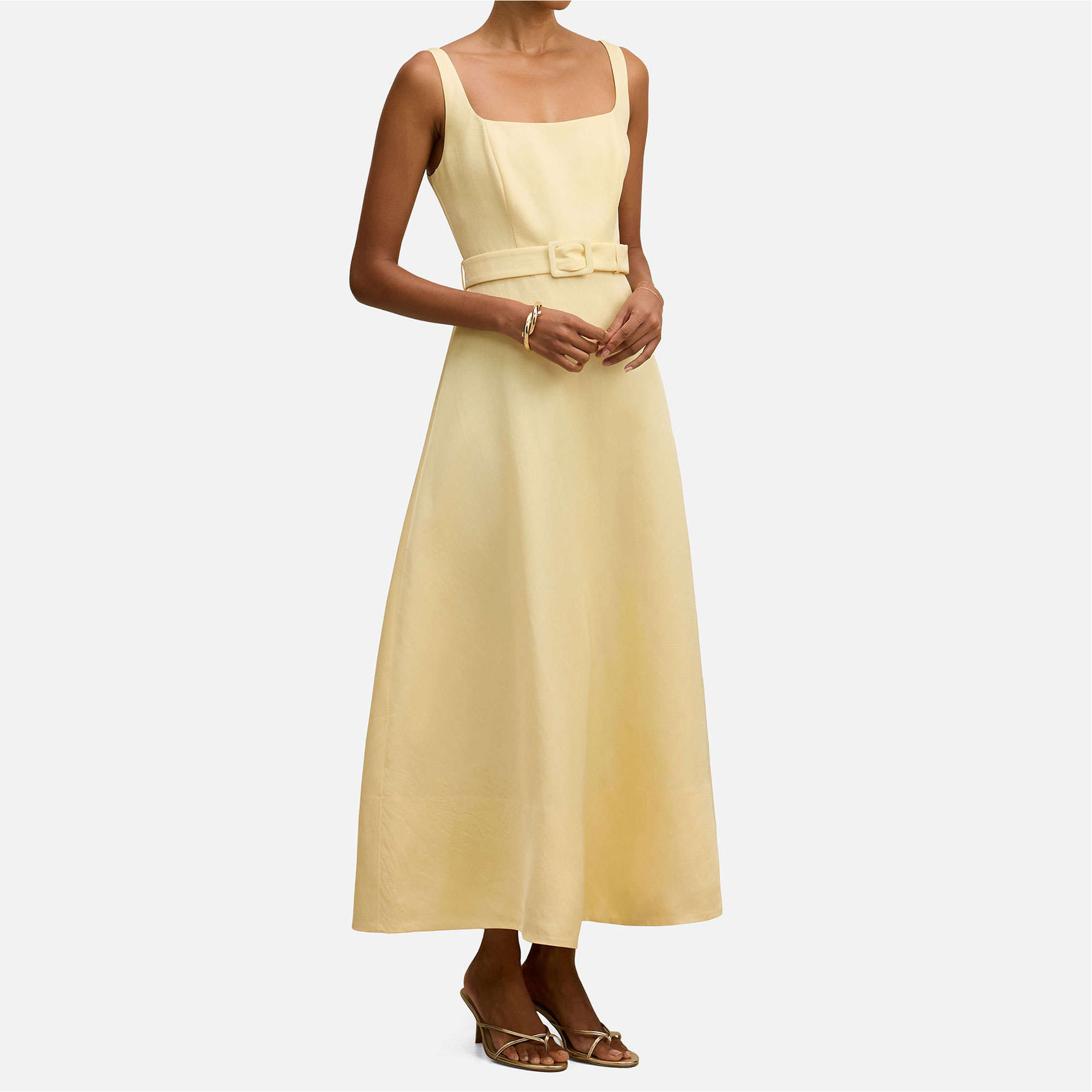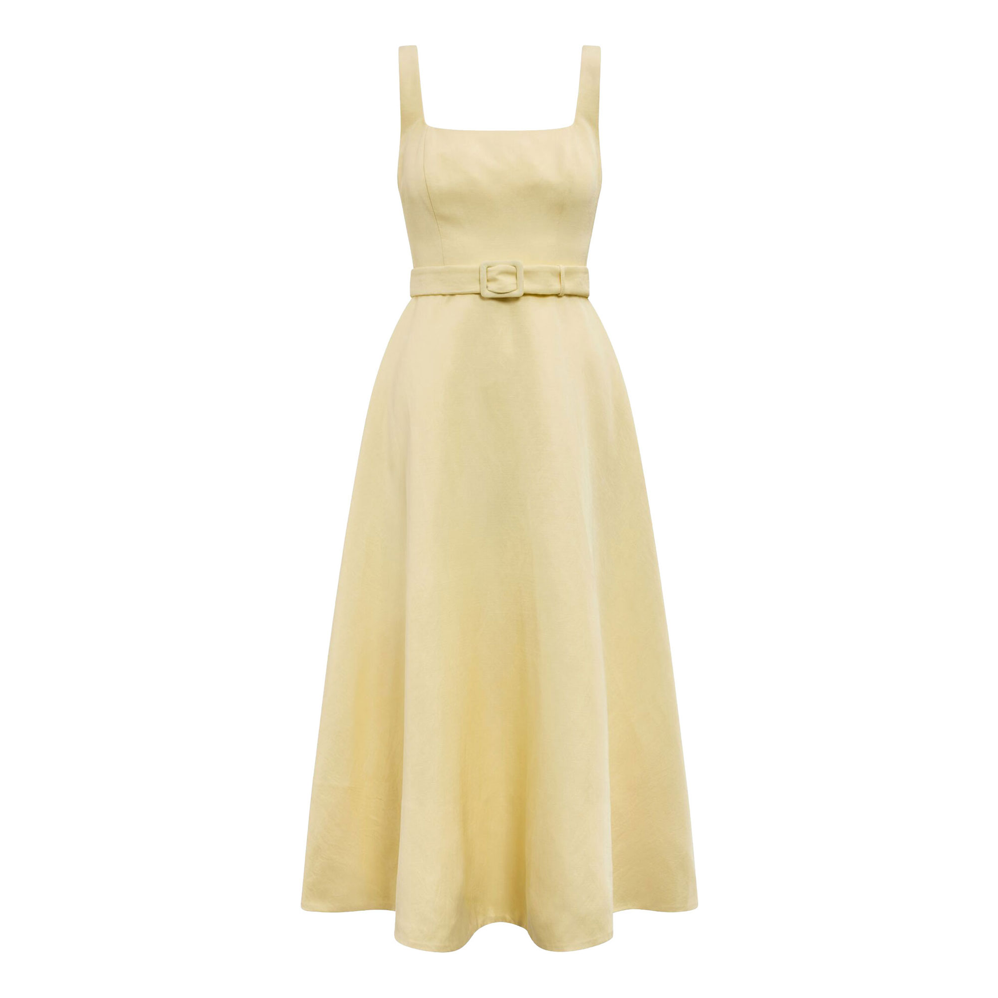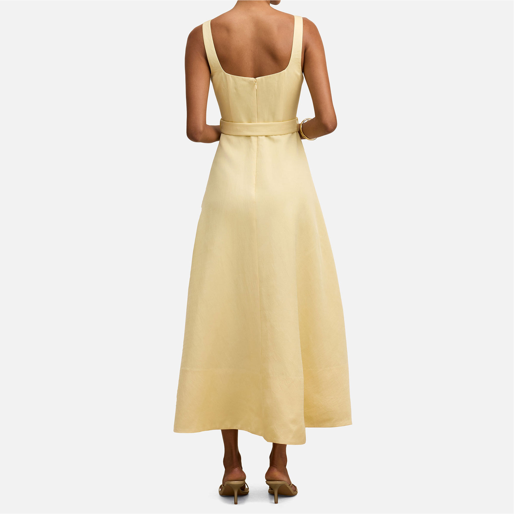 • Square neckline, midi length, soft woven fabrication, open back, princess seams through the bodice, belted waist, fabric buckle detail, A-line silhouette, concealed zip fastening, lined