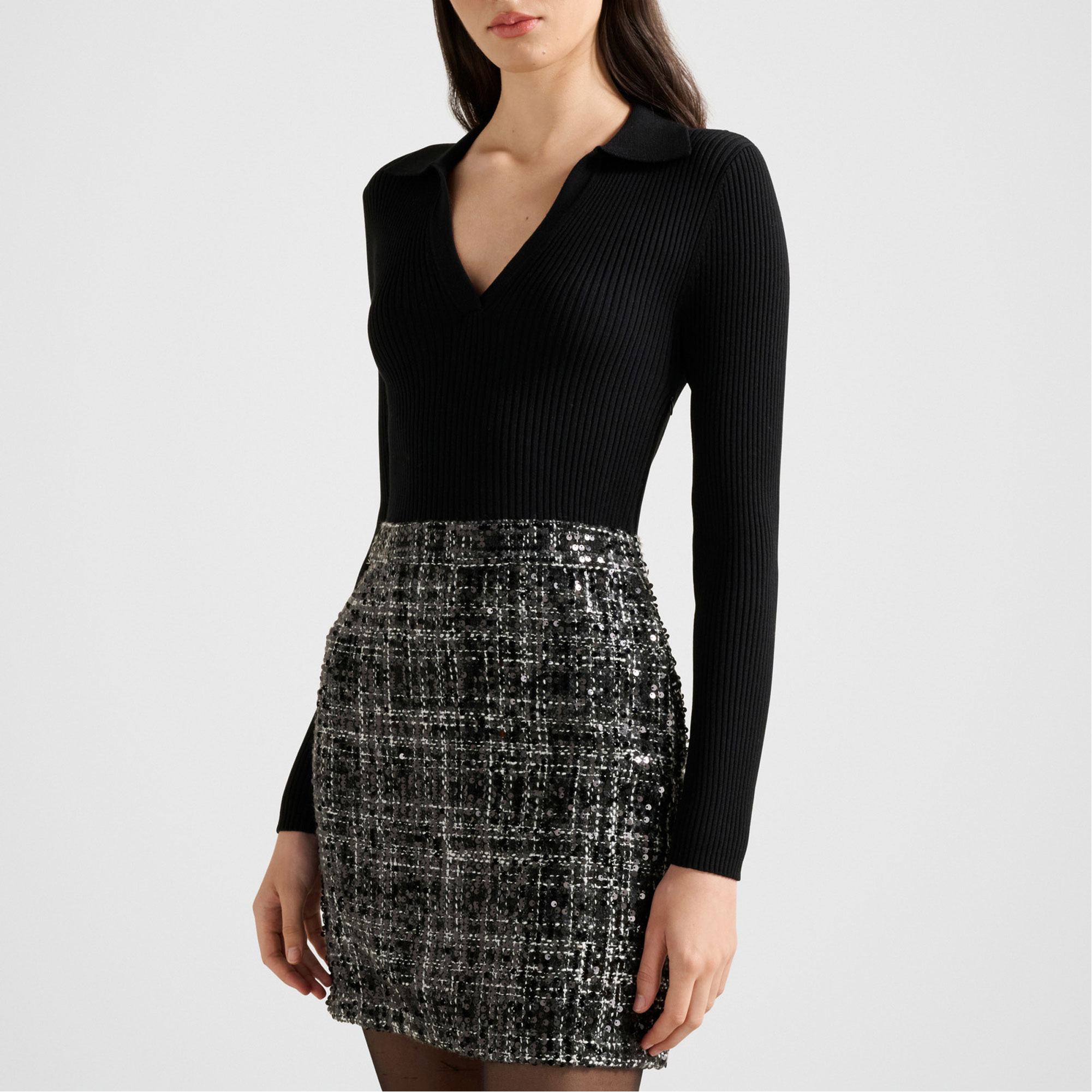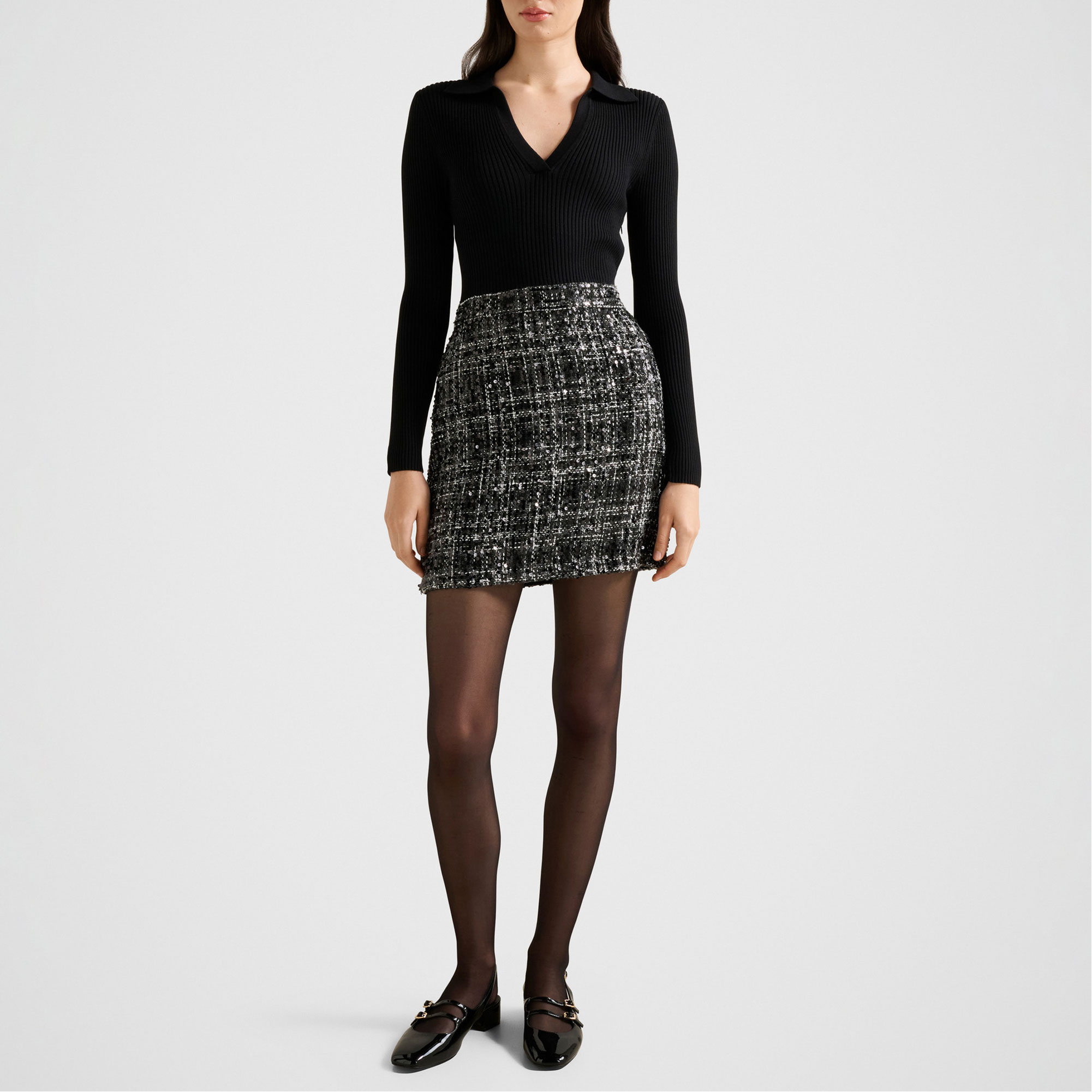 - Fold-down collar with v-neckline, long fitted sleeves, sequin-embellished skirt, concealed zip fastening at side, lined
