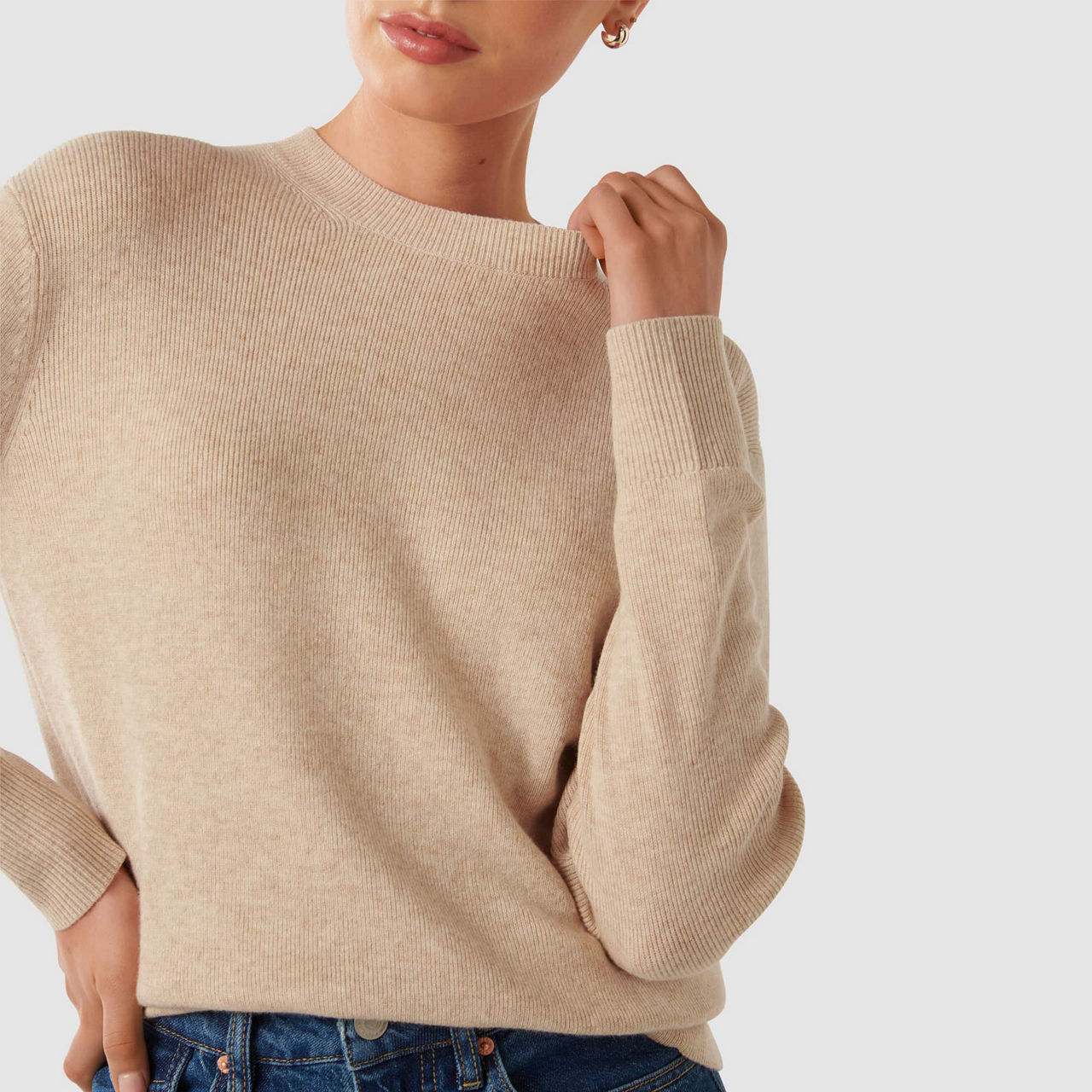 - Wool blend fabrication, crew neckline, fitted sleeves, slip-on style