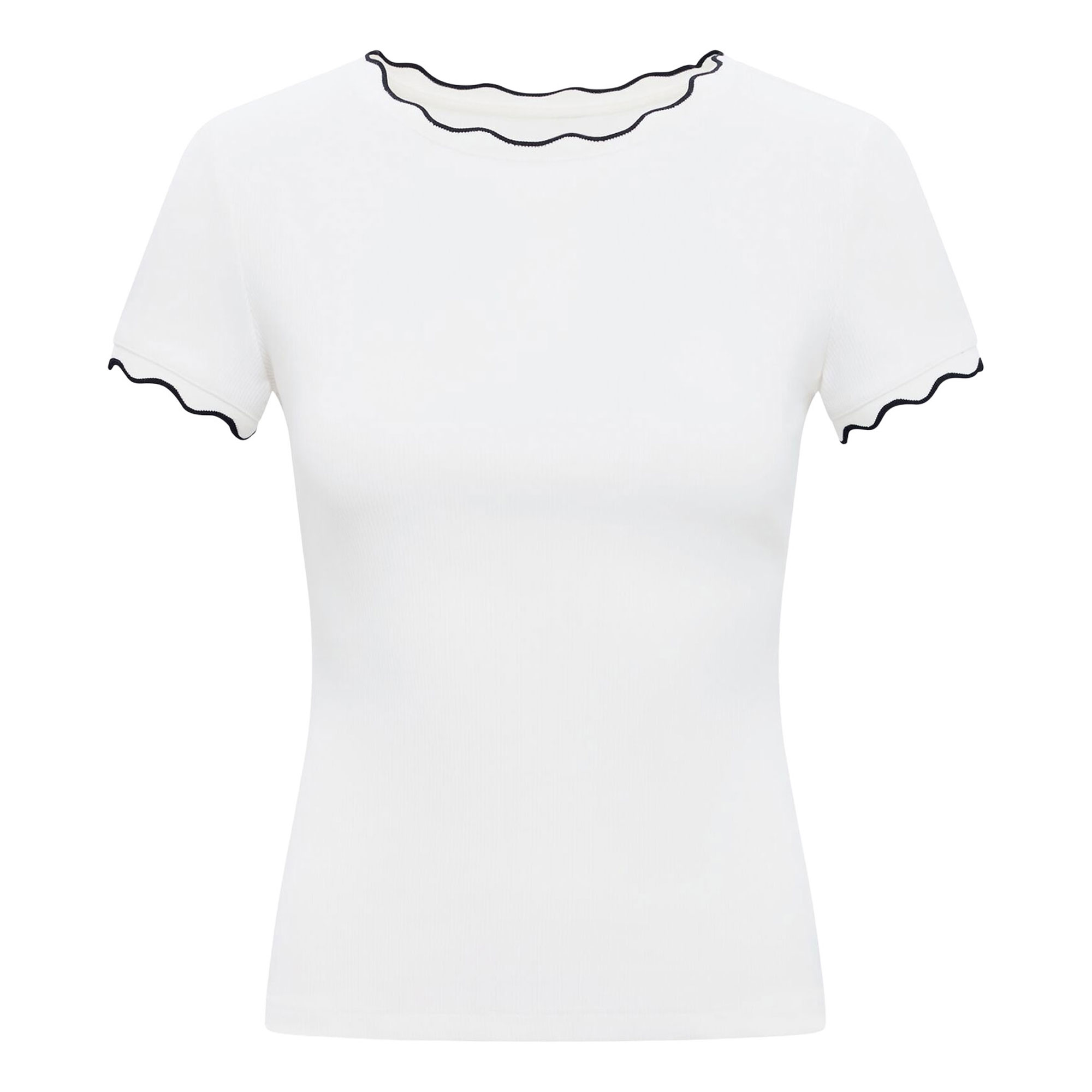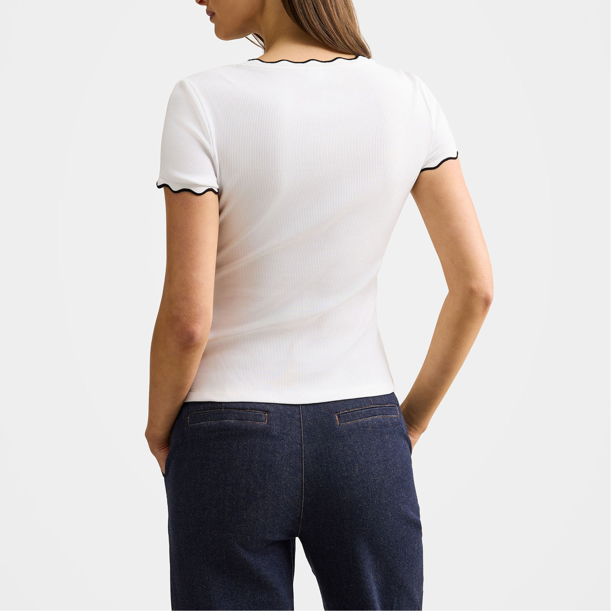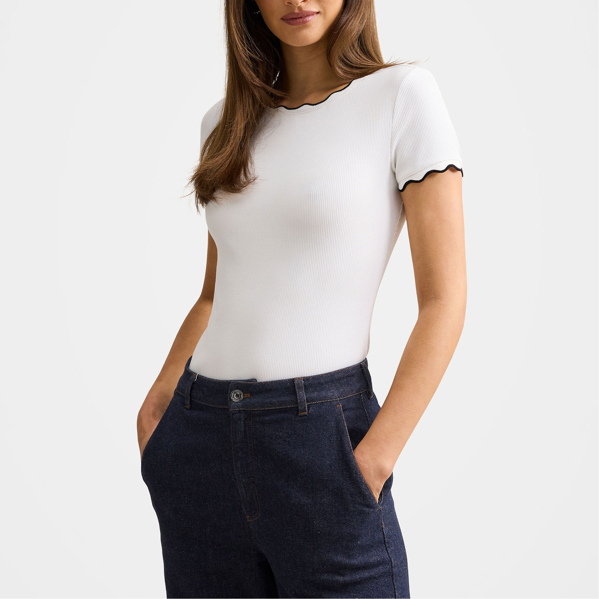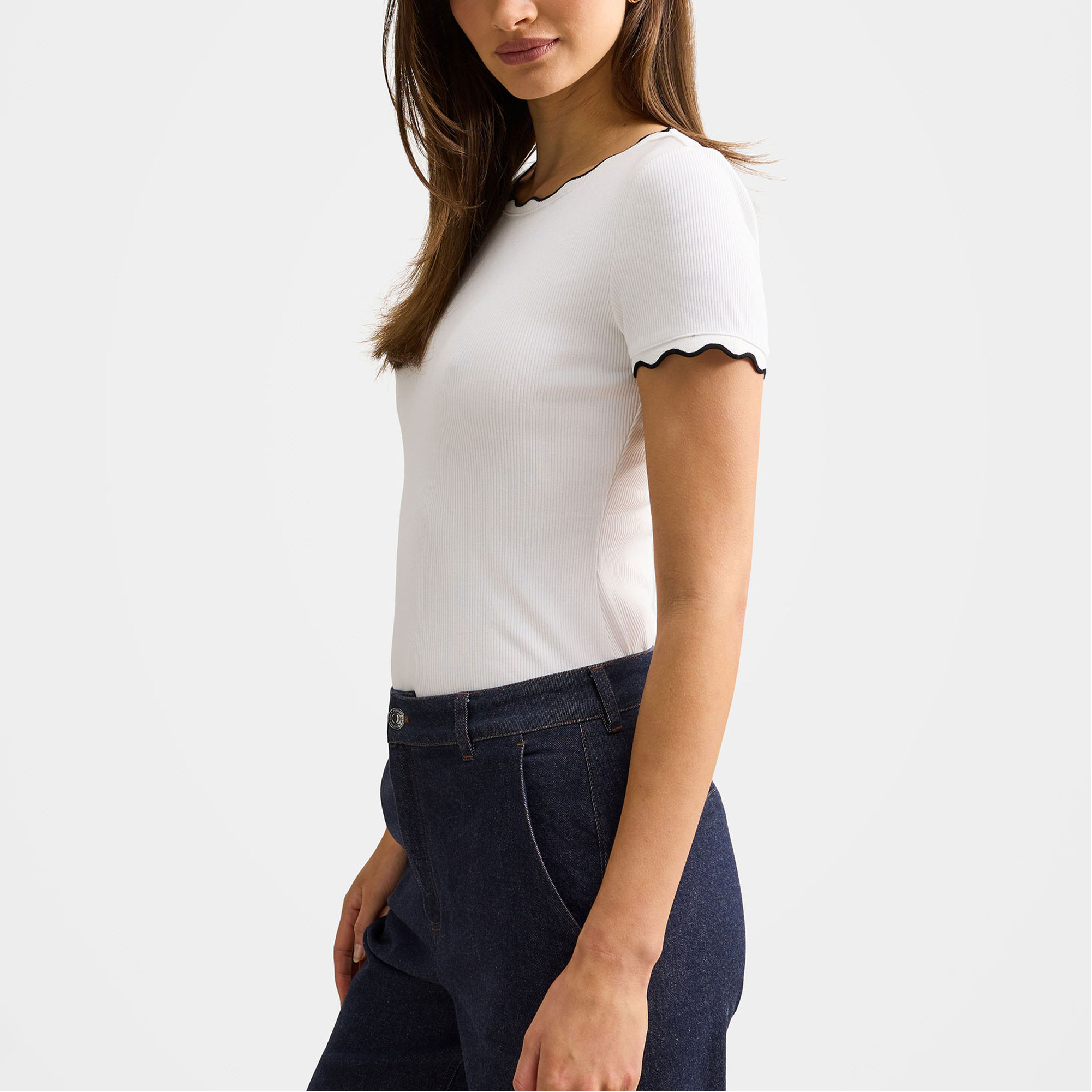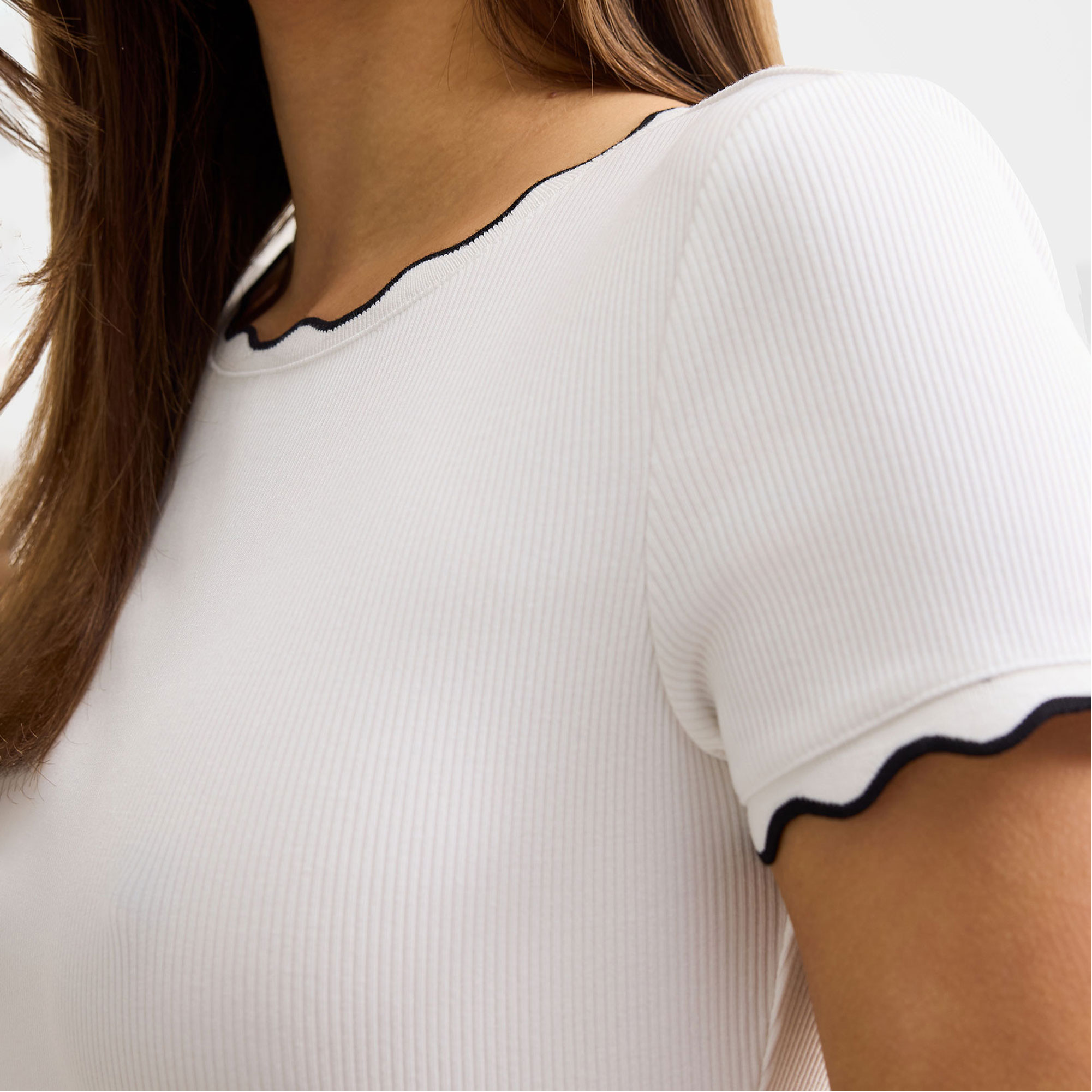 - Regular fit silhouette, soft stretch fabric for a comfortable fit, contrast scalloped neck and sleeves, short sleeves, easy slip-on style