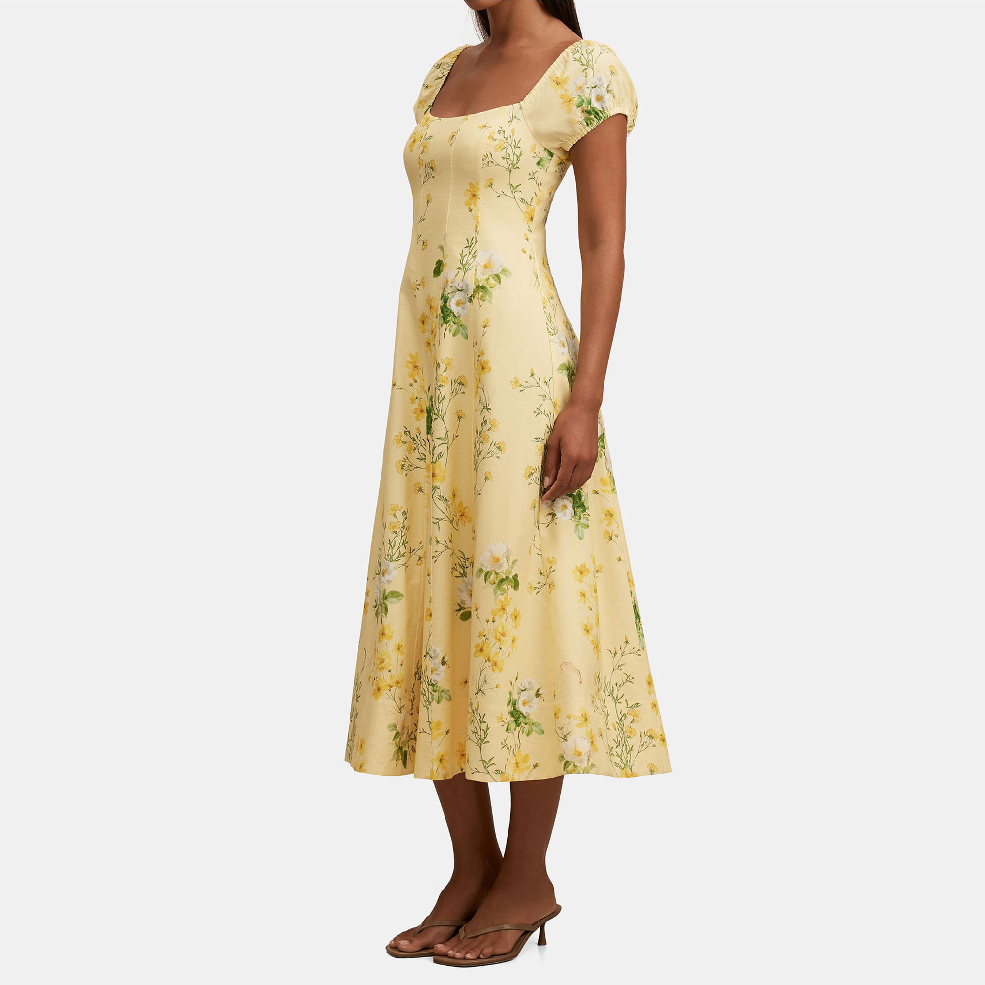- Cap sleeves, square neck, elasticated cuffs, midi length, A-line silhouette, fully lined, pleated detail