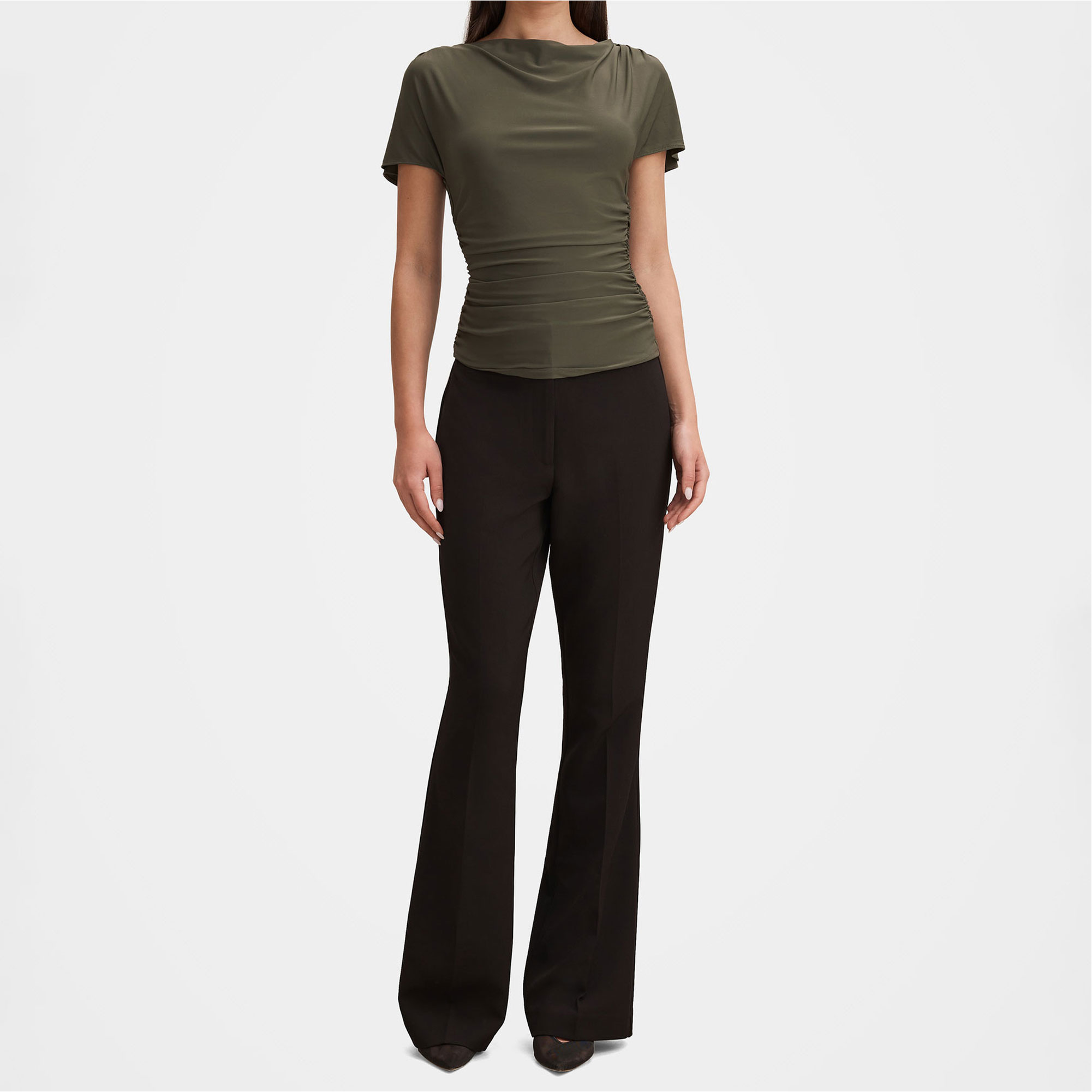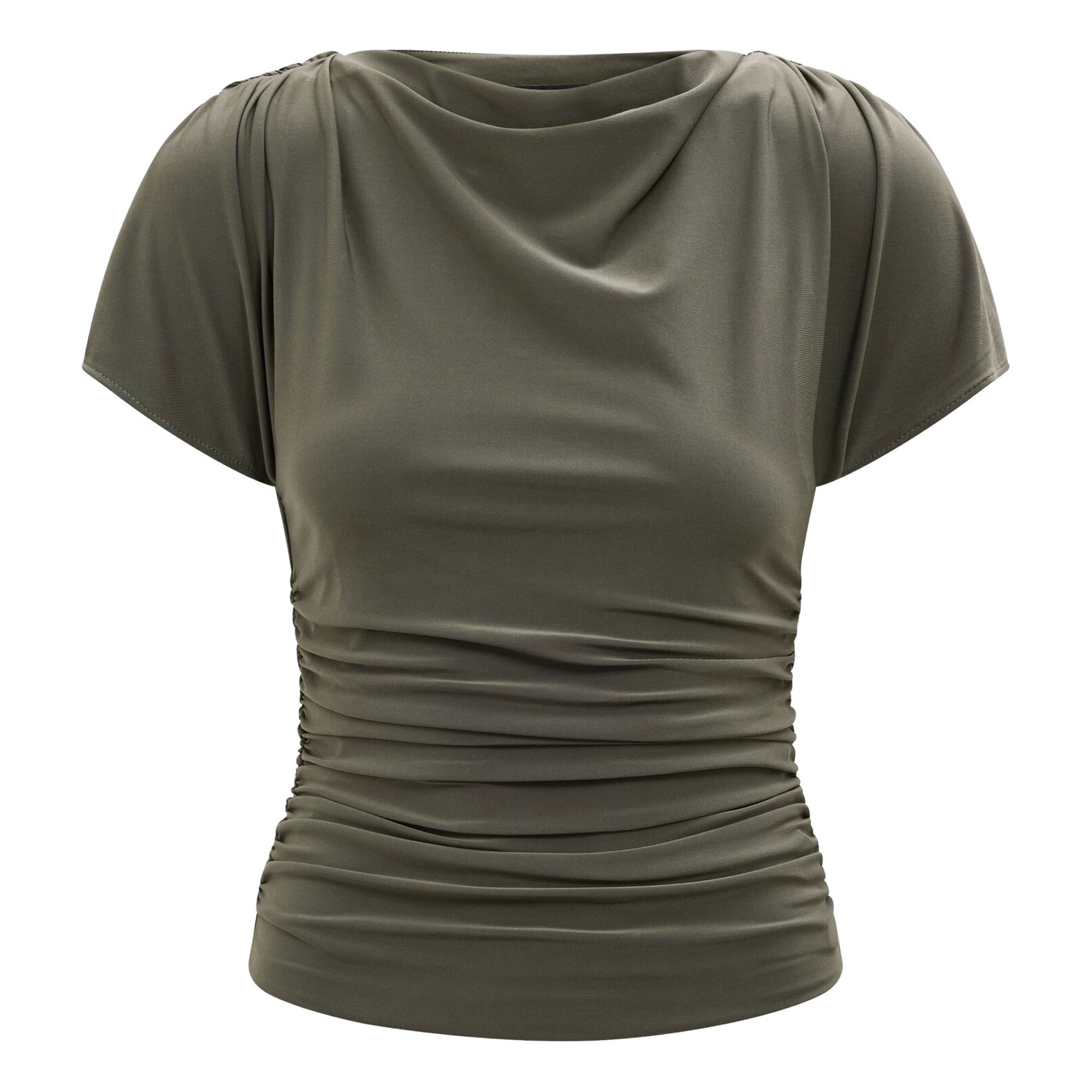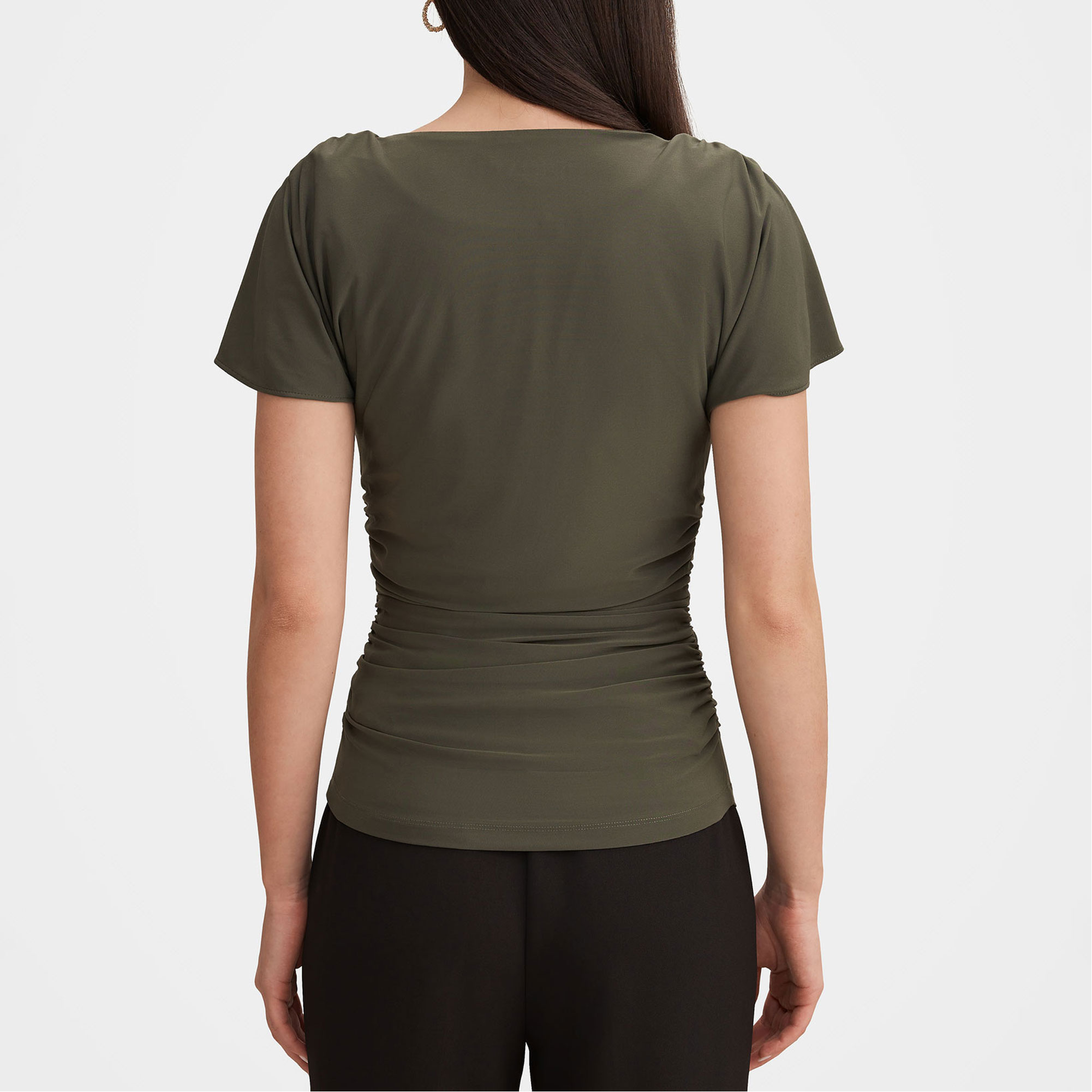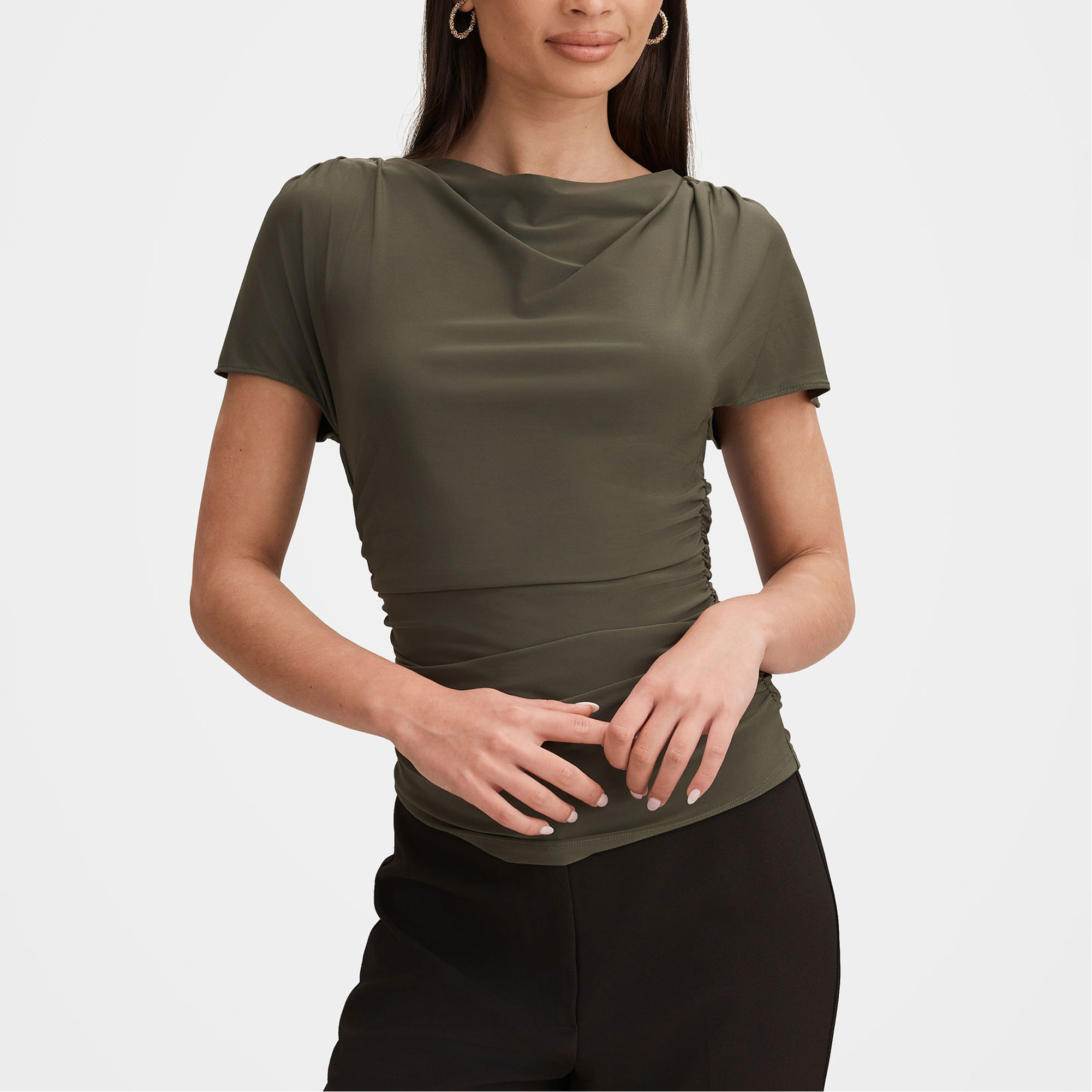 • Fitted silhouette, round neckline, short sleeves with side split, ruched at the waist, slip-on style, lined