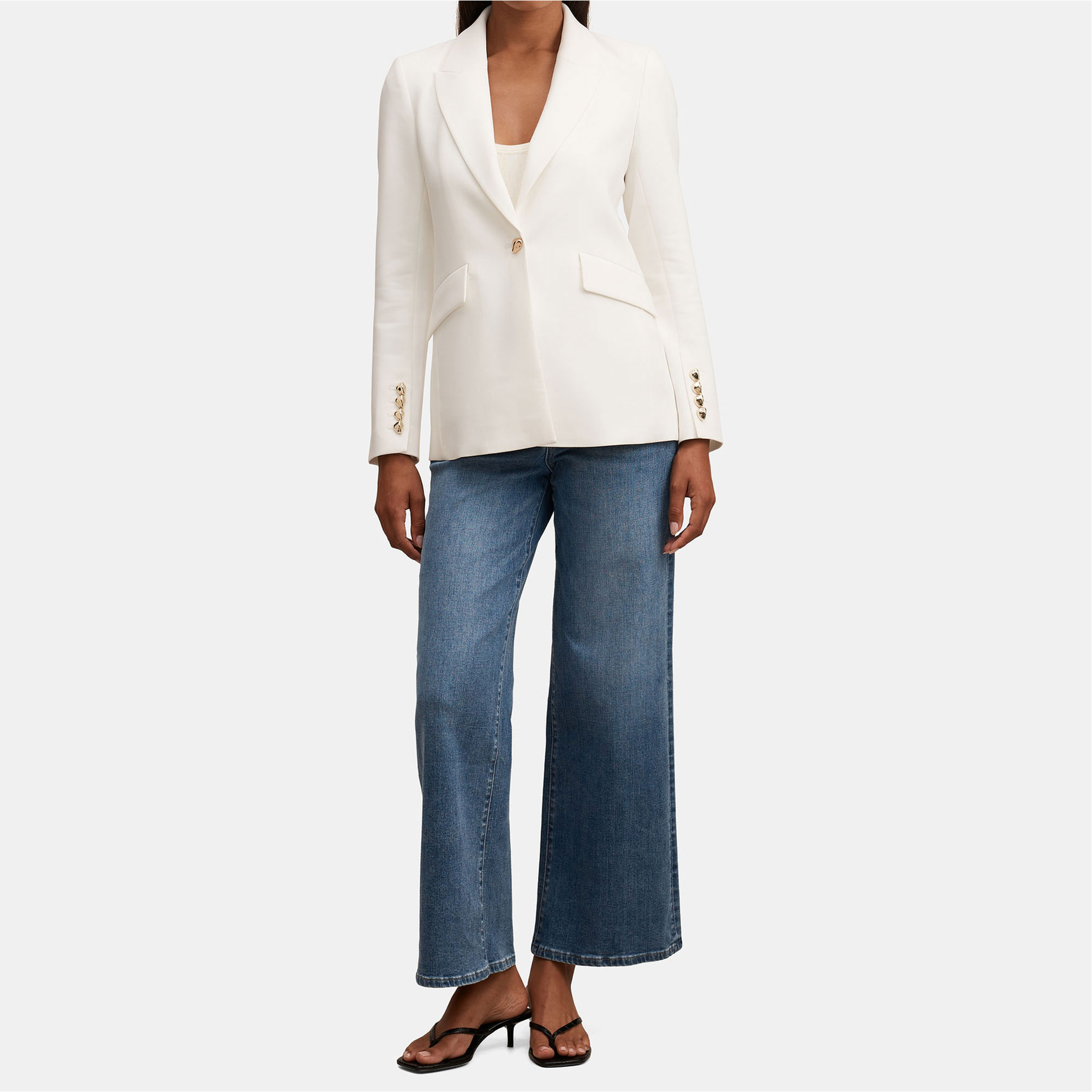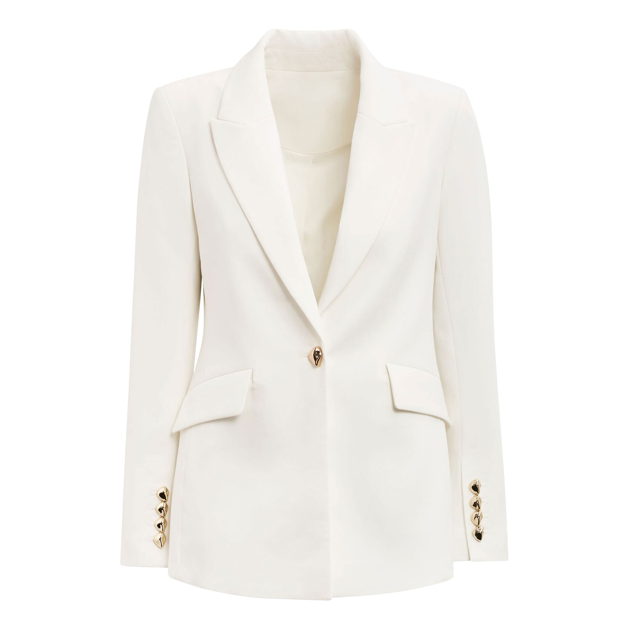 - Smooth woven fabrication, notched lapel collar, full-length sleeves, single-breasted front, flap pocket details, gold-tone buttoned cuffs, lined