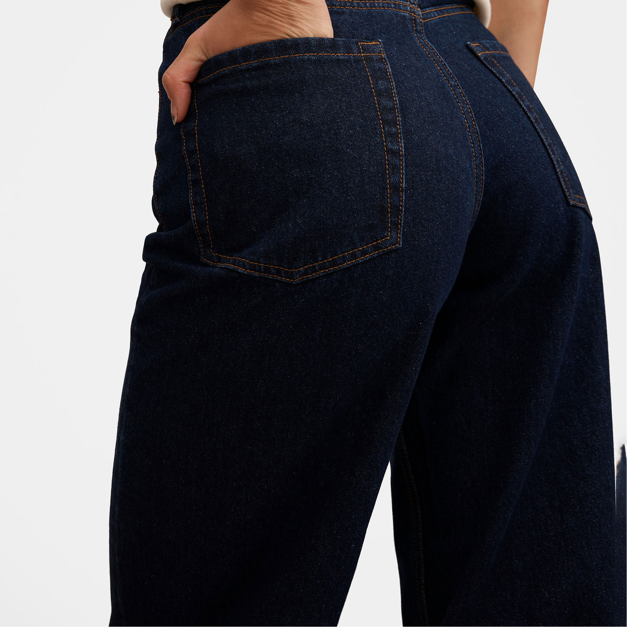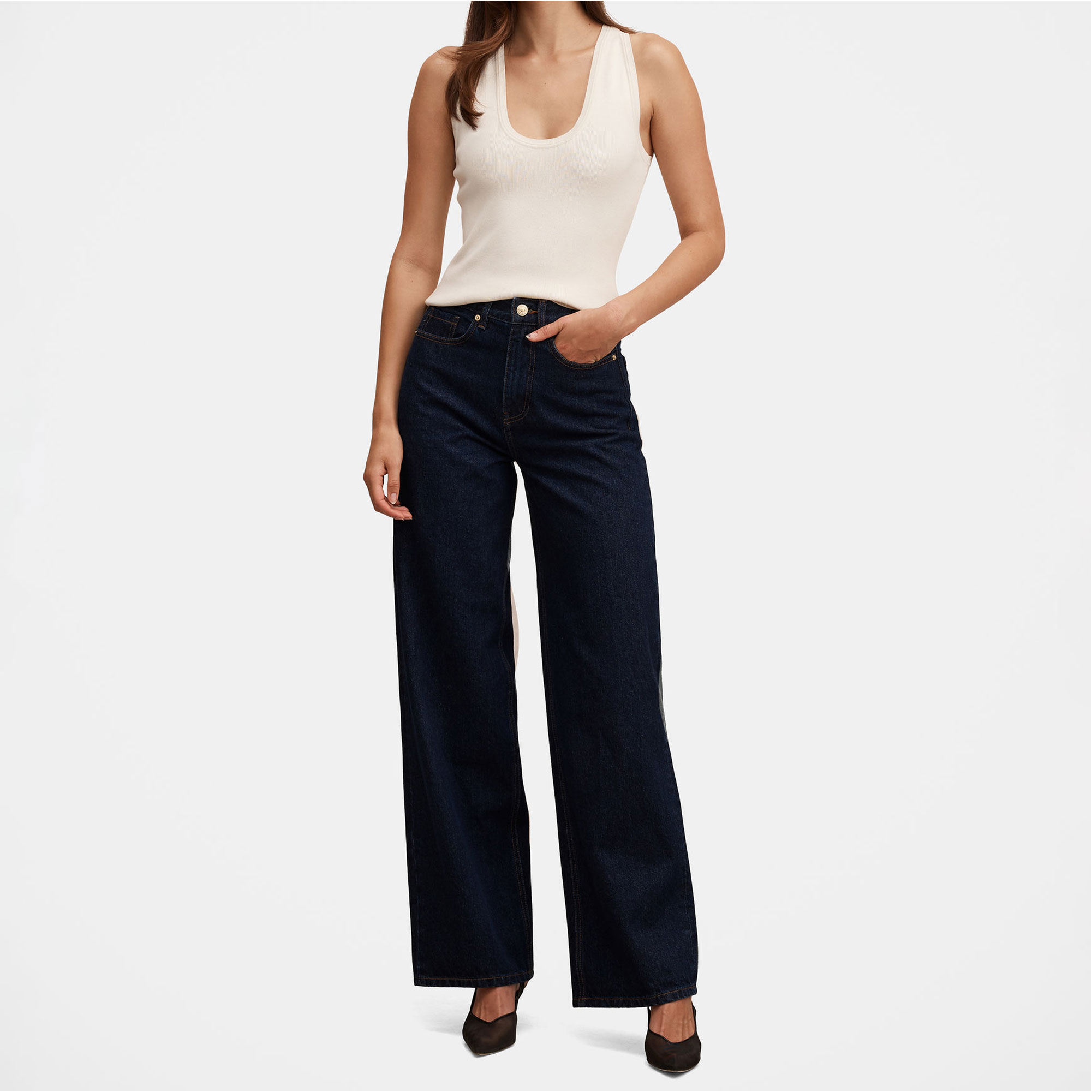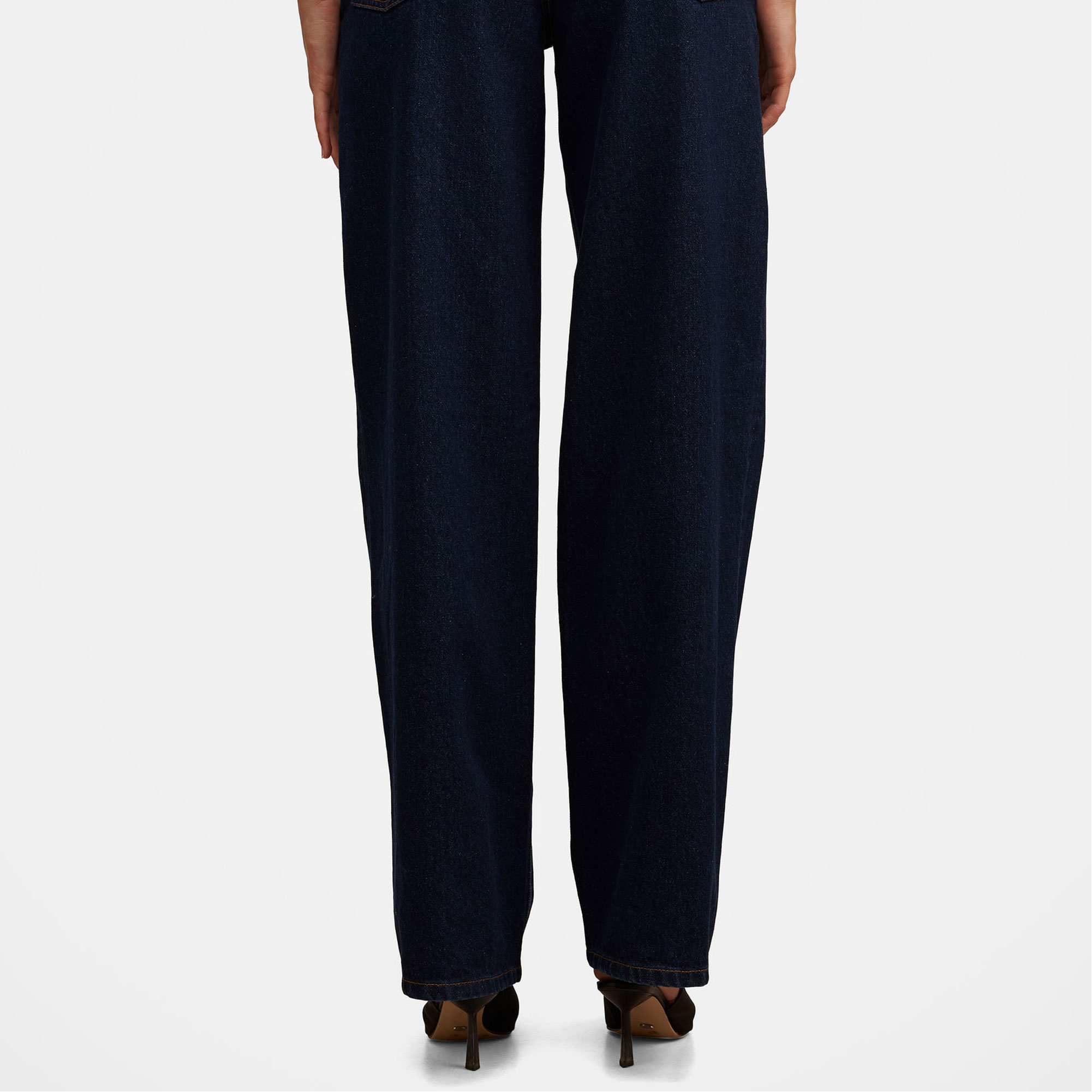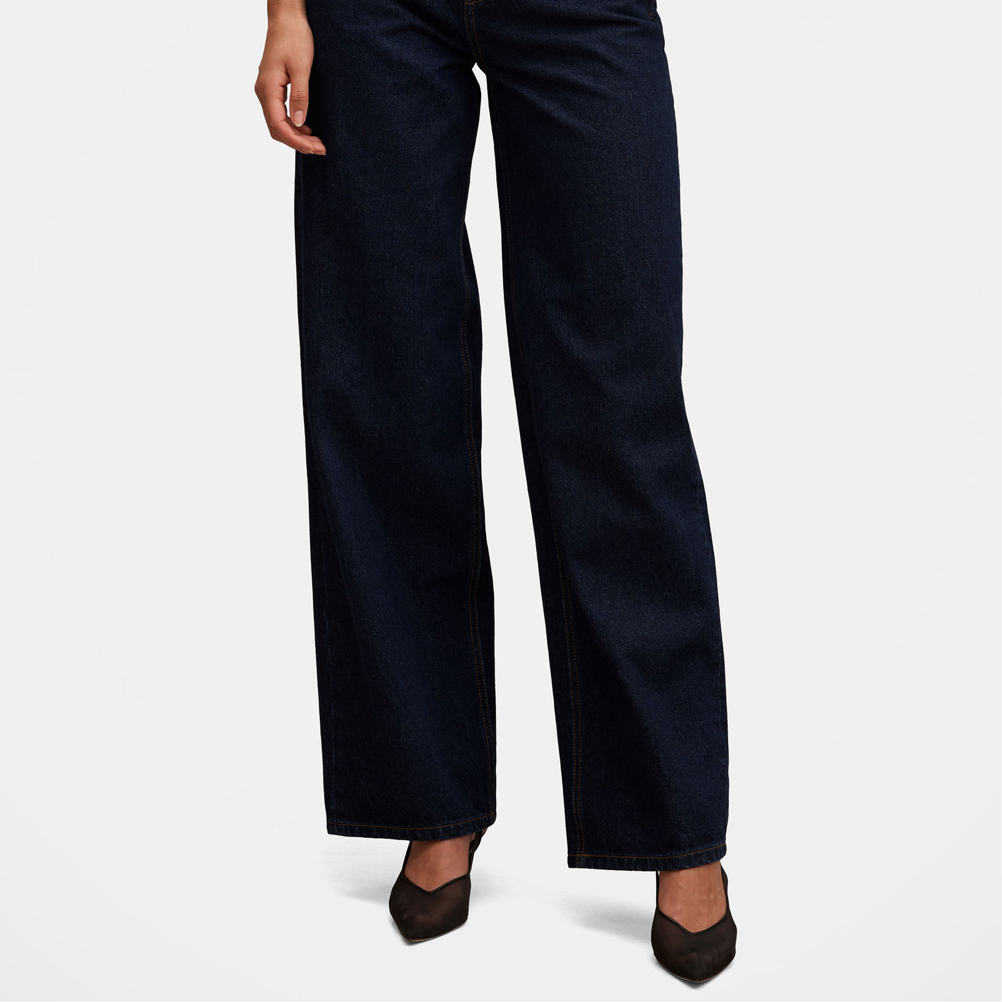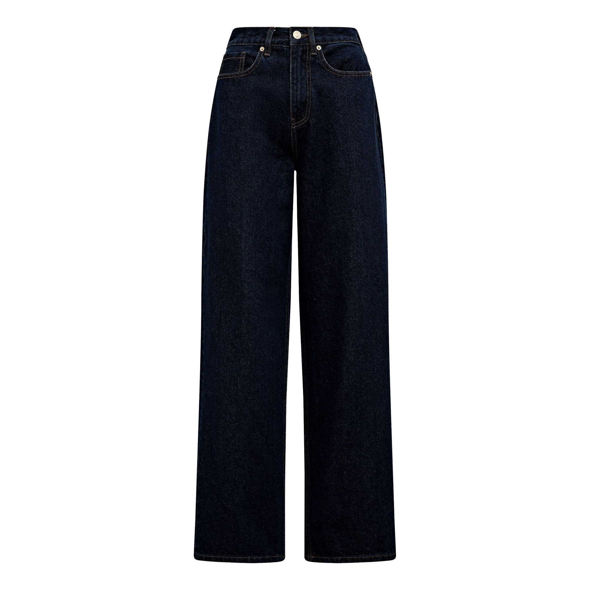 - Wide-leg silhouette, soft feel, stretch-fused denim fabrication, open hand side pockets, coin pocket, rear patch pockets, zip fly and button fastening, belt loops
