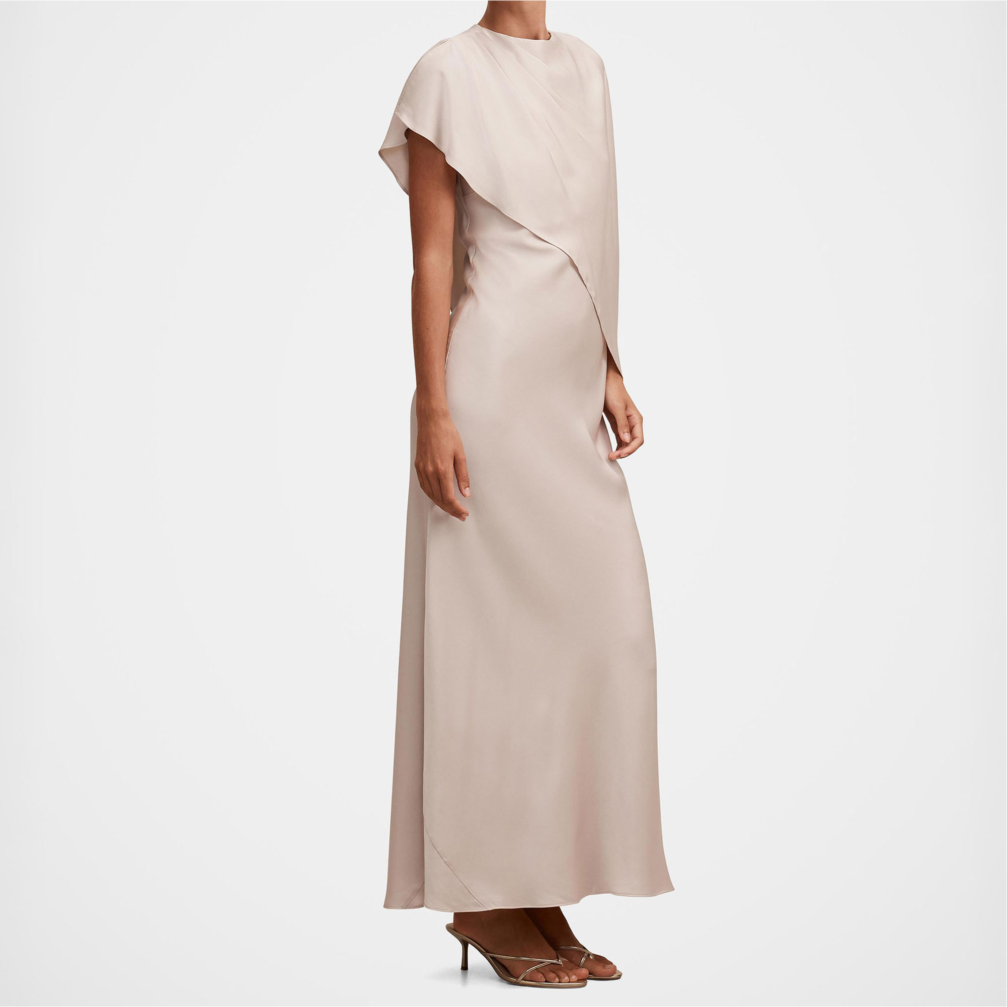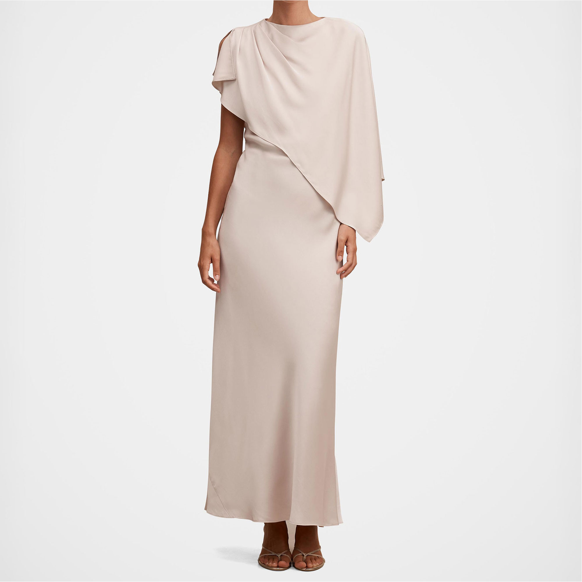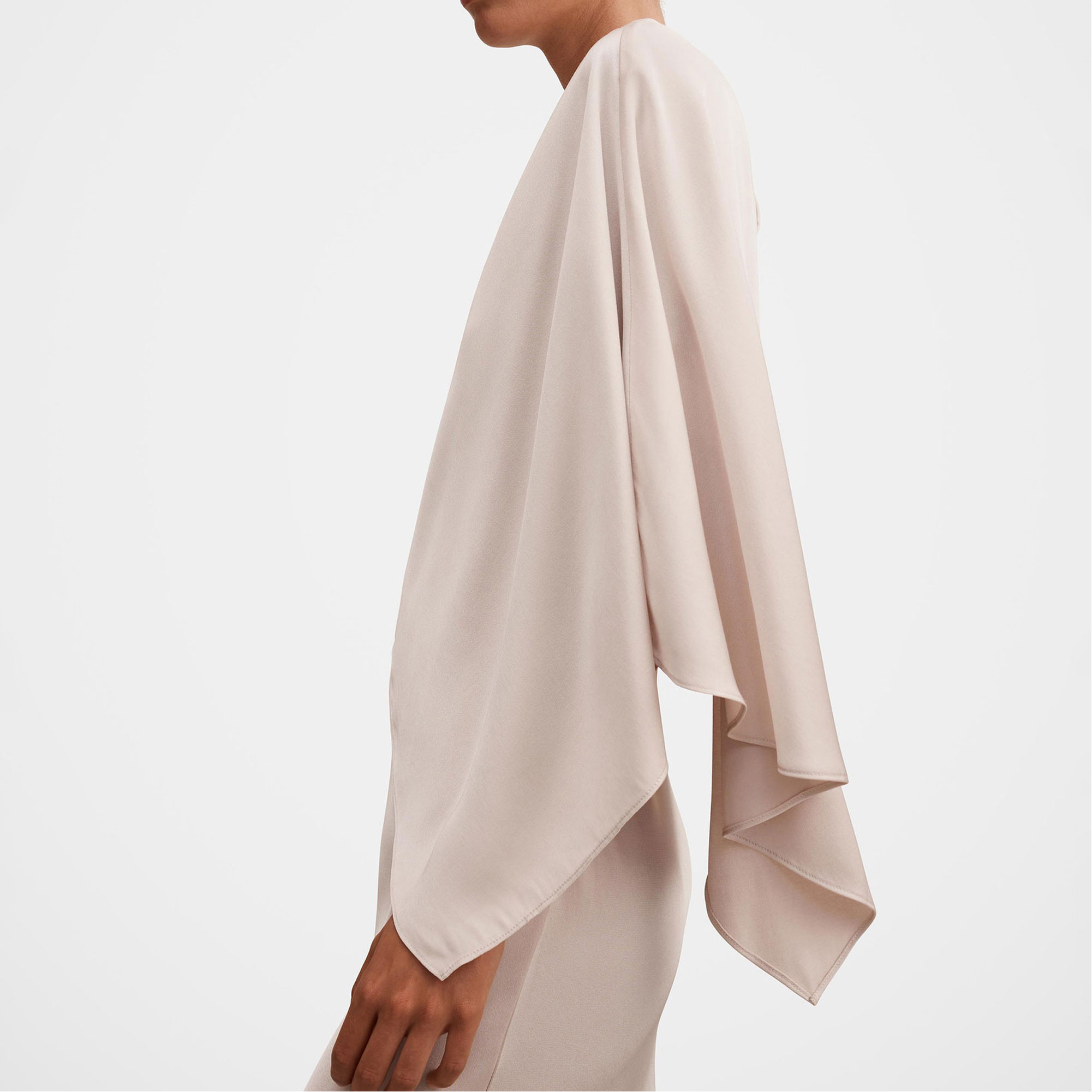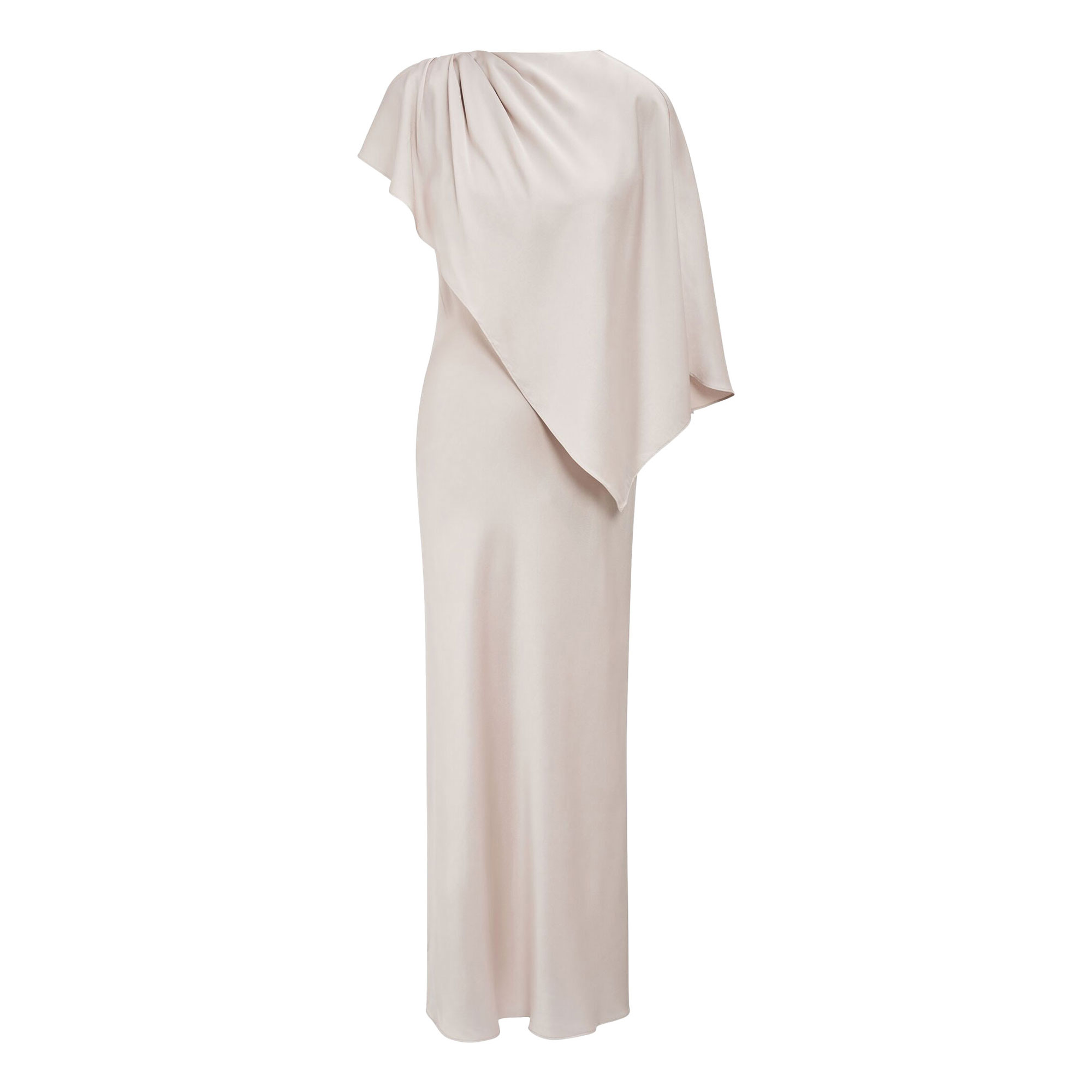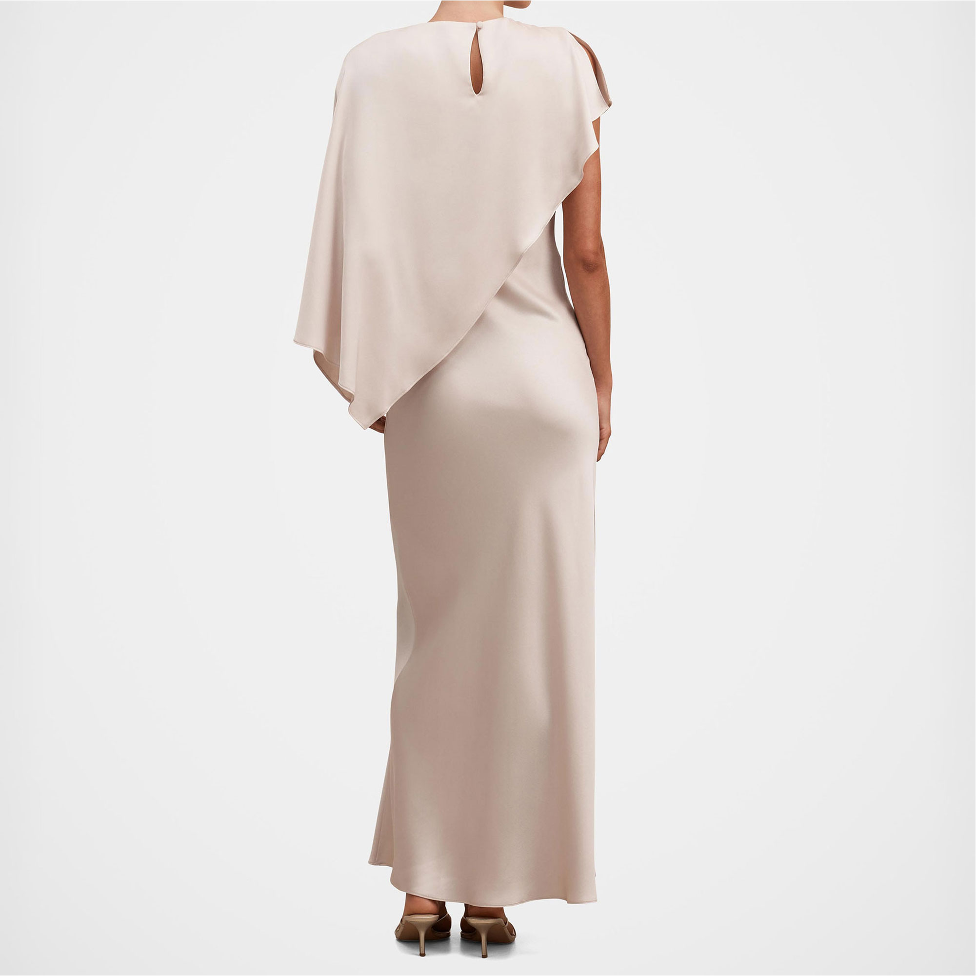 - Maxi length, cape detail, satin fabrication, column skirt, grown-on crew neckline, shoulder tucks at the shoulder, button and loop fastening, concealed zip fastening, lined