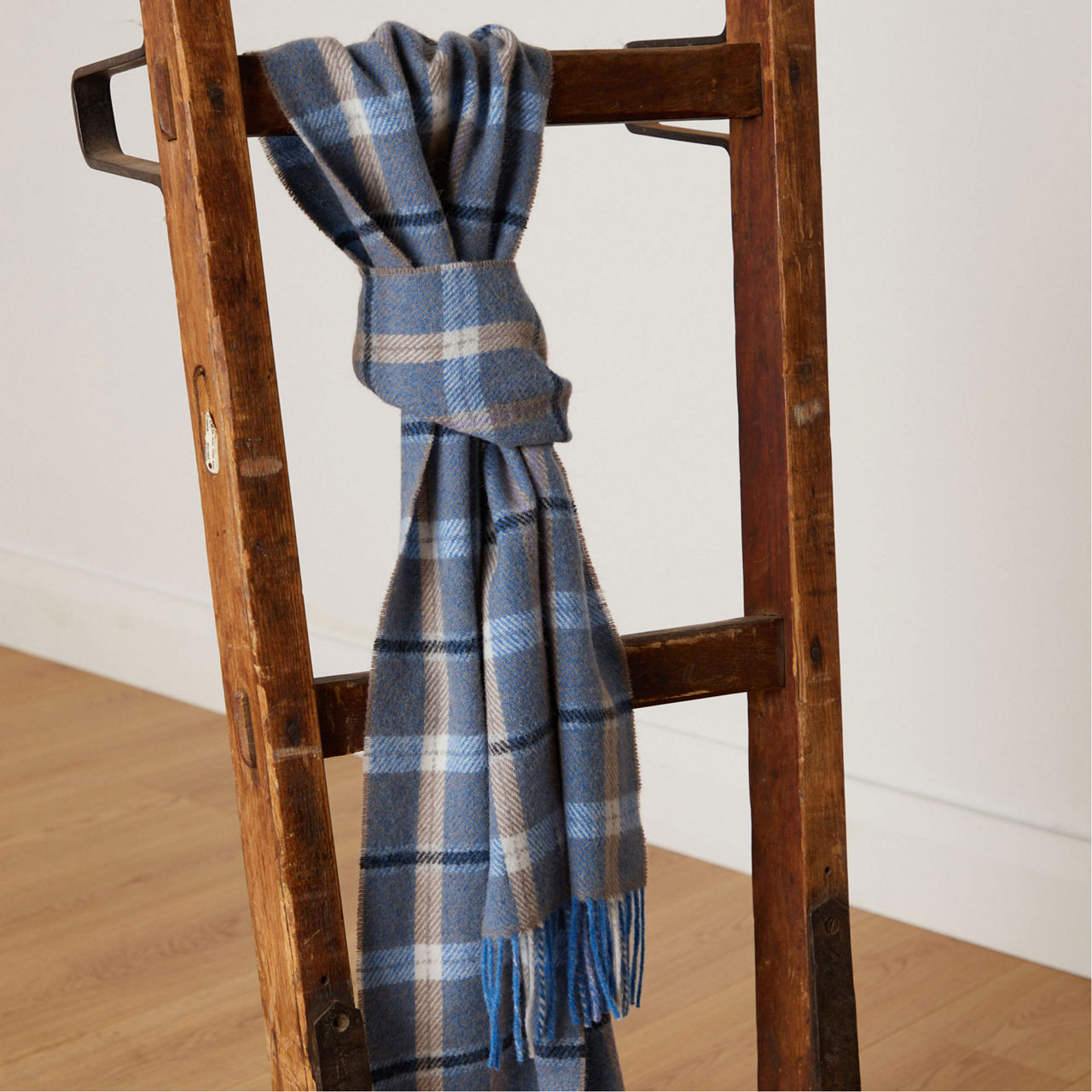 This scarf from FOXFORD is woven with soft lambswool and features a classic blue and mink check pattern, making it a must-have accessory for staying warm and stylish in the spring months.