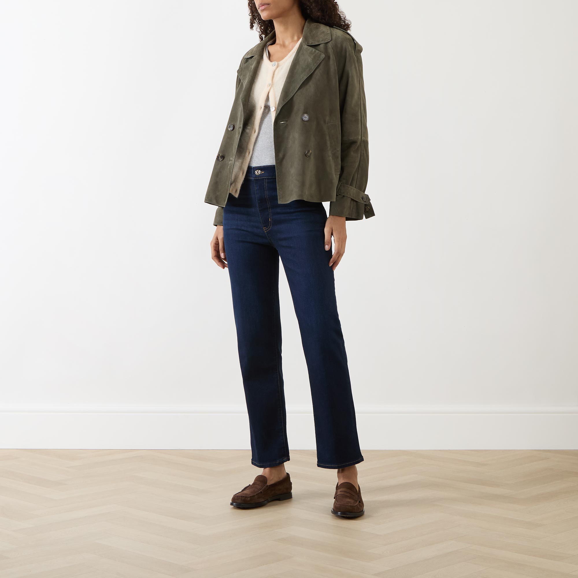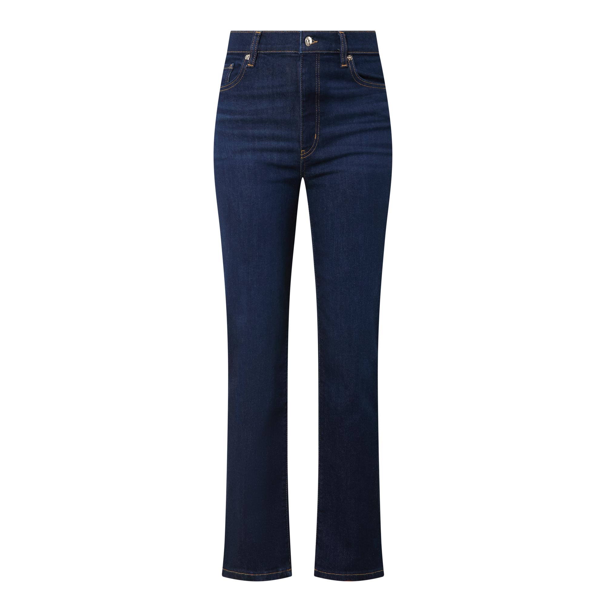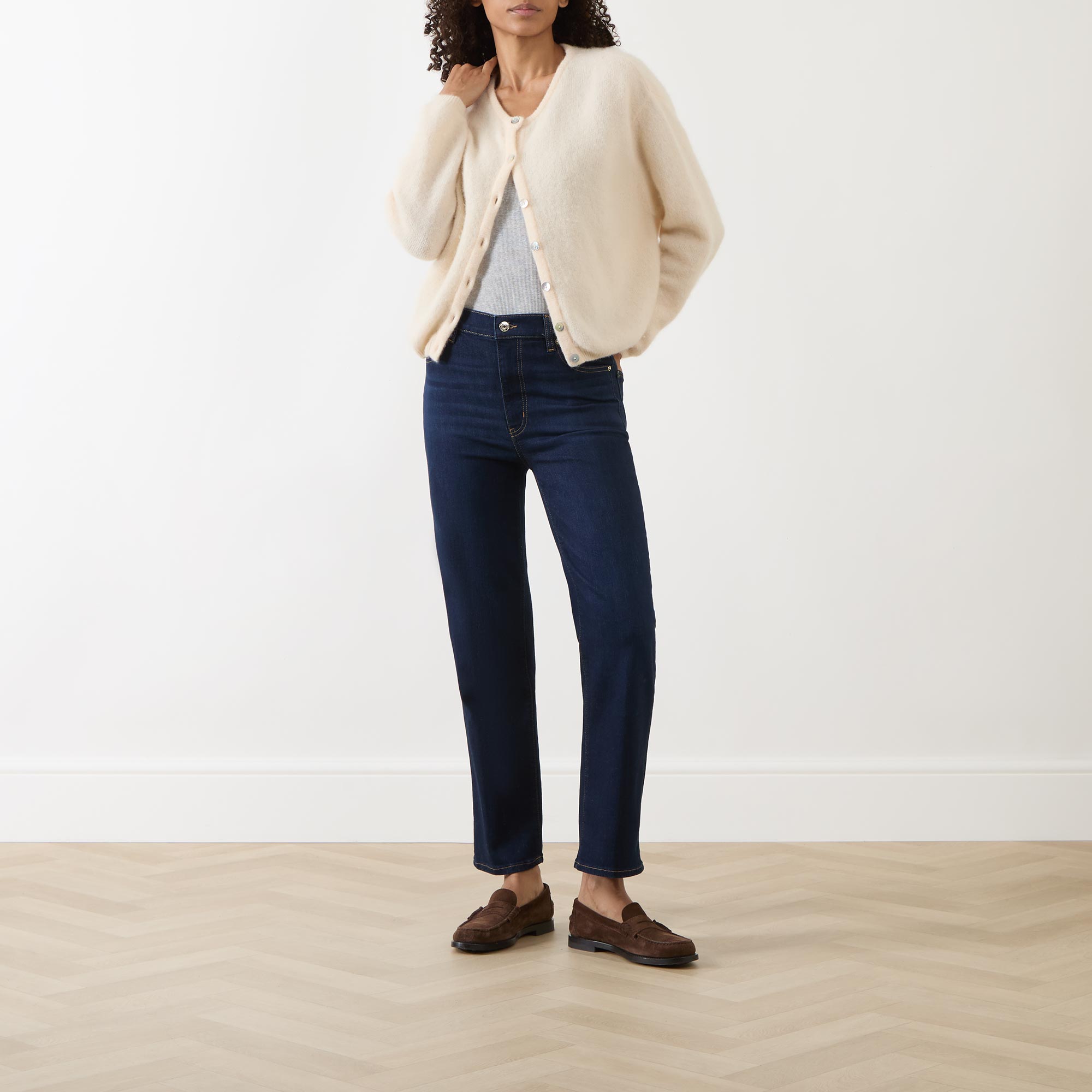 - High rise, straight leg, belt loops, zip-fly and button fastening, five-pocket design, clean hems, tonal stitching, dark wash finish, relaxed silhouette