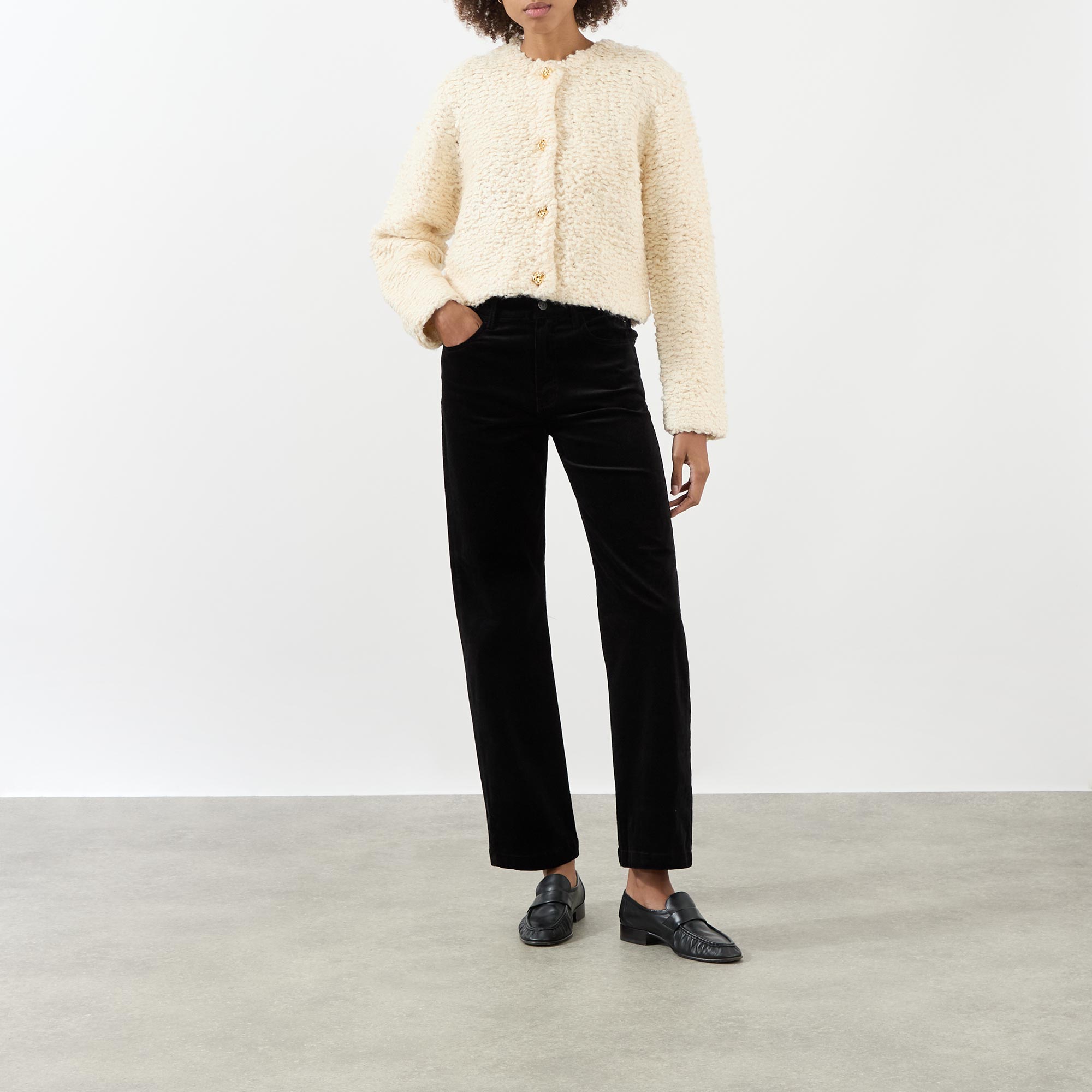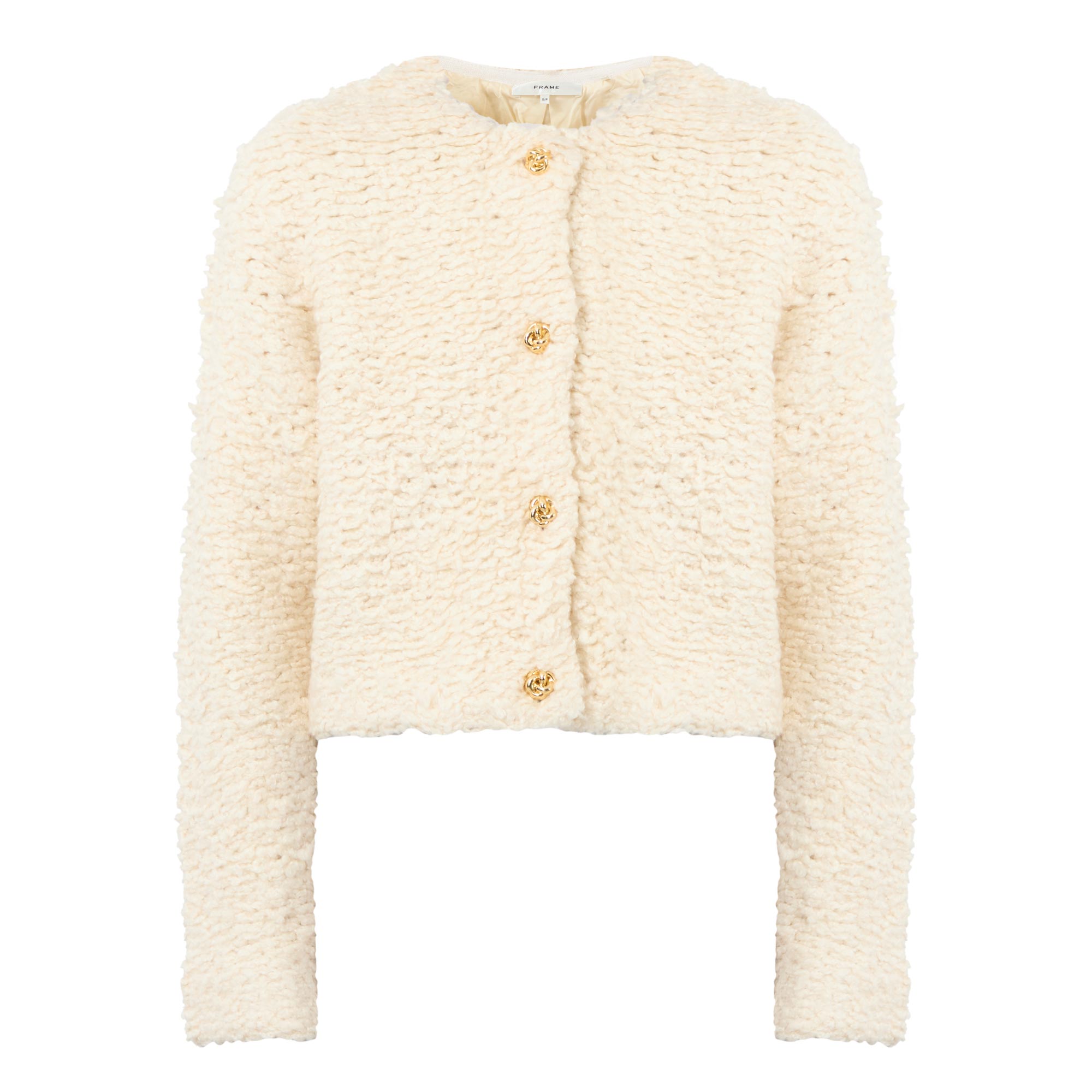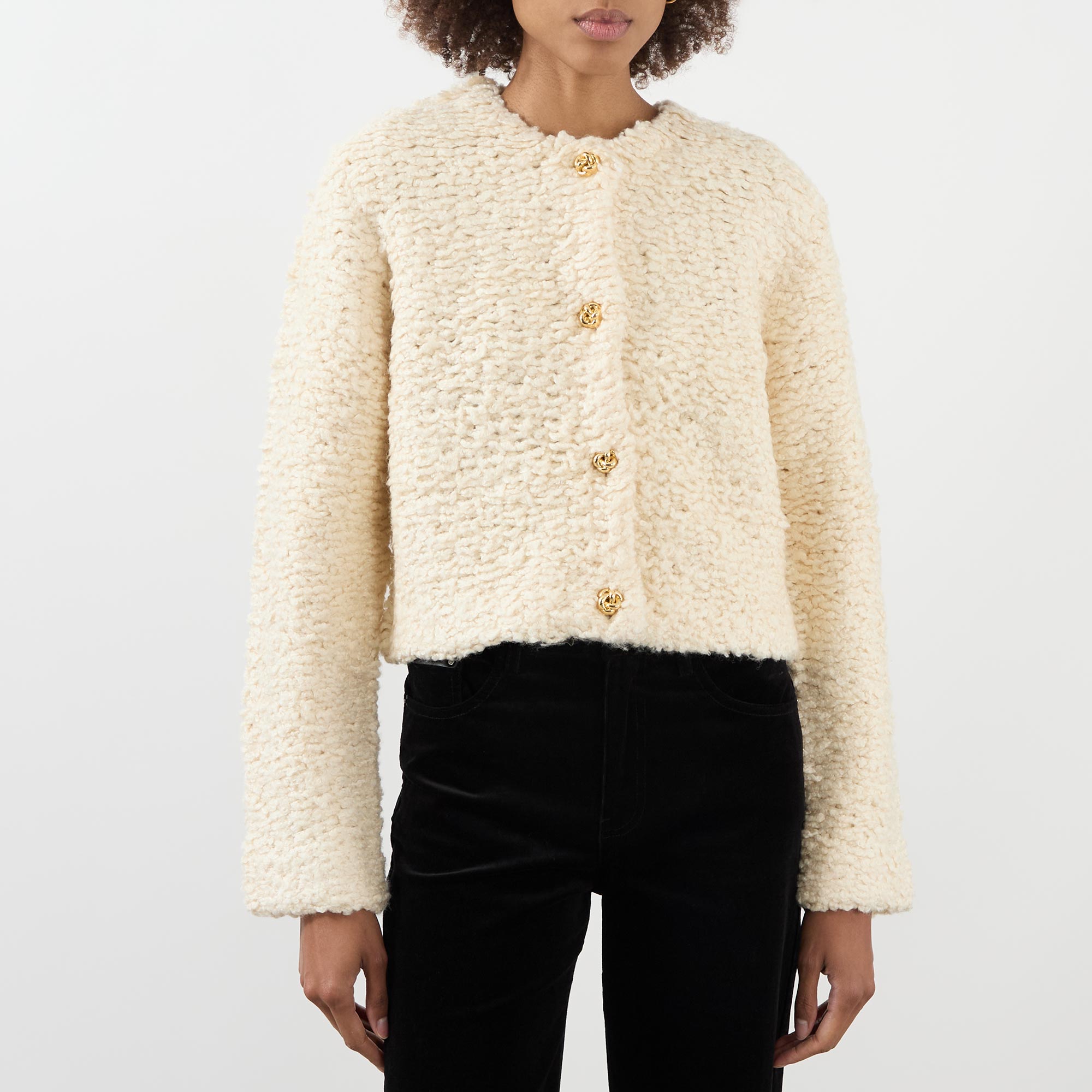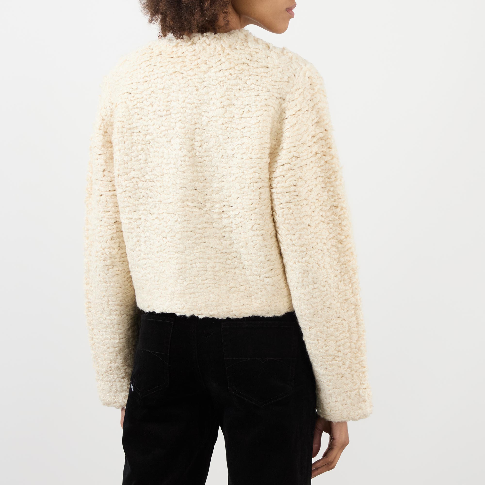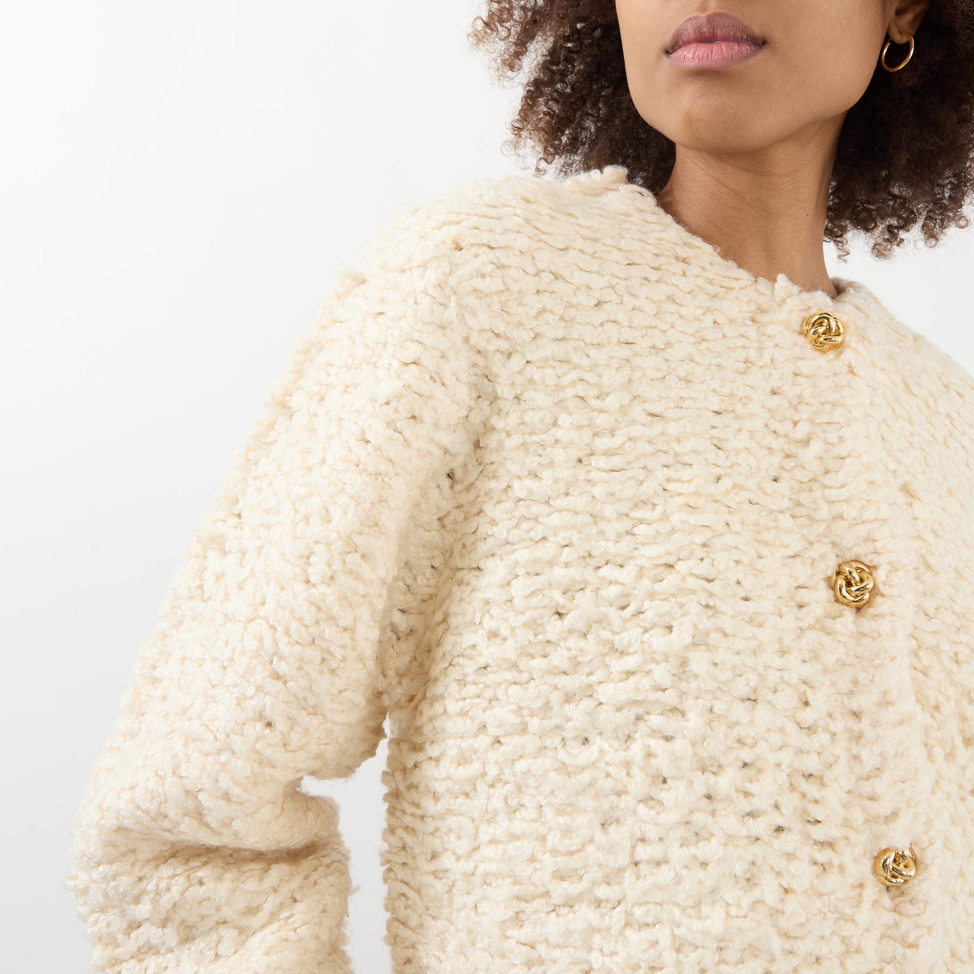• High round neckline, dropped shoulders, long sleeves, front button fastening, straight hem, cropped length, highly textured knit, soft voluminous finish
