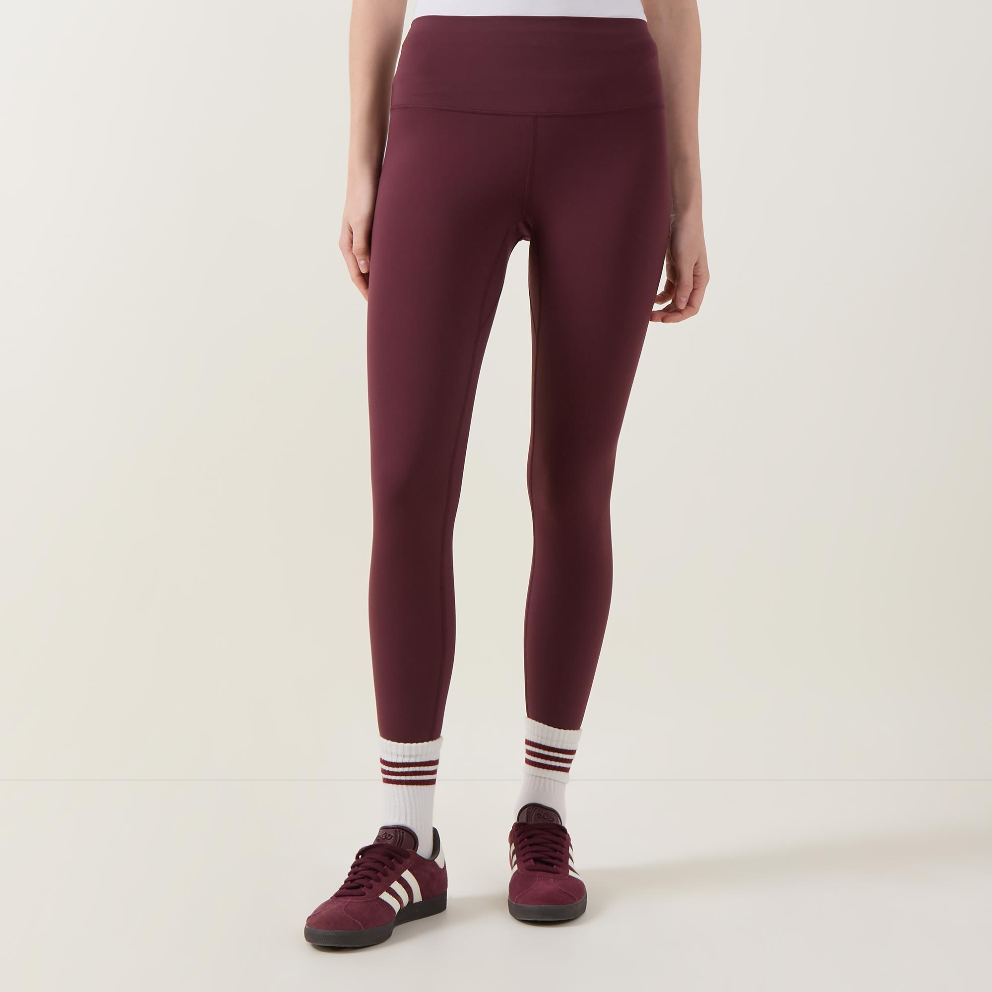 • High-rise, rolled waistband, tapered inseam panel, four-way stretch, moisture-wicking, light compression, FreeSoft™ fabric, buttery soft finish