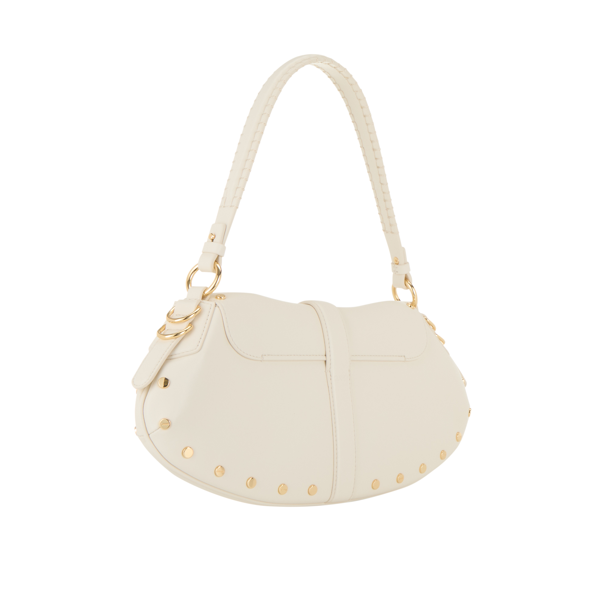 • Flap closure, butterfly logo detail, fixed shoulder strap, curved silhouette, side D-ring details, stud detailing, gold-tone hardware