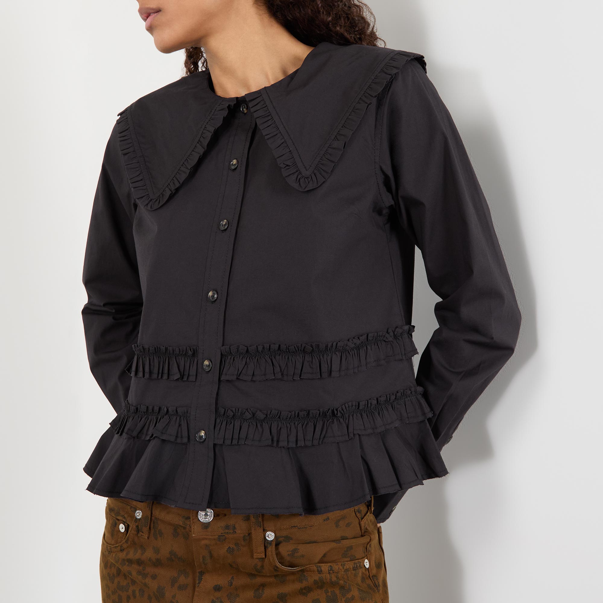- Oversized point collar, long sleeves, front button placket, ruched trim, peplum hemline, double-button cuffs, smooth fabric