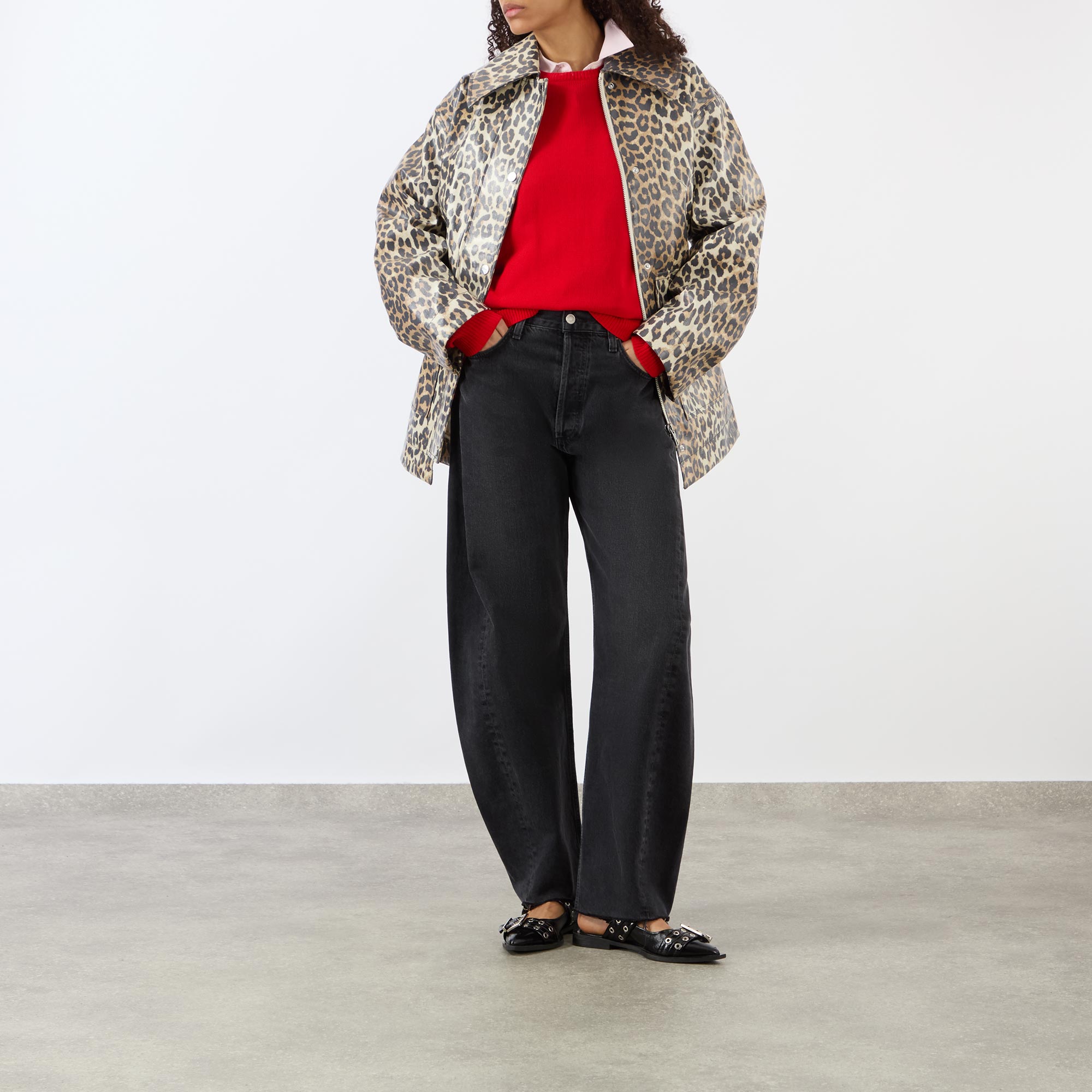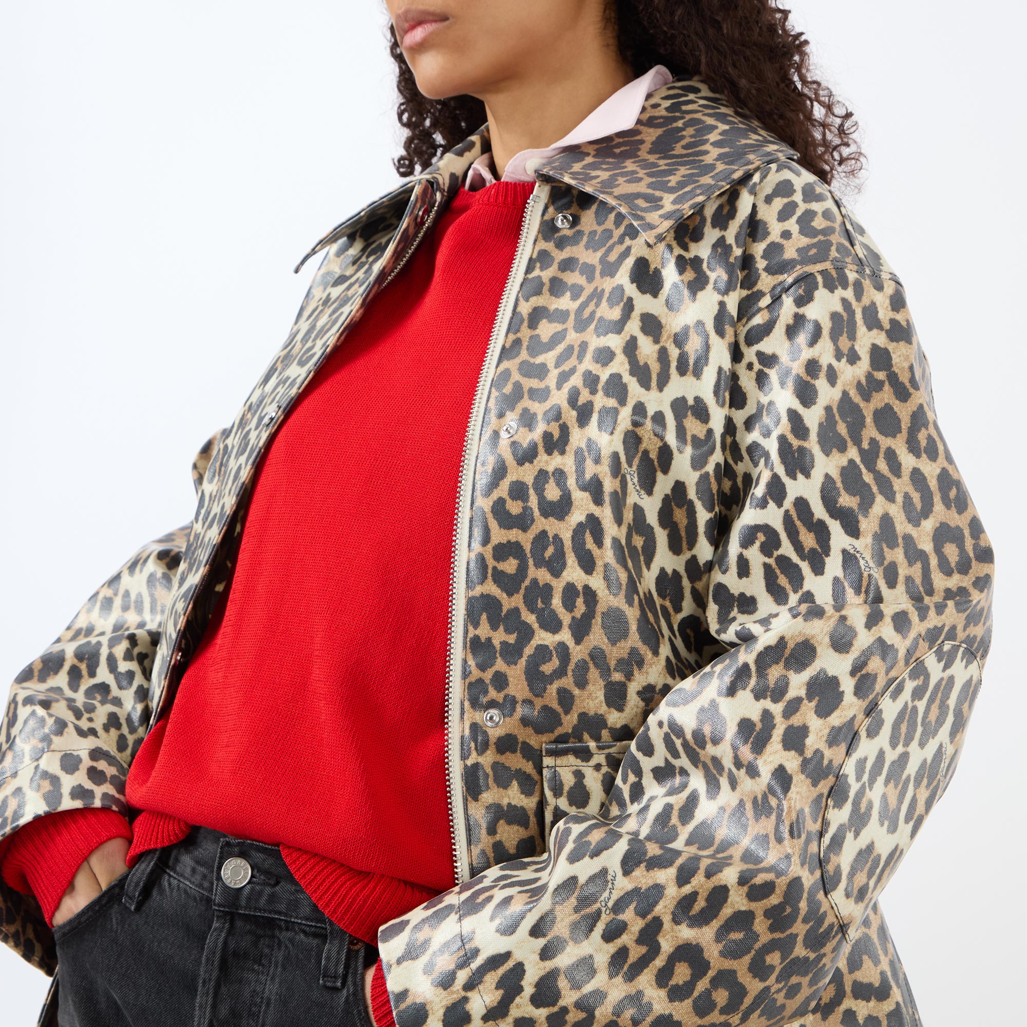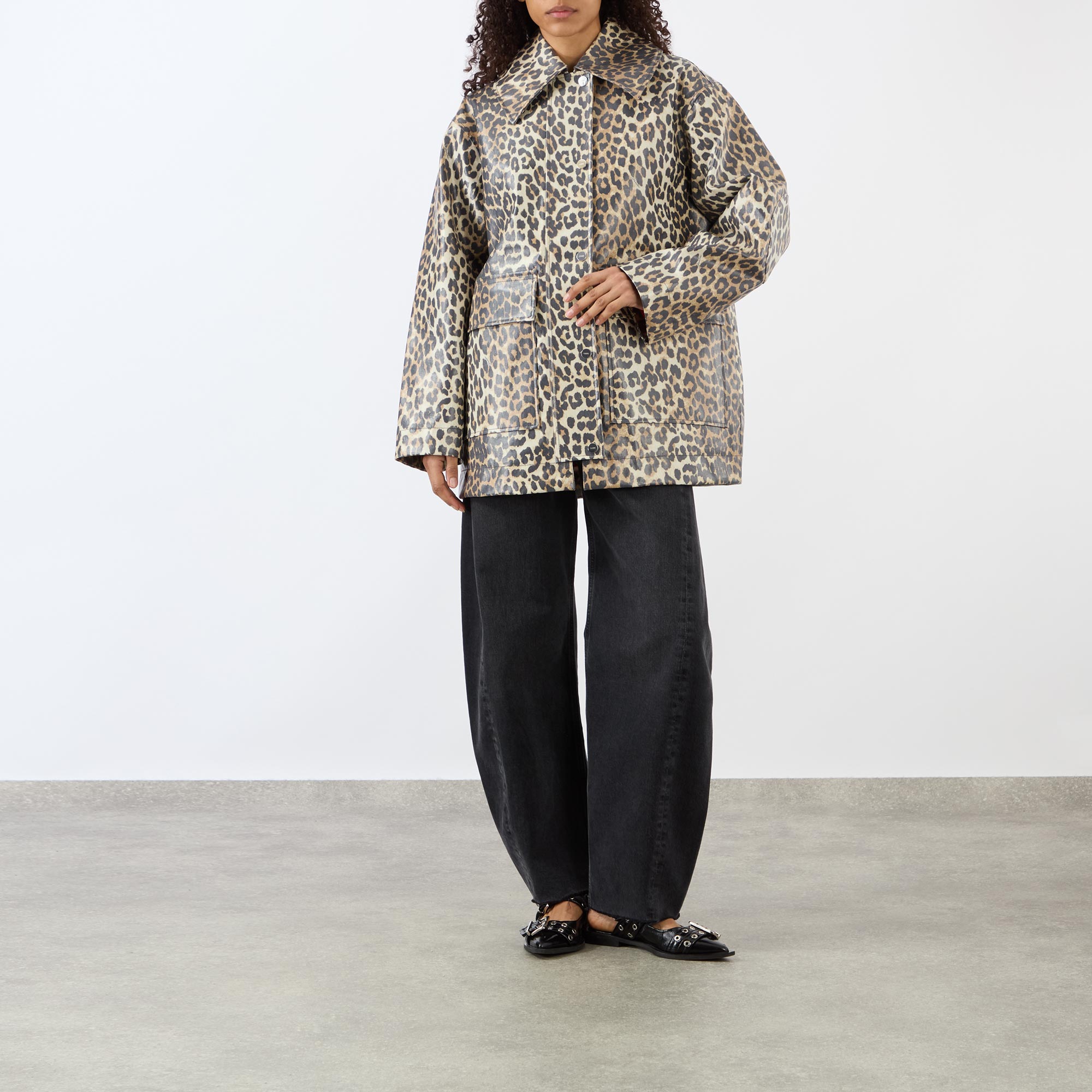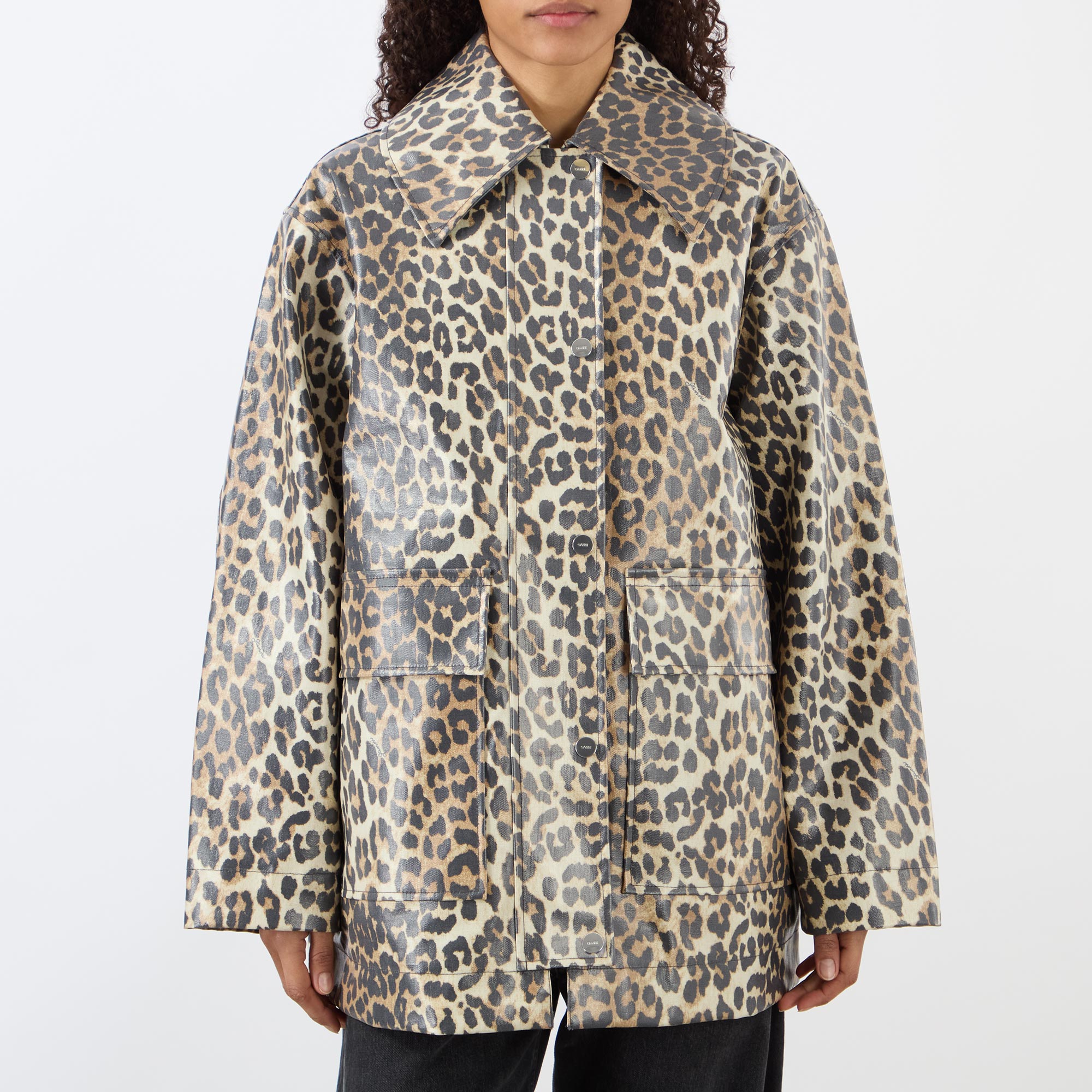 - Exaggerated collar, dropped shoulders, long sleeves, front zip fastening, additional snap button placket, two large front flap pockets, straight hem, rear knife pleat, leopard print pattern, laminated finish