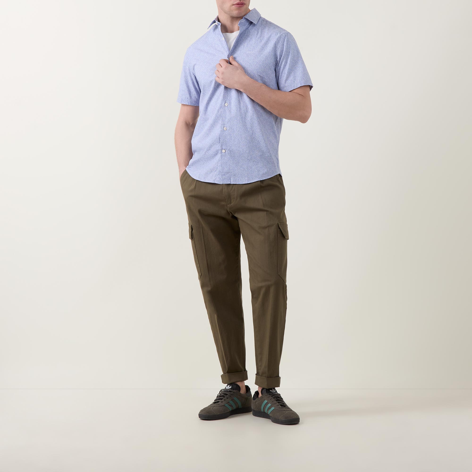 - Point collar, short sleeves, front button fastening, curved hem, rear box pleat, locker loop, embroidered logo lettering on the chest, all over micro print