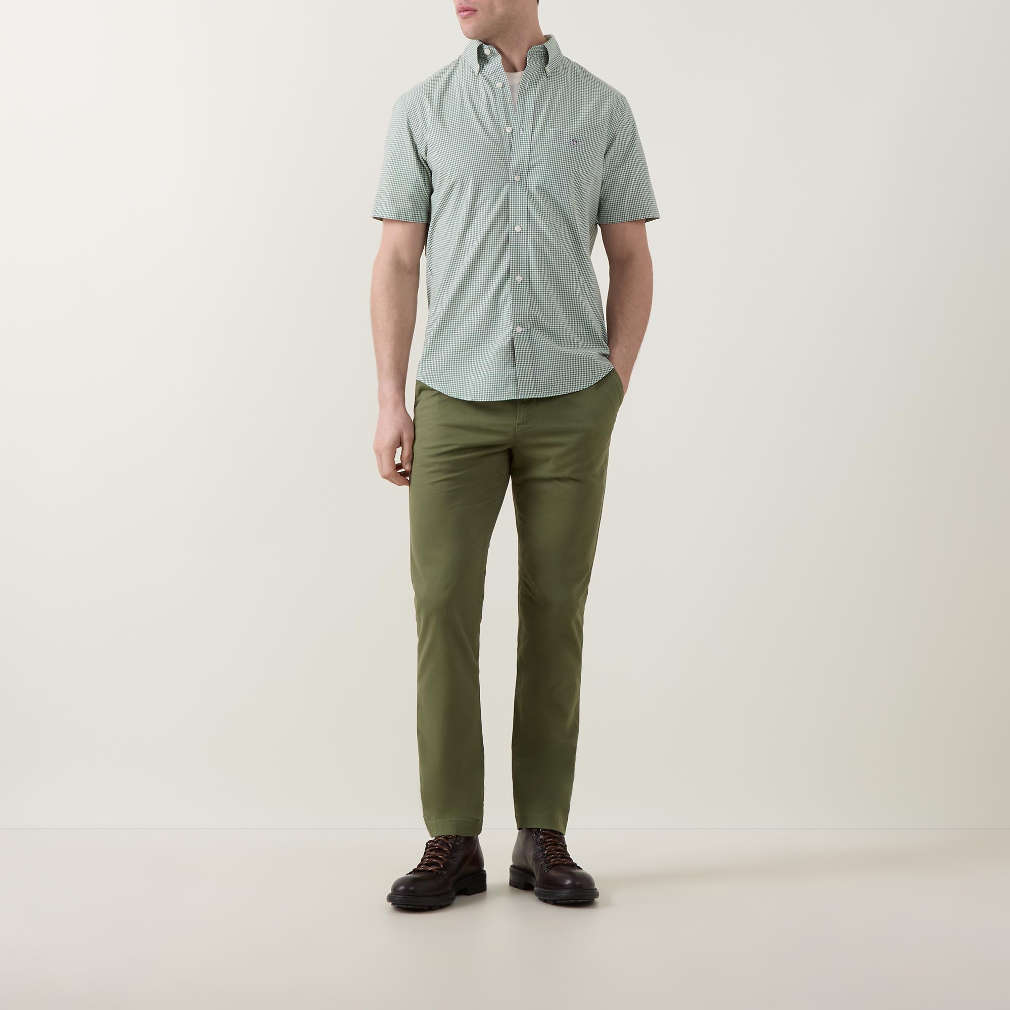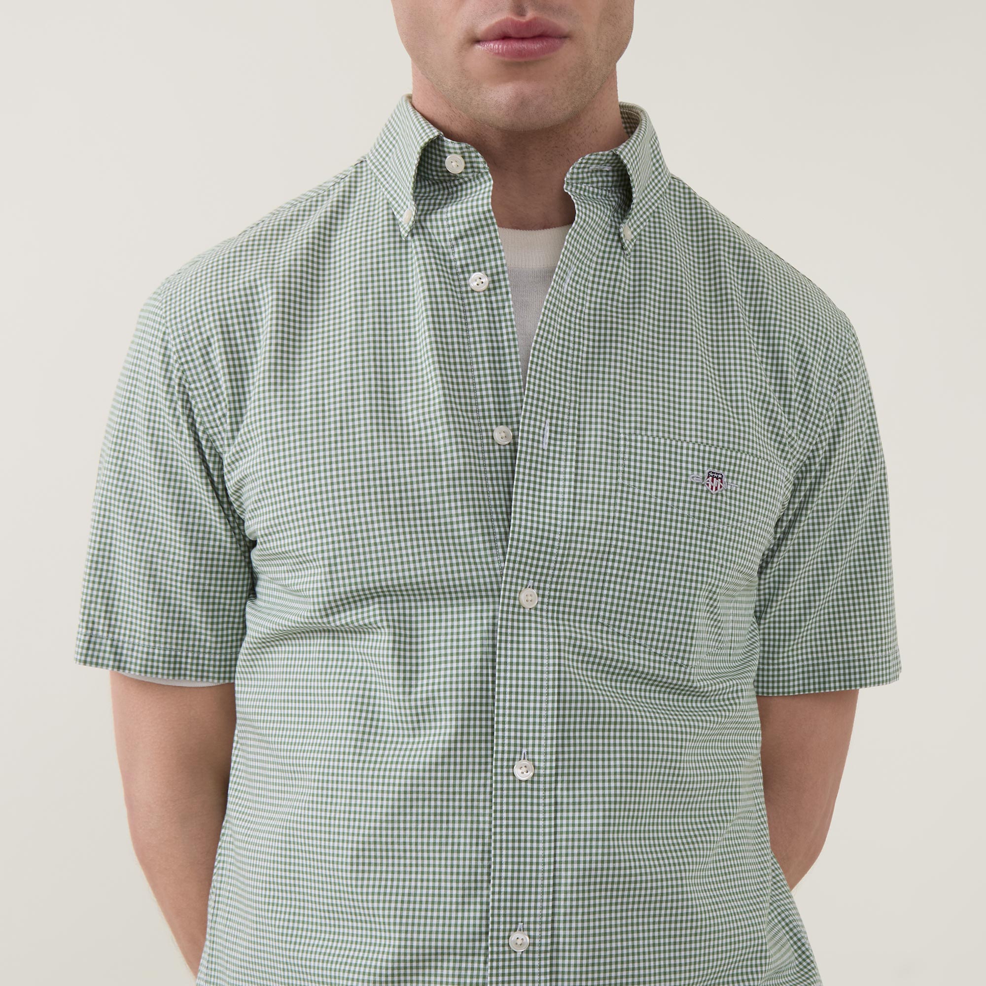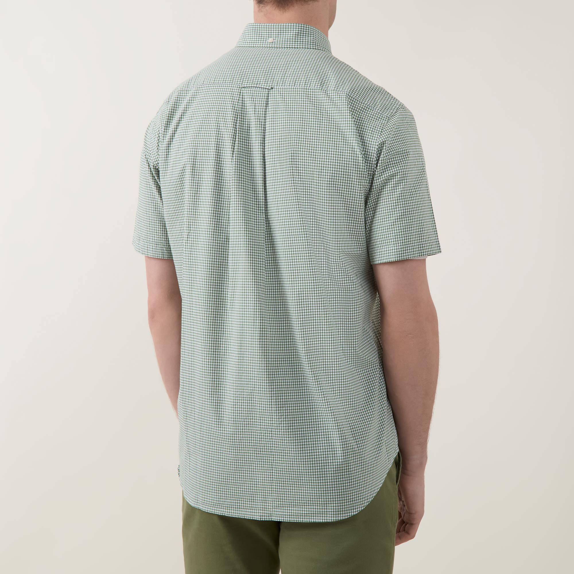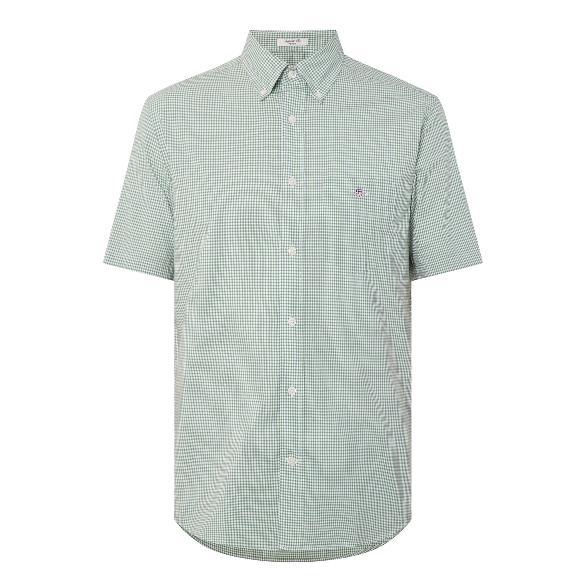 - Button down point collar, short sleeves, one chest patch pocket, front button fastening, curved hem, rear box pleat, locker loop, Shield logo embroidery on the chest, gingham pattern
