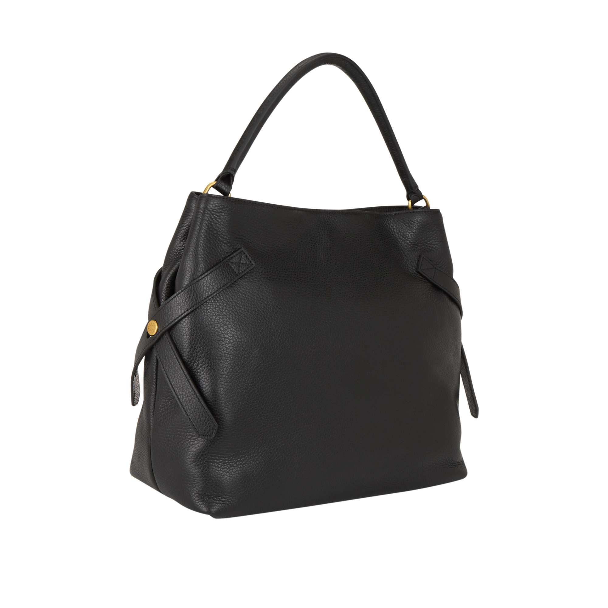 - Top shoulder strap, detachable adjustable strap, snap-button closure, gold-tone hardware, front logo branding, side strap details, grained leather finish