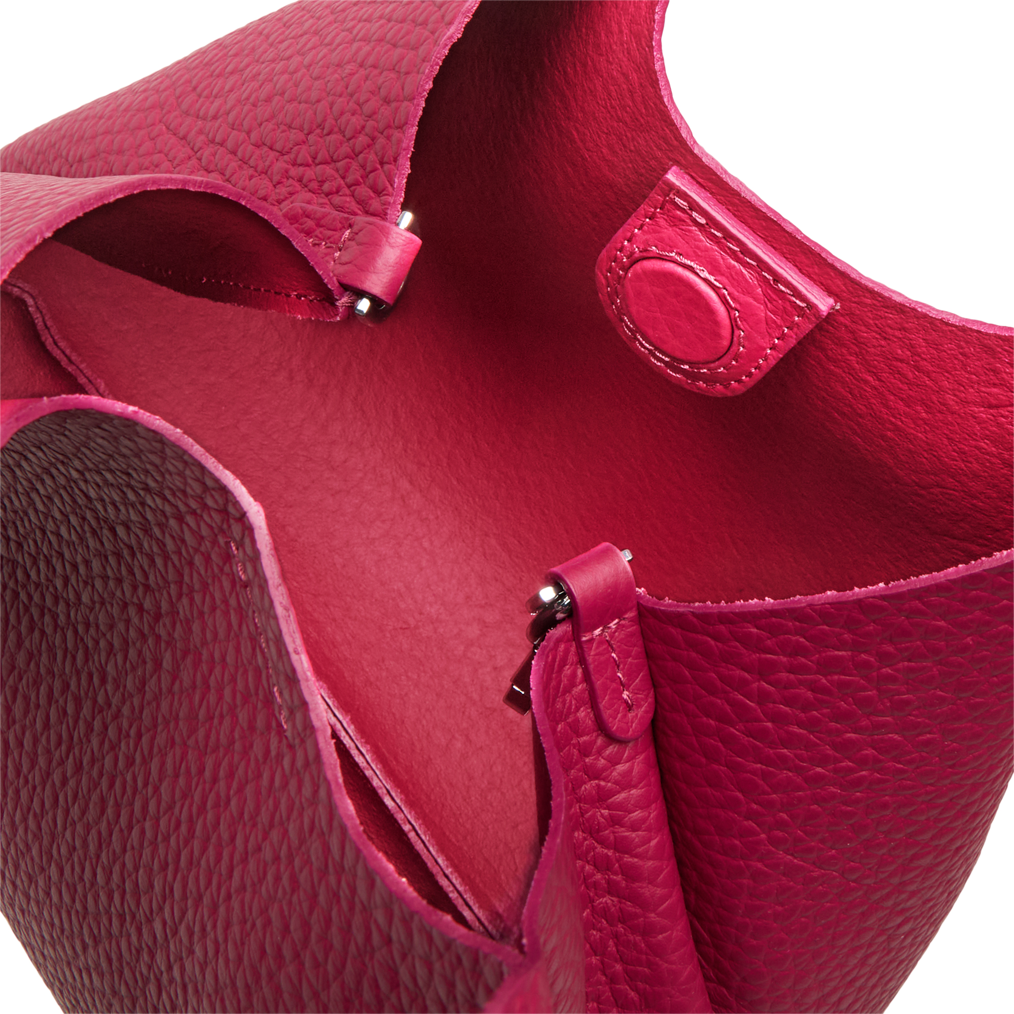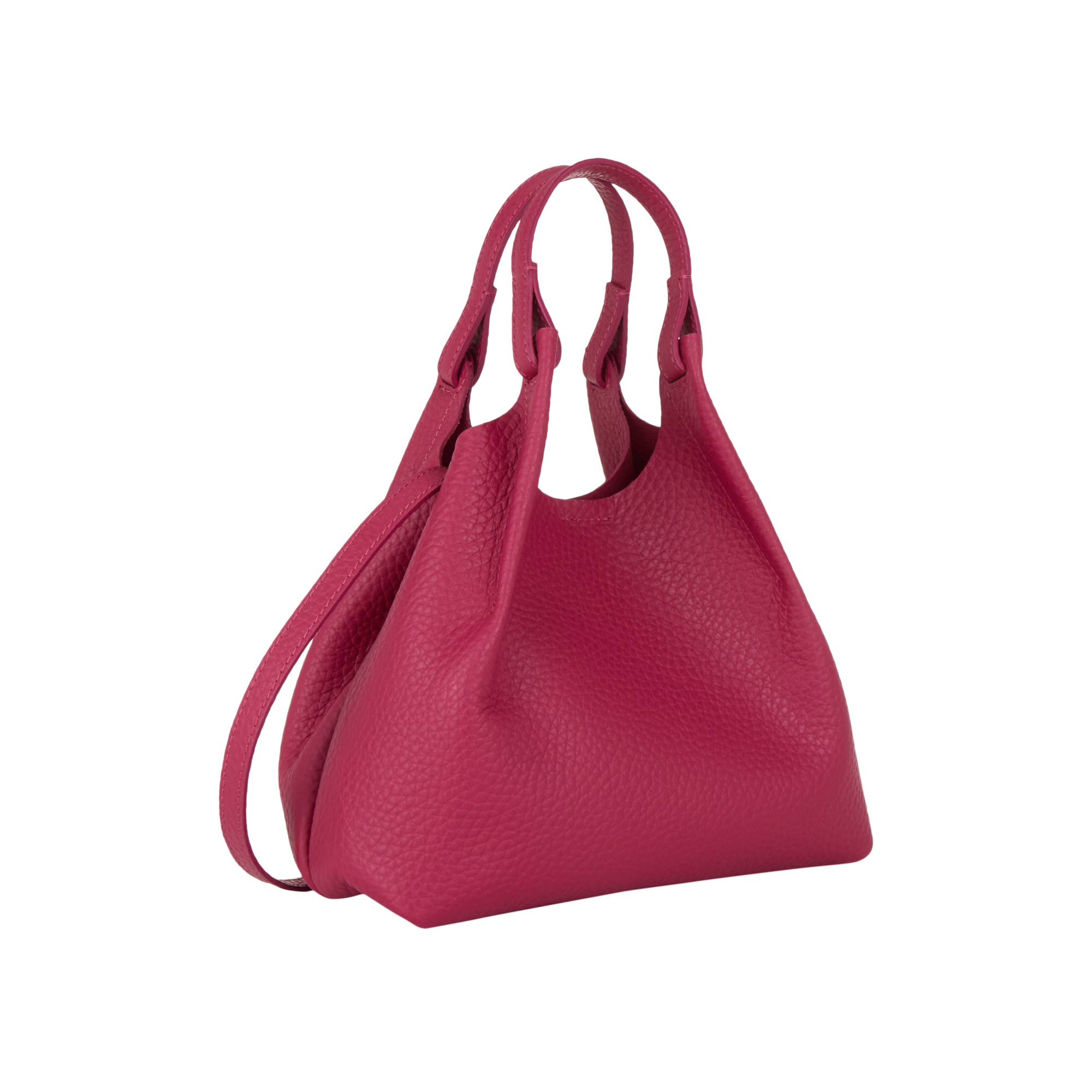 - Two top carry handles, removable adjustable shoulder strap, magnetic snap-button closure, slouchy design, front logo branding, grained leather finish
