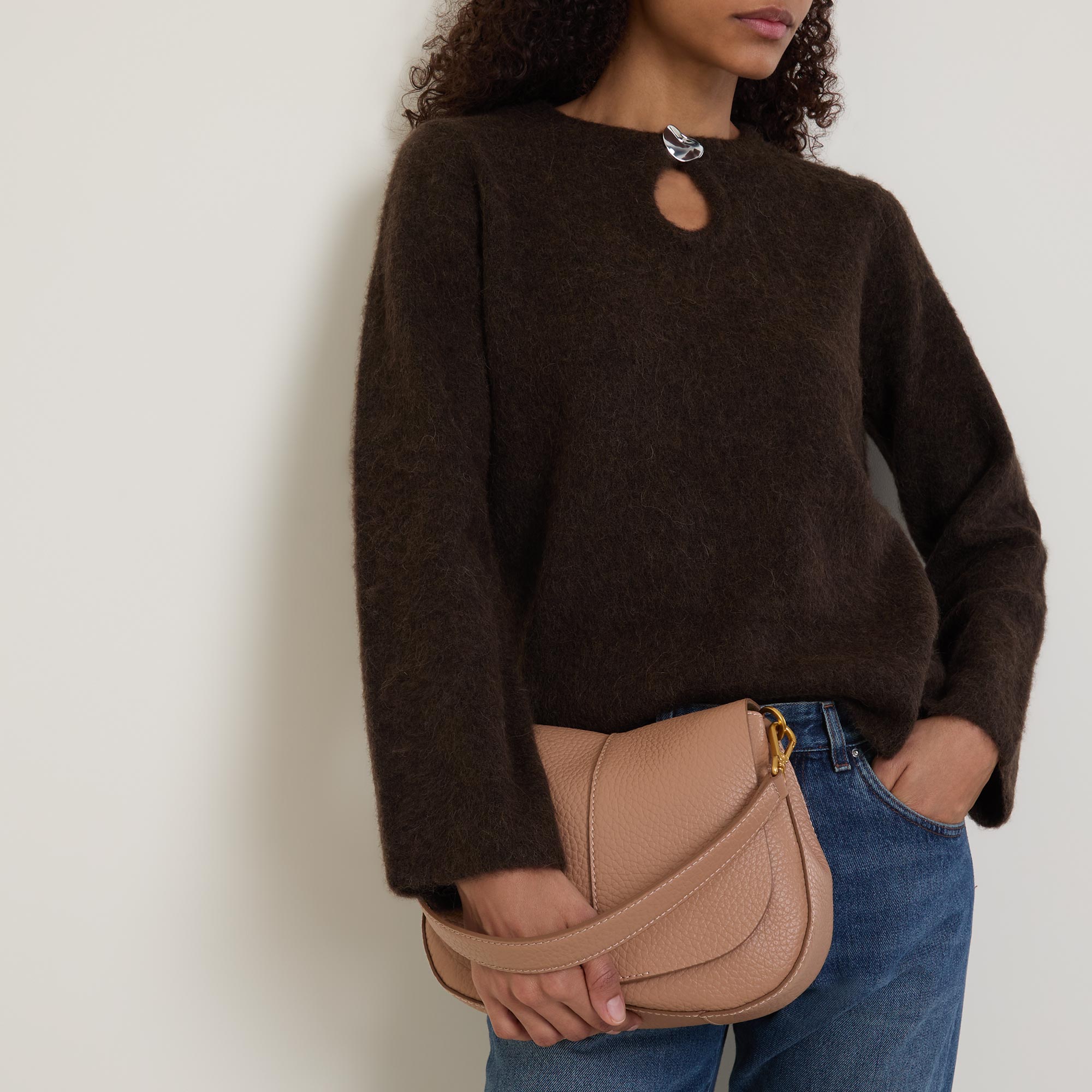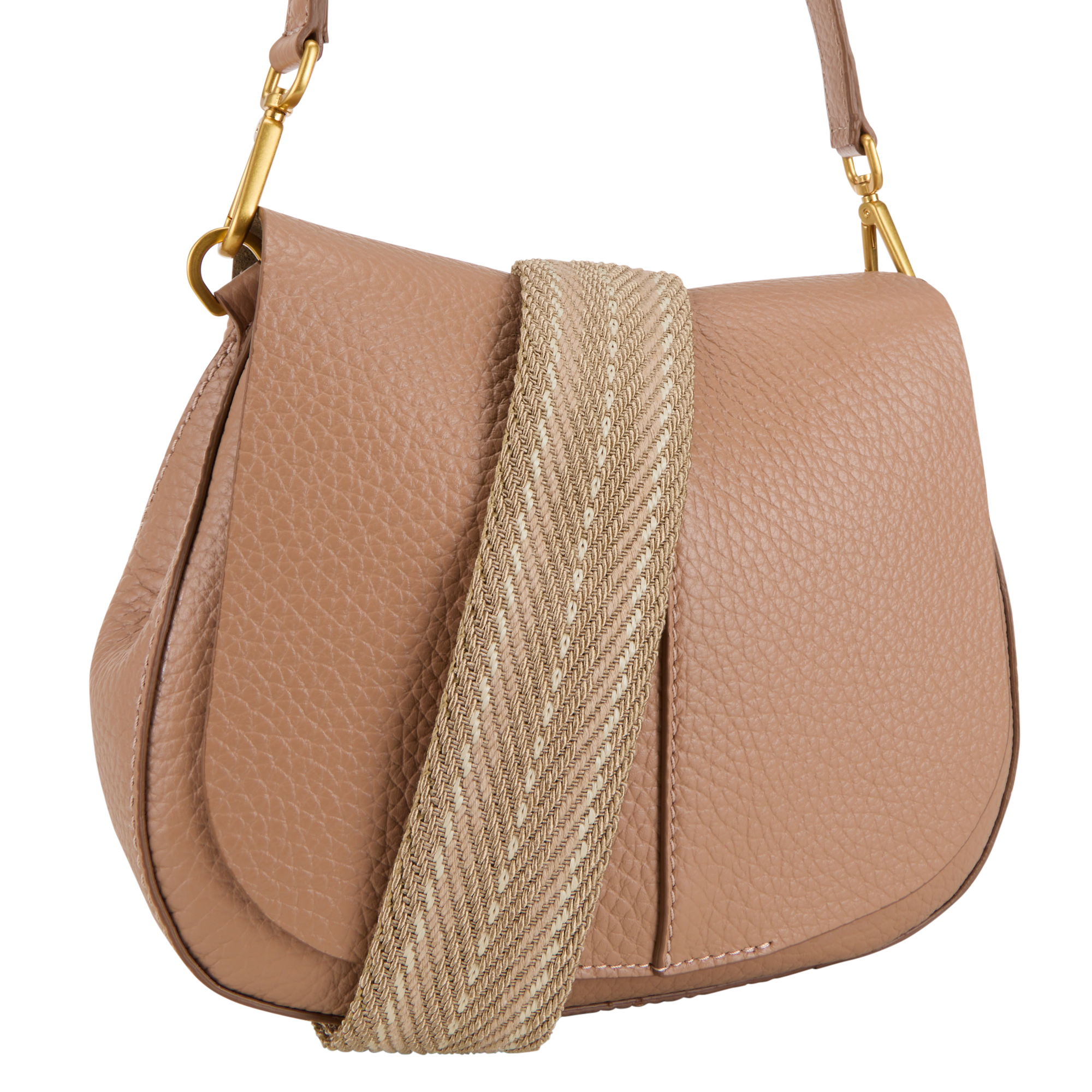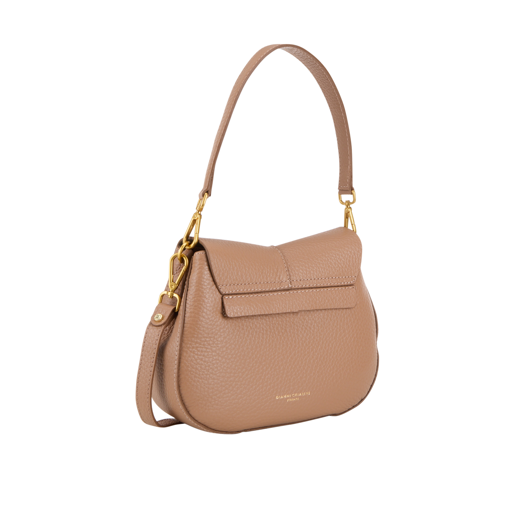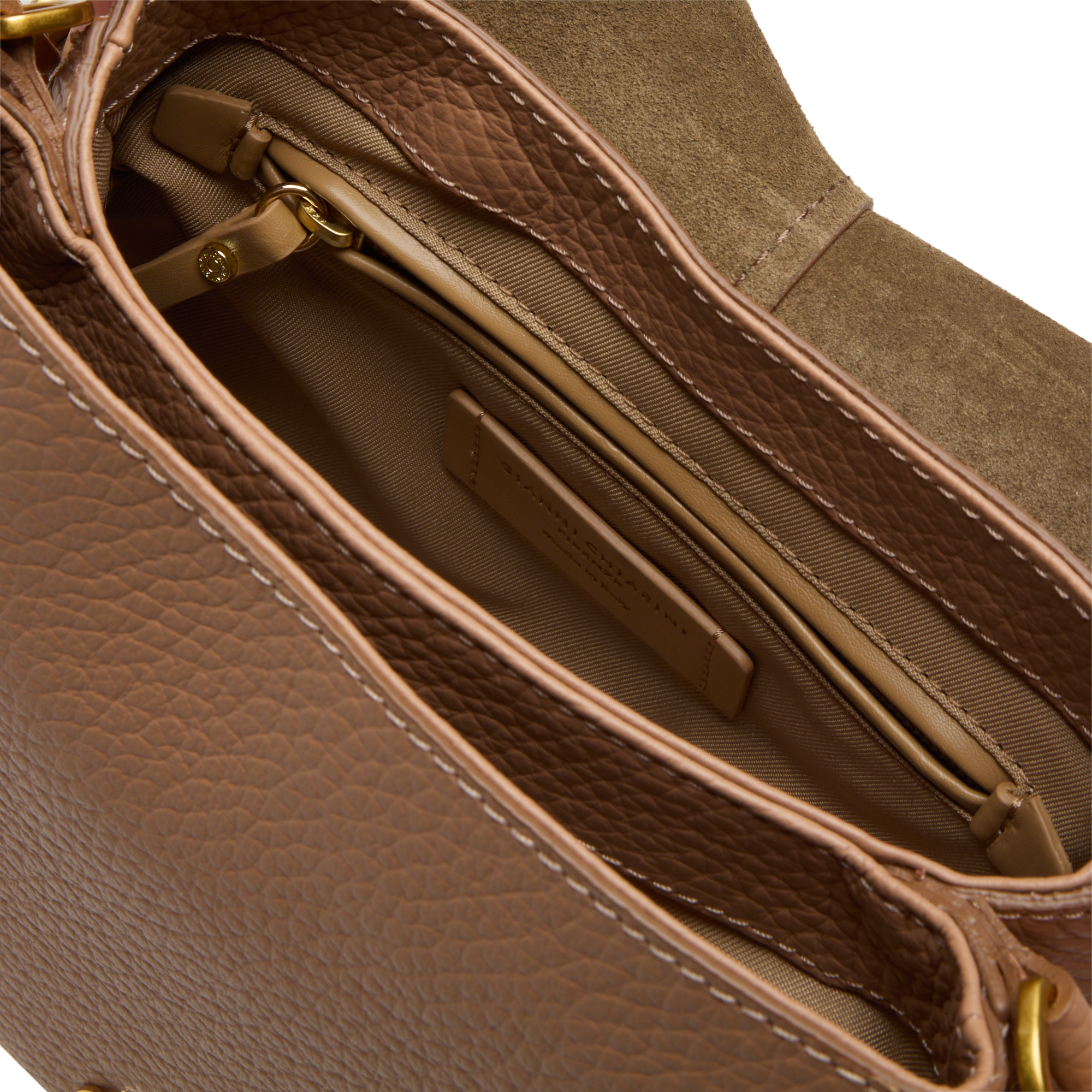 - Detachable shoulder strap, detachable adjustable strap that can be worn on the shoulder or across the body, gold-tone hardware, foldover flap closure, snap-button fastening, back zip-fastening pocket, rear logo branding, grained leather finish