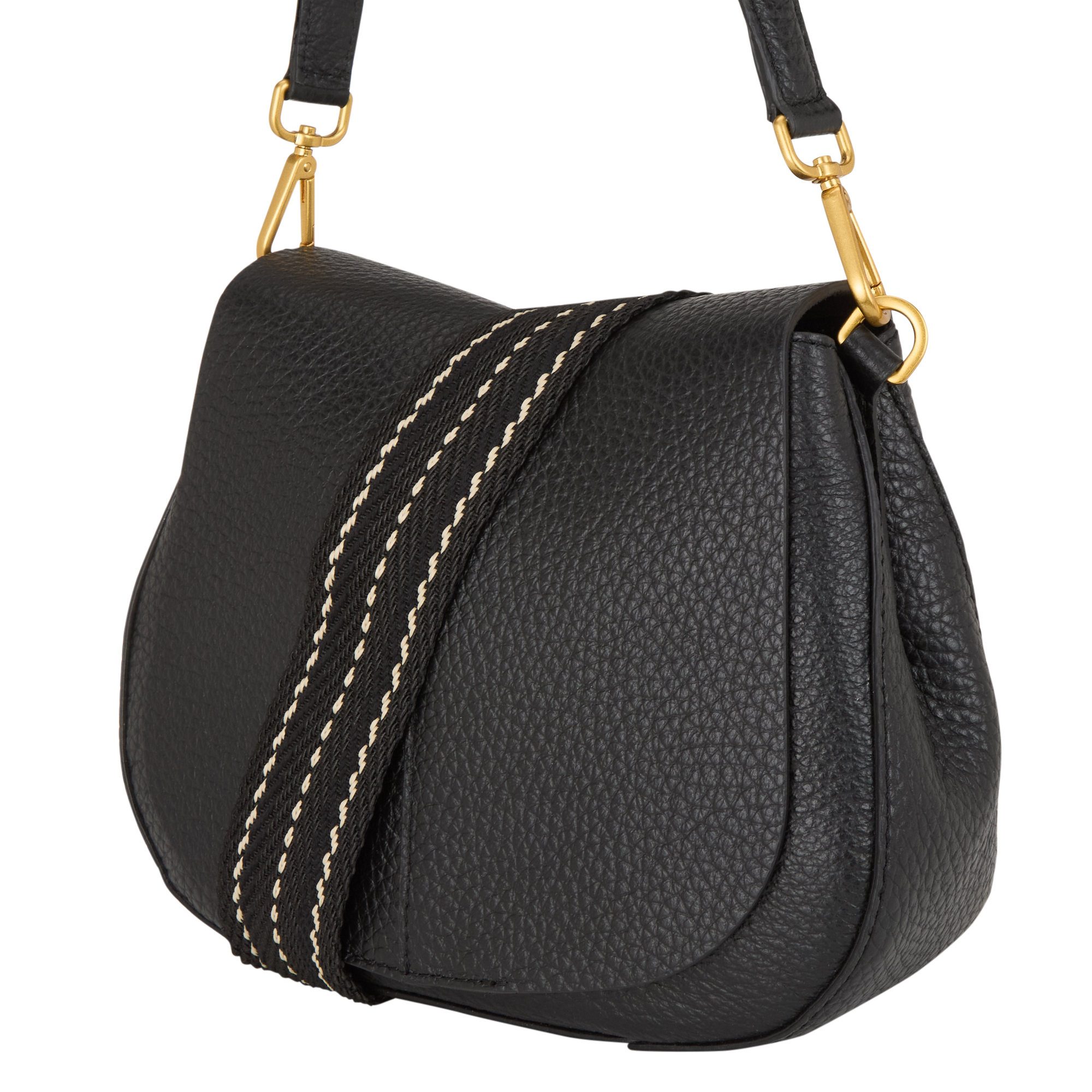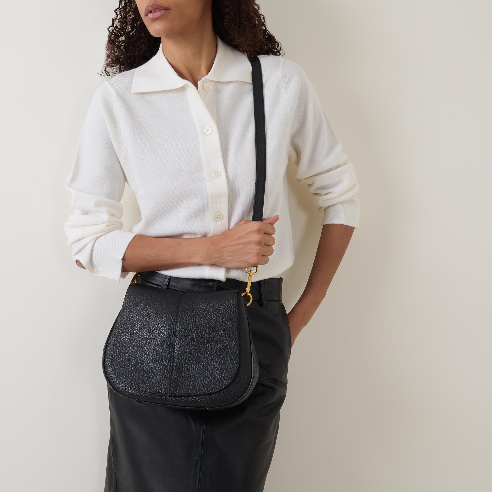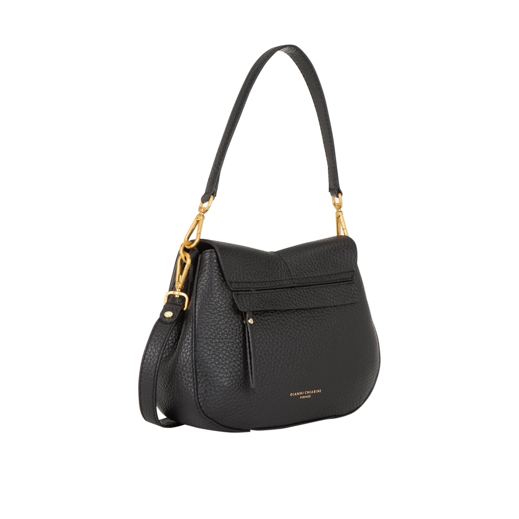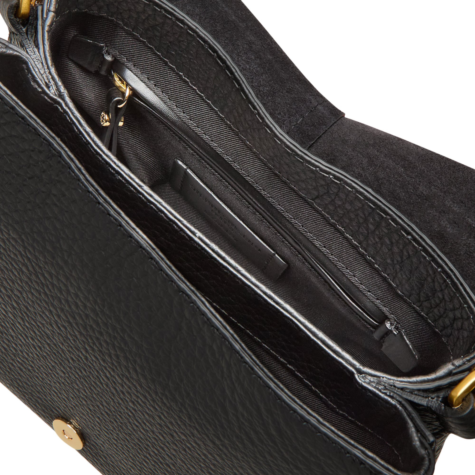 - Detachable shoulder strap, detachable adjustable strap that can be worn on the shoulder or across the body, gold-tone hardware, foldover flap closure, snap-button fastening, back zip-fastening pocket, rear logo branding, grained leather finish