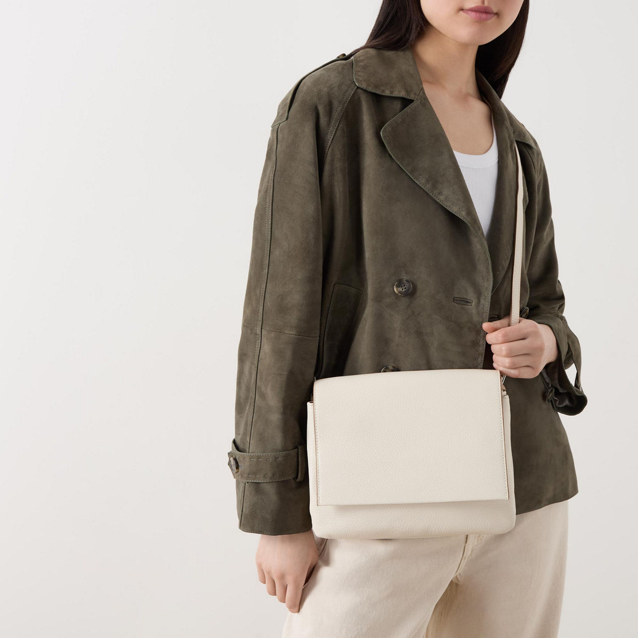 - Foldover flap closure, magnetic fastening, detachable adjustable strap that can be worn over the shoulder or across the body, rear logo branding, tonal stitching, front zip pocket hidden by flap, silver-tone hardware, textured grained leather finish