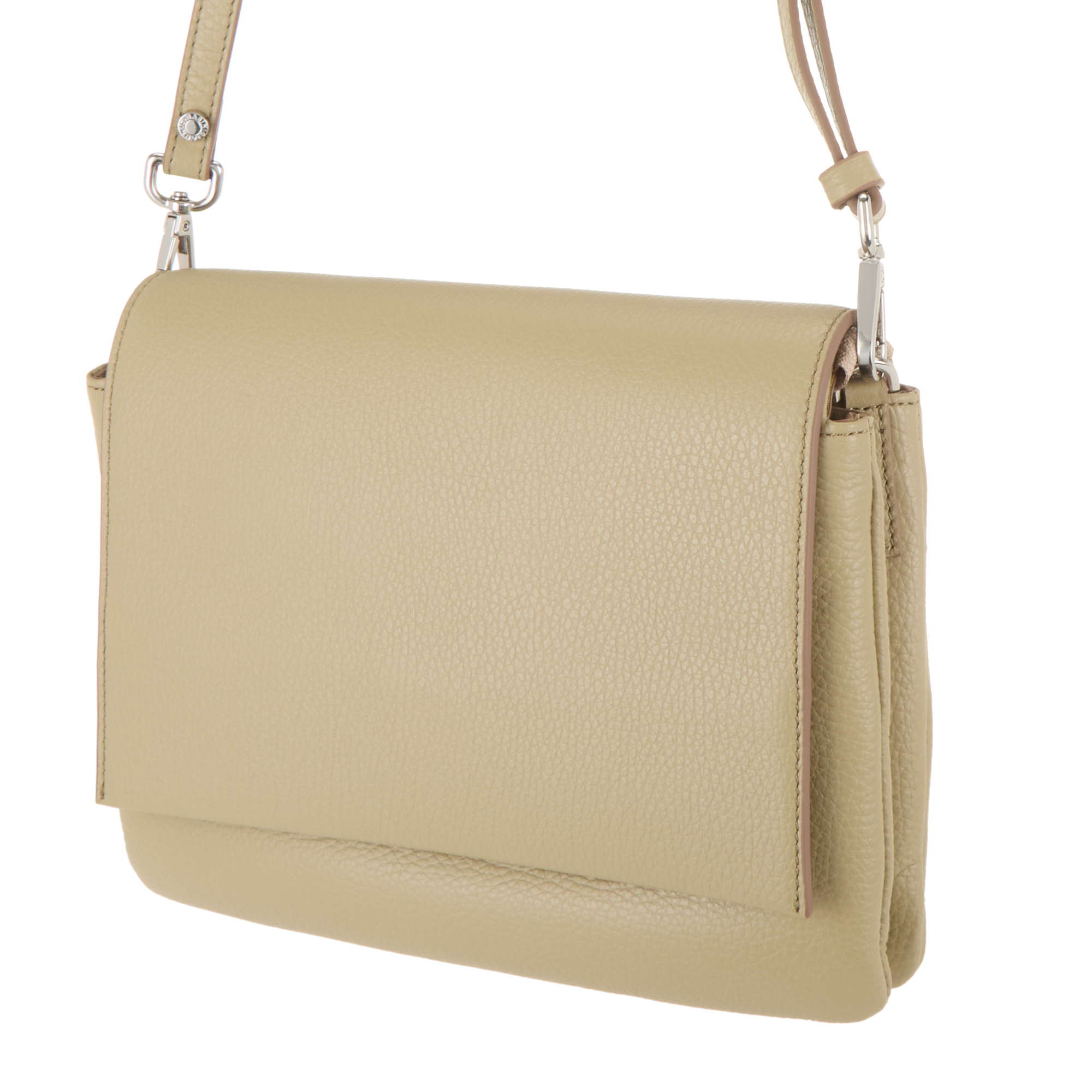 - Foldover flap closure, magnetic fastening, detachable adjustable strap that can be worn over the shoulder or across the body, rear logo branding, tonal stitching, front zip pocket hidden by flap, silver-tone hardware, textured grained leather finish
