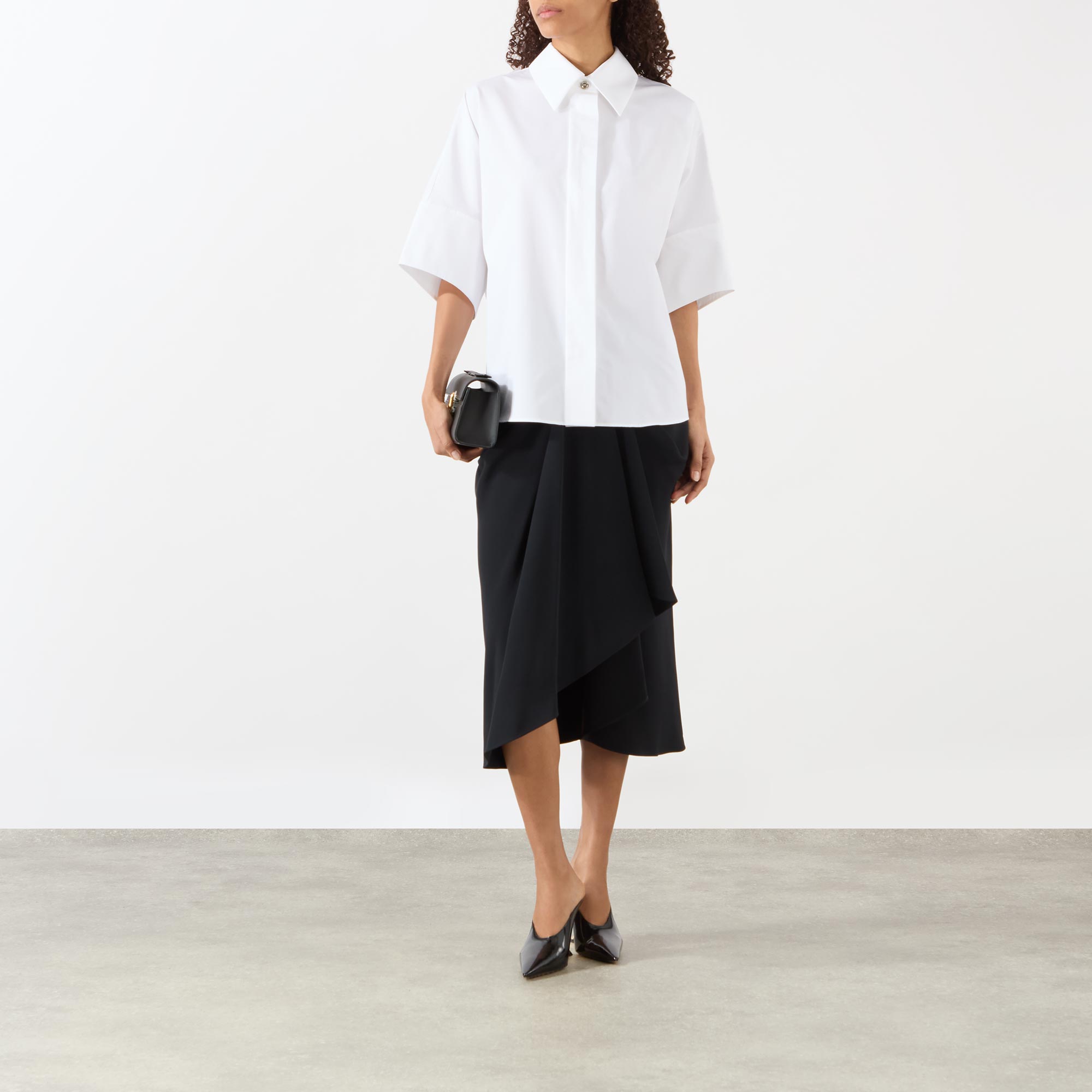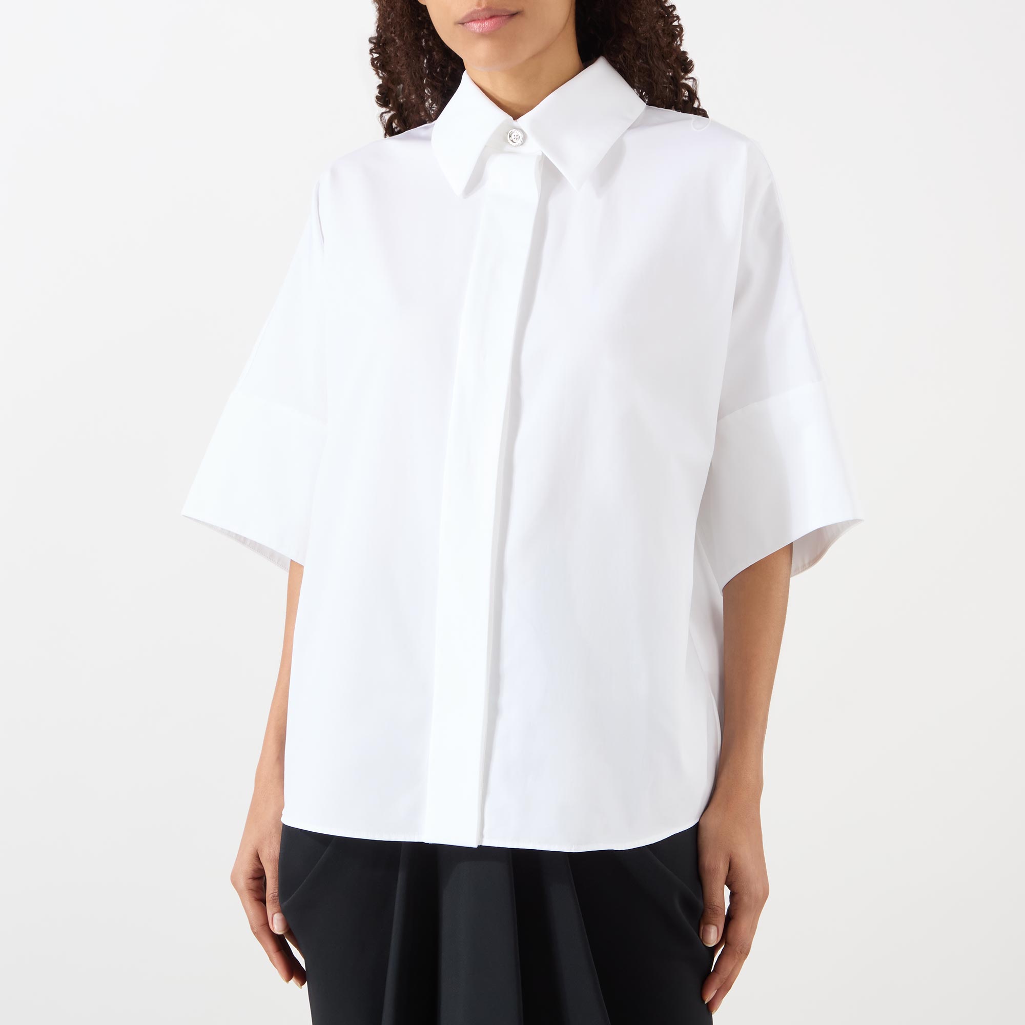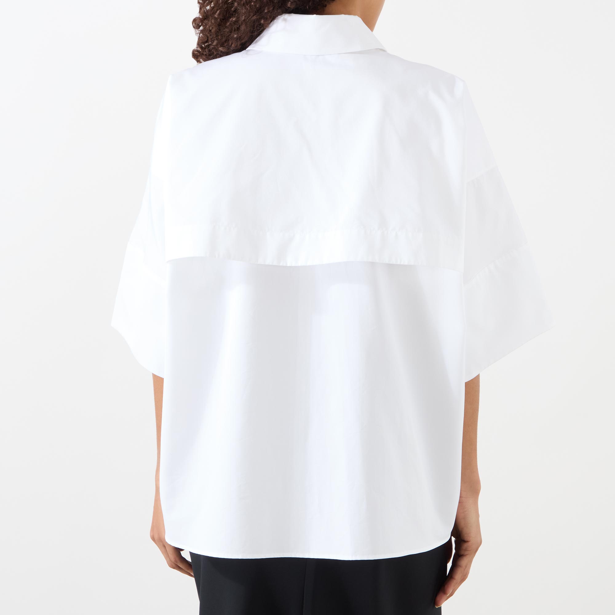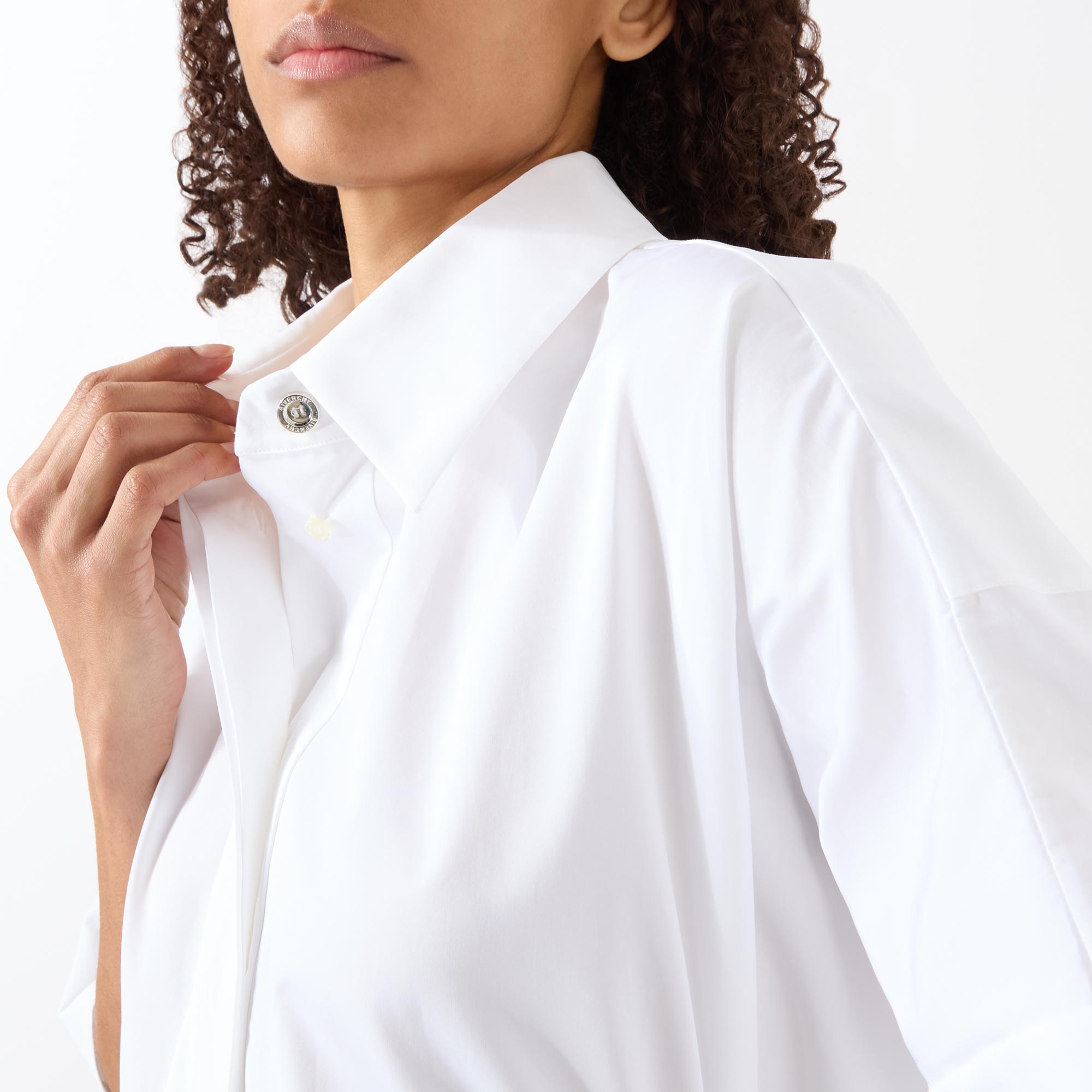 - Exaggerated collar, concealed button fastening, short sleeves, cape detail, branded top button, poplin fabric