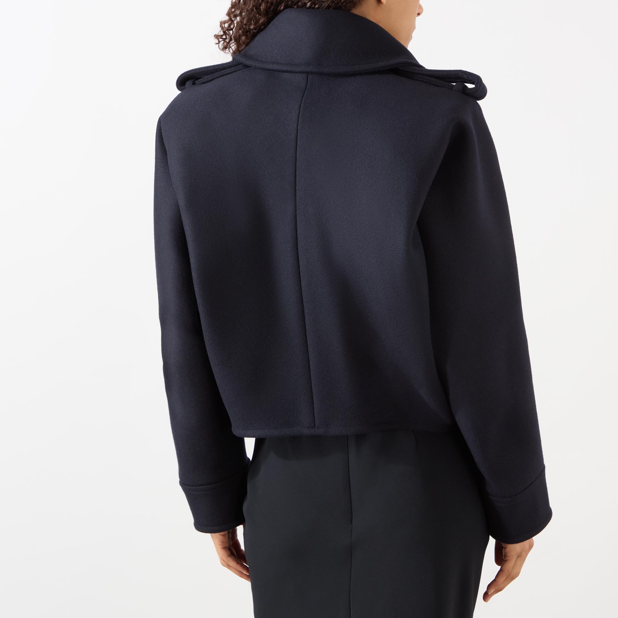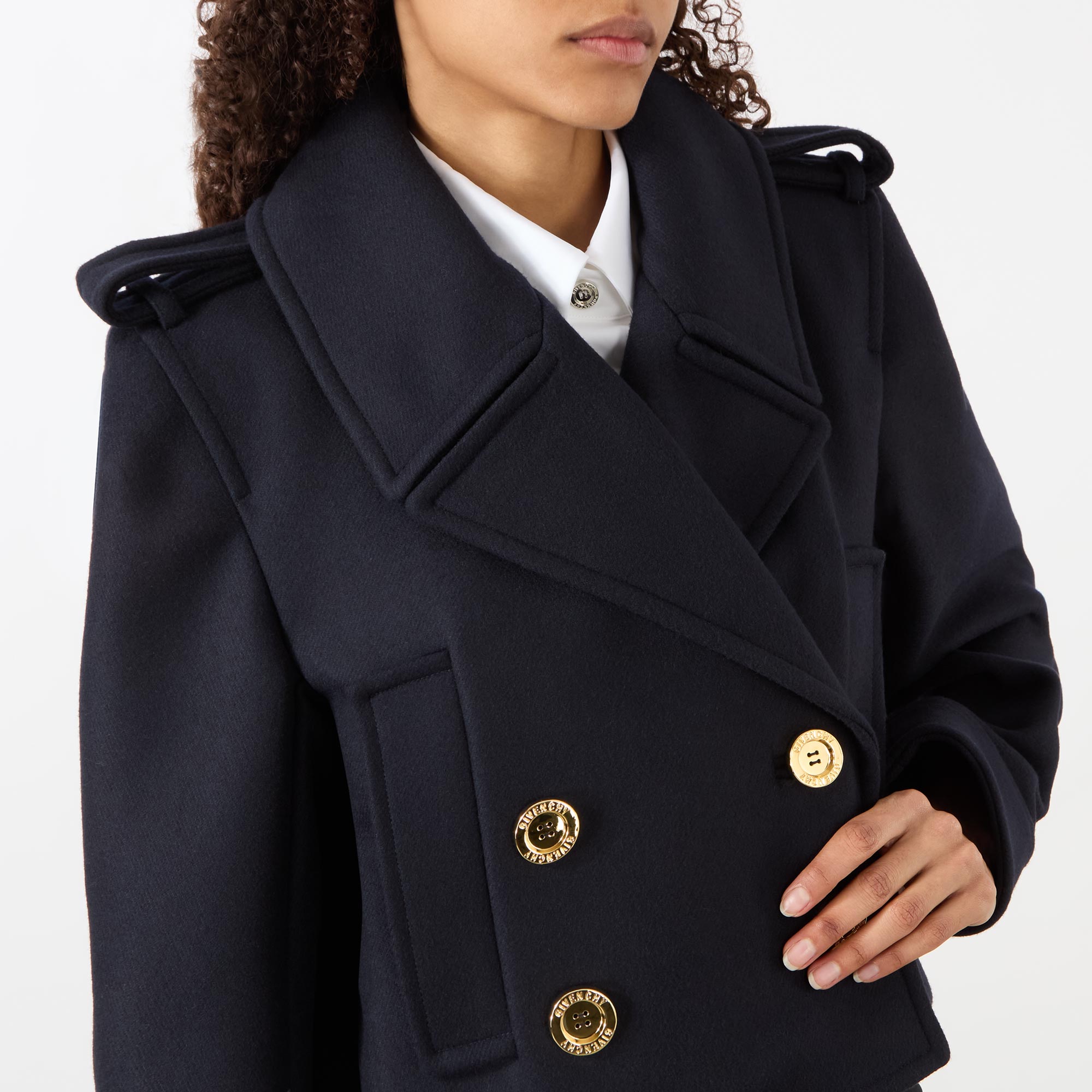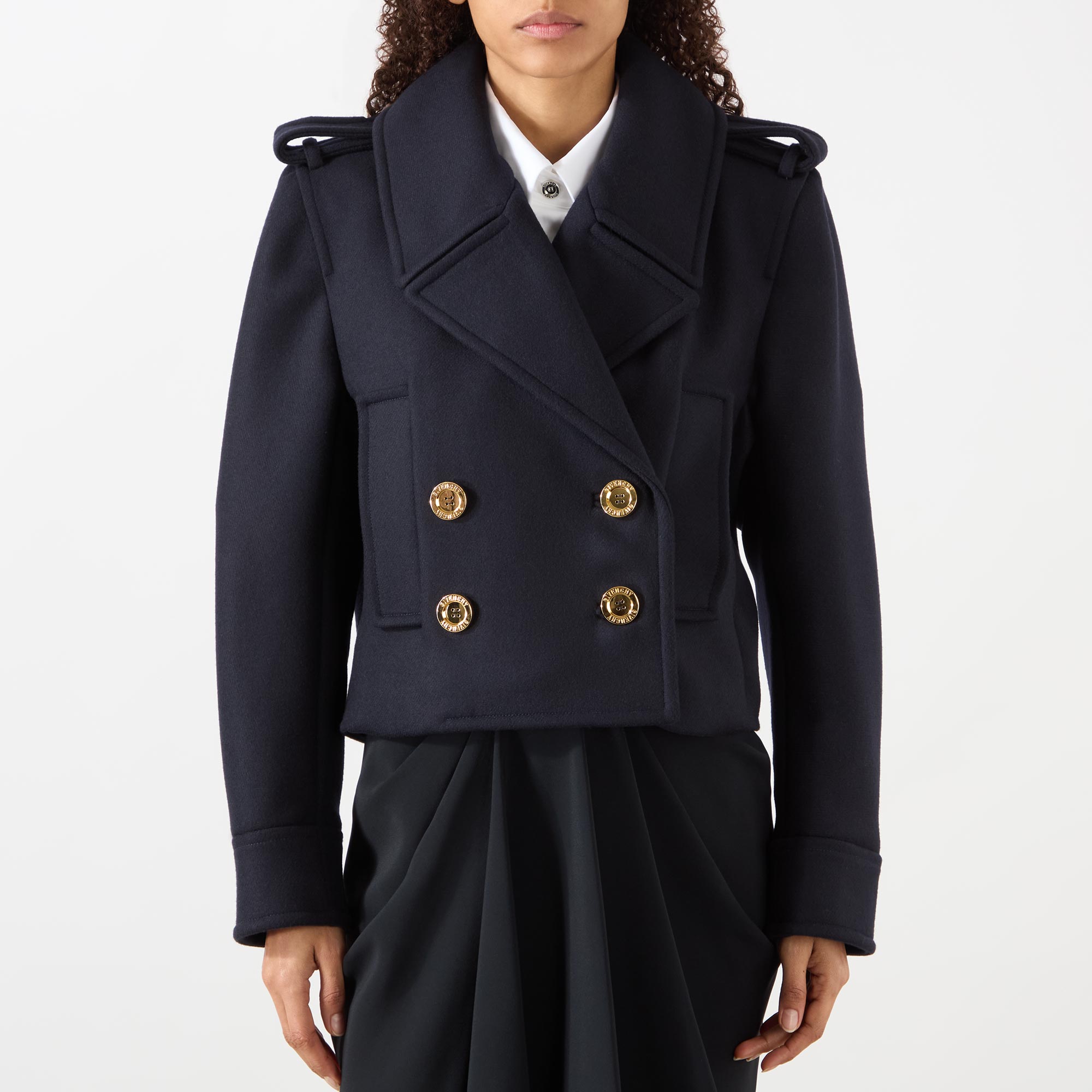 • Notched lapels, epaulette detailing, branded button fastening, double-breasted, long sleeves, cropped length, side entry pockets, volume in the back
