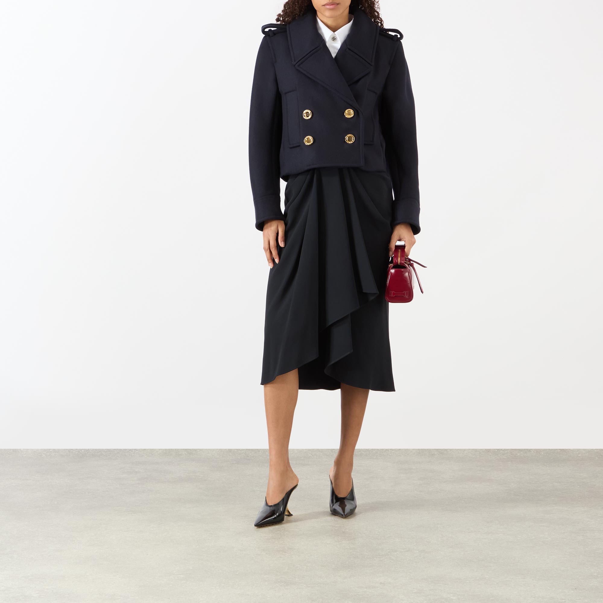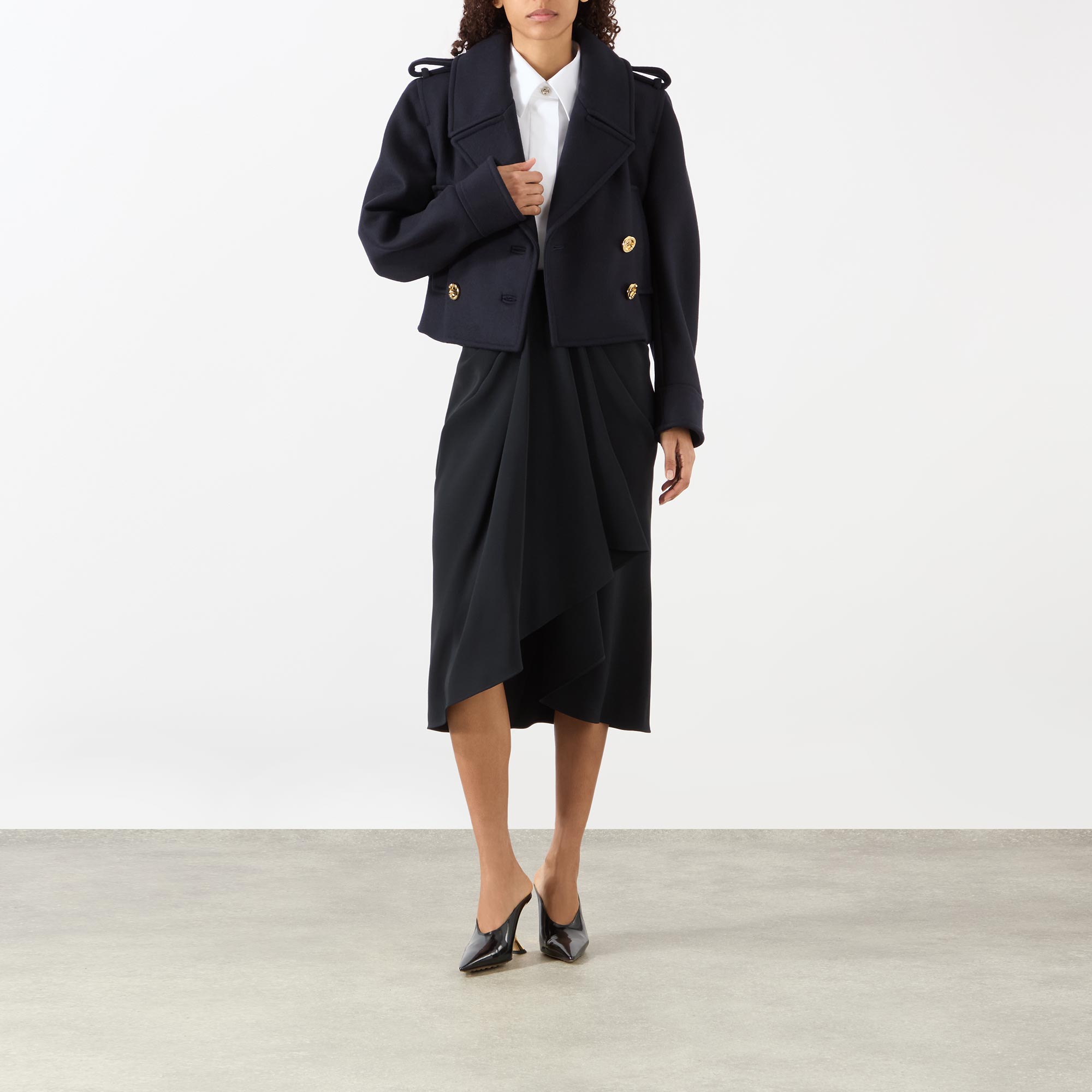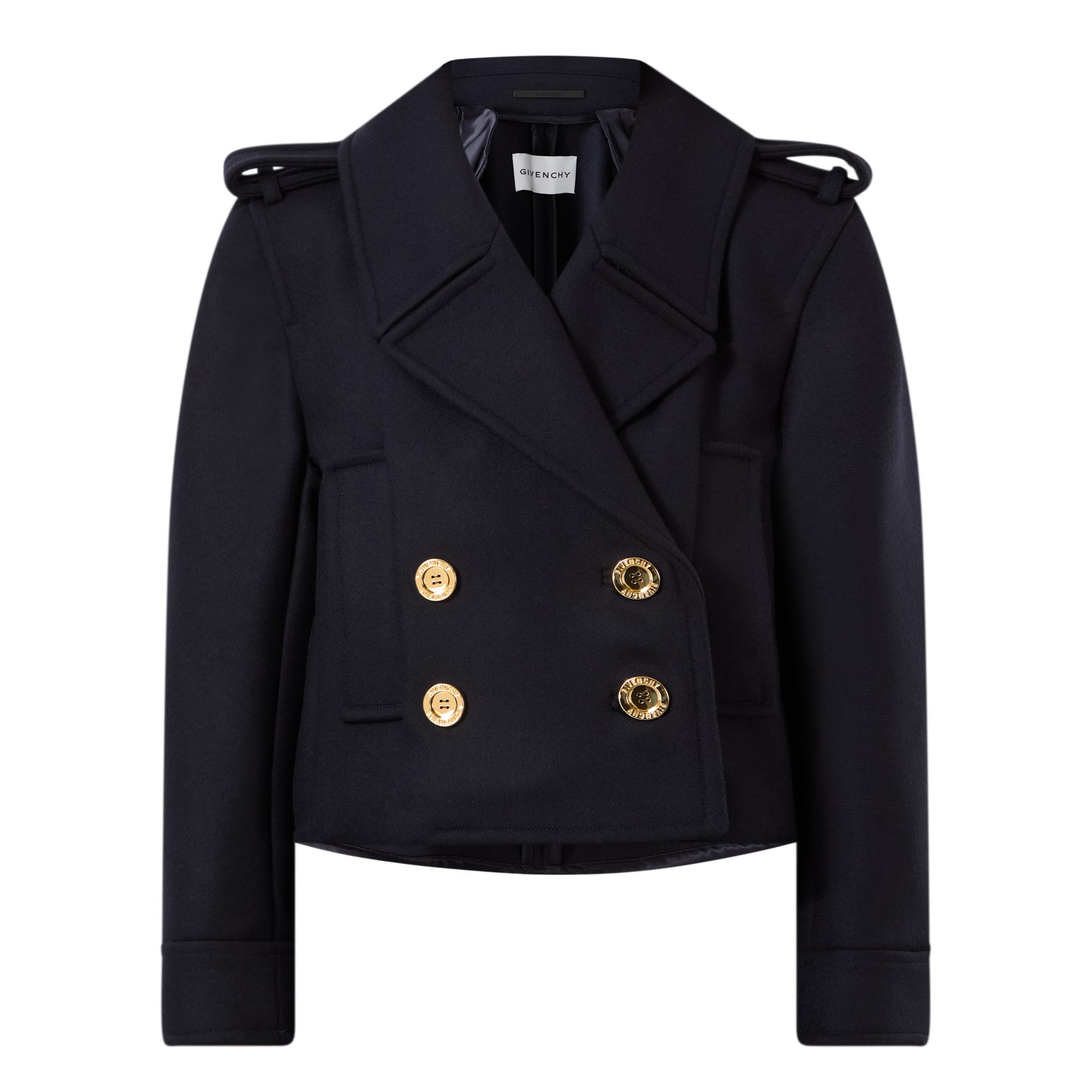 • Notched lapels, epaulette detailing, branded button fastening, double-breasted, long sleeves, cropped length, side entry pockets, volume in the back