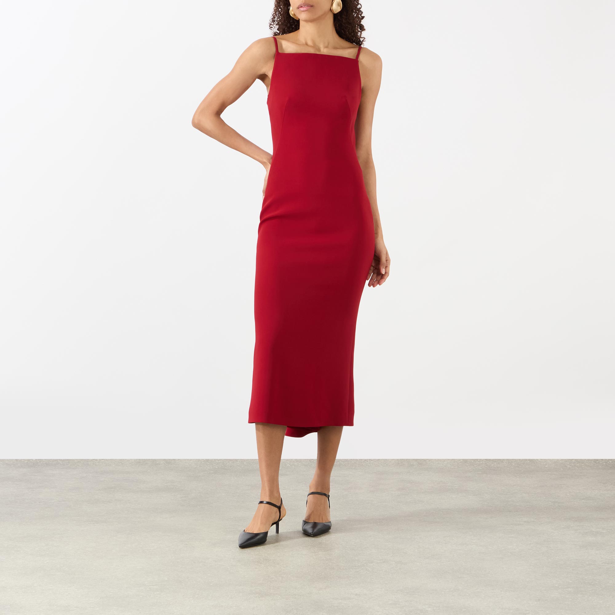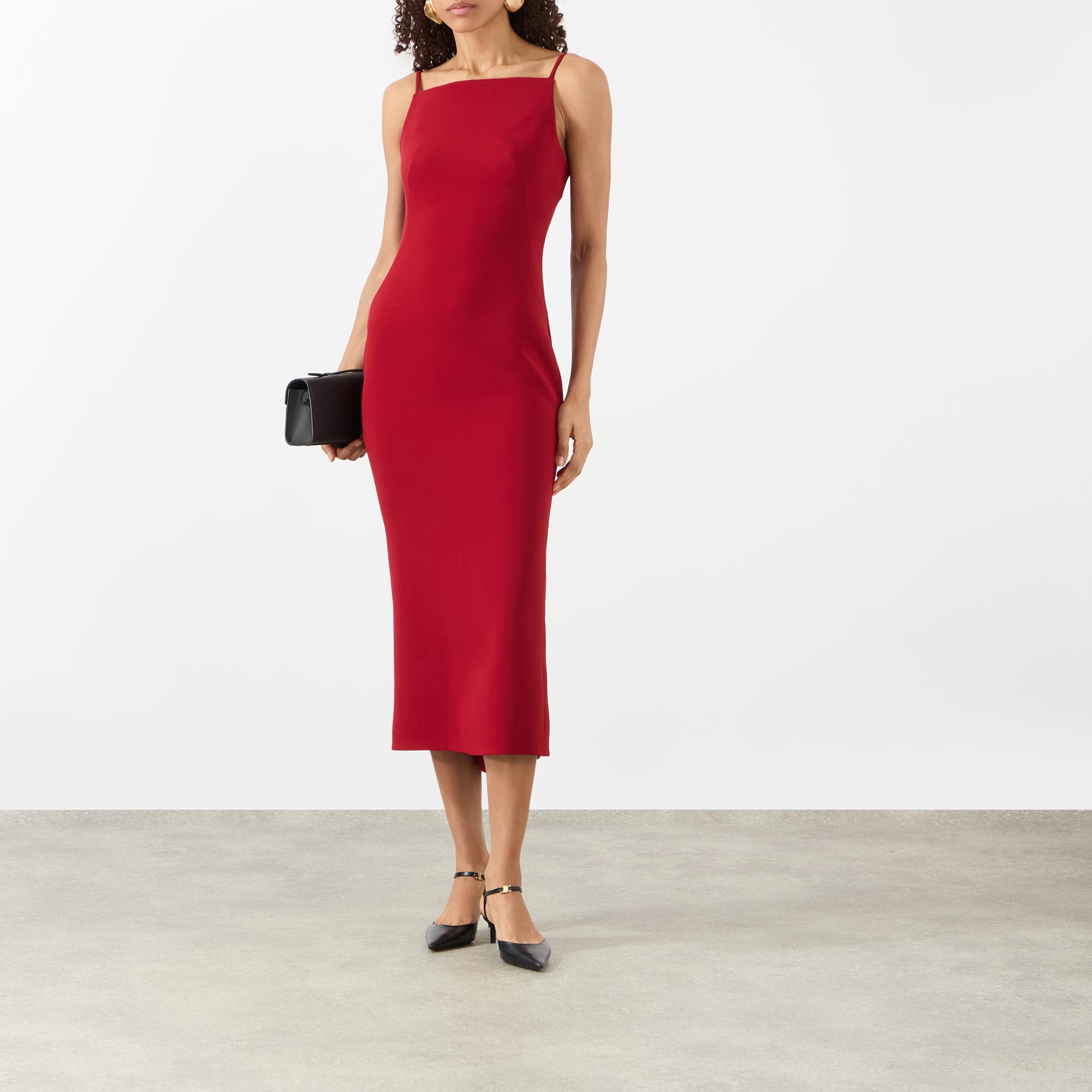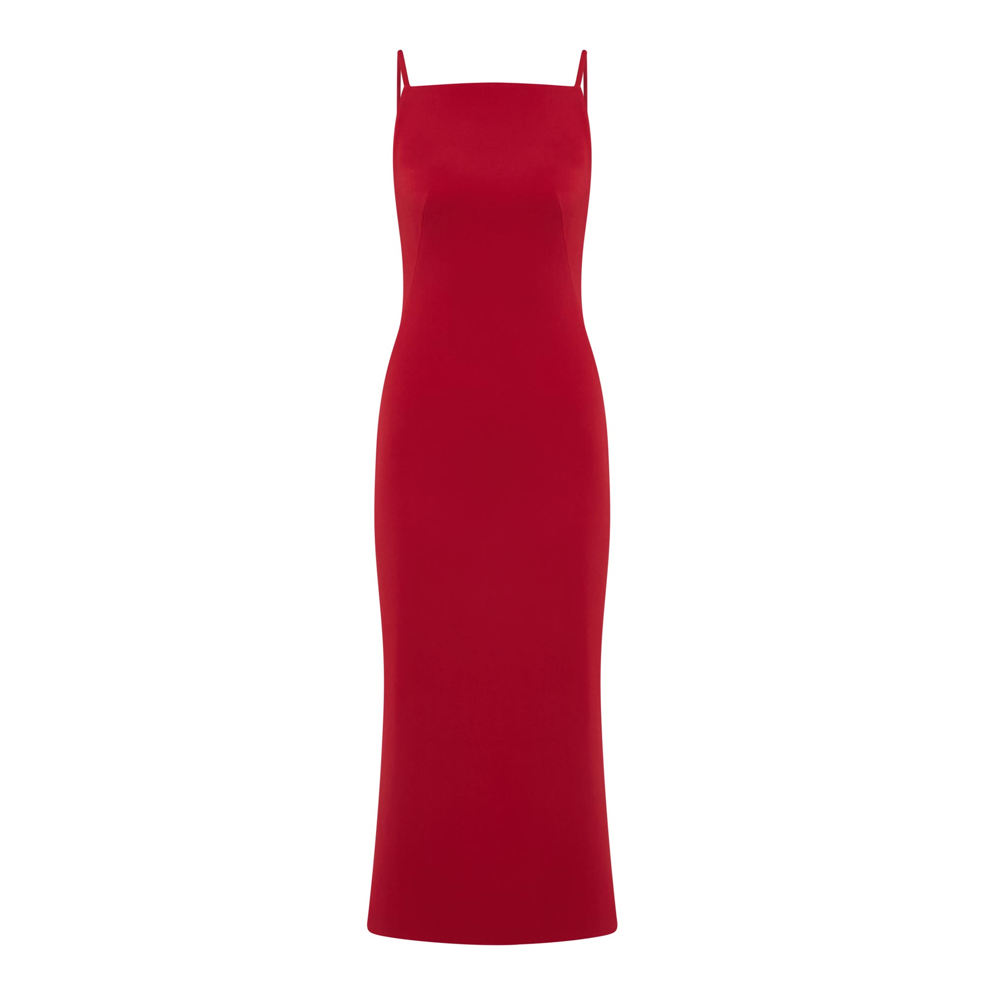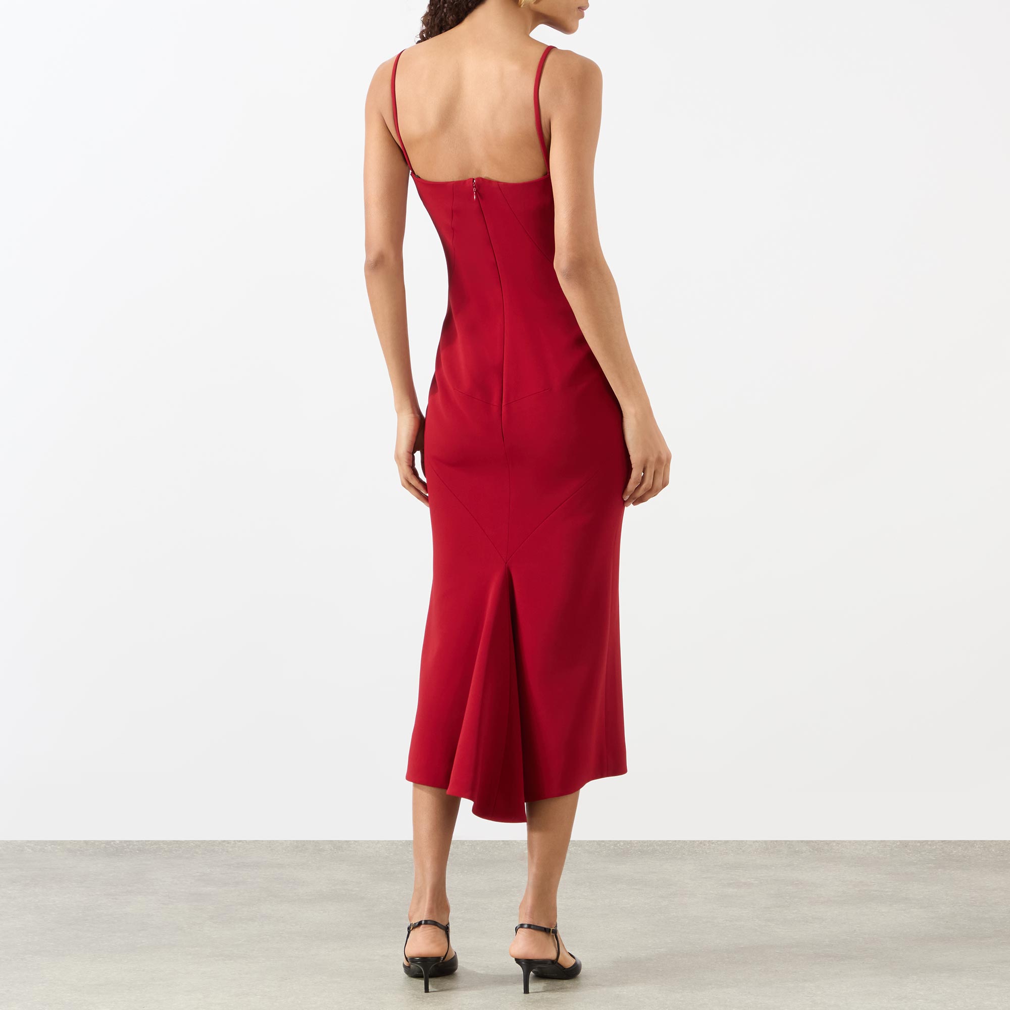• Square neckline, sleeveless, midi length, concealed zip fastening, crepe cady fabric, kickback detailing to the back