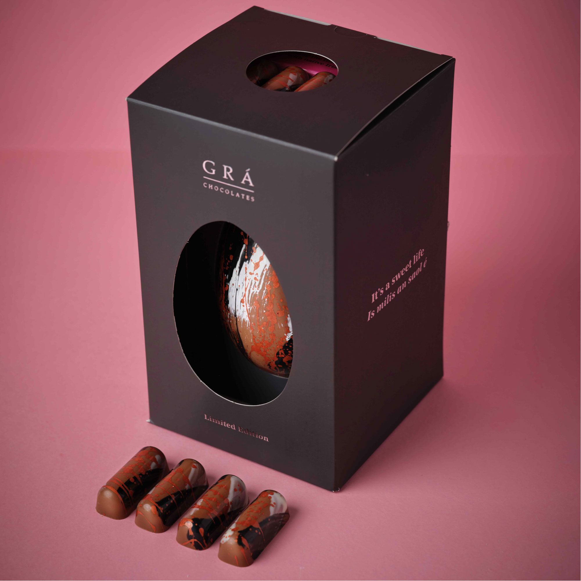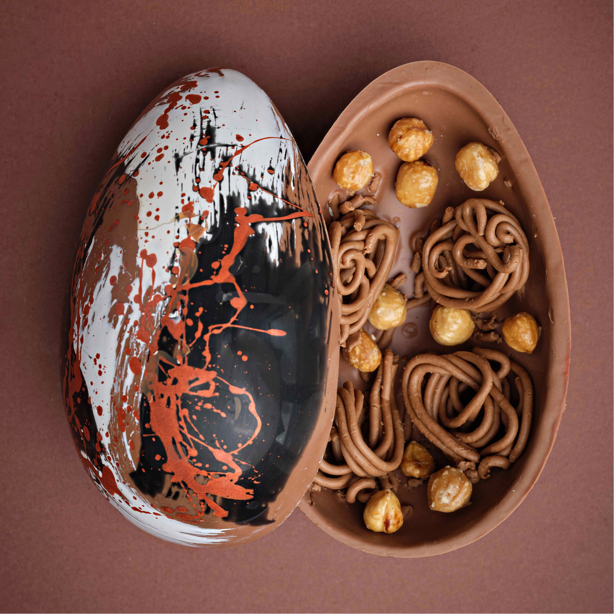 Nuts About You Easter Egg, 35% milk chocolate shell with candied hazelnuts and hazelnut gianduja, light touch of sea salt, luxurious hazelnut praline with Achill Island sea salt, comes with 4 Nuts About You chocolates, carefully hand-painted design, made with the best quality hazelnuts, includes praline with a delicate touch of salt elevating the chocolate, contains milk products and nuts.