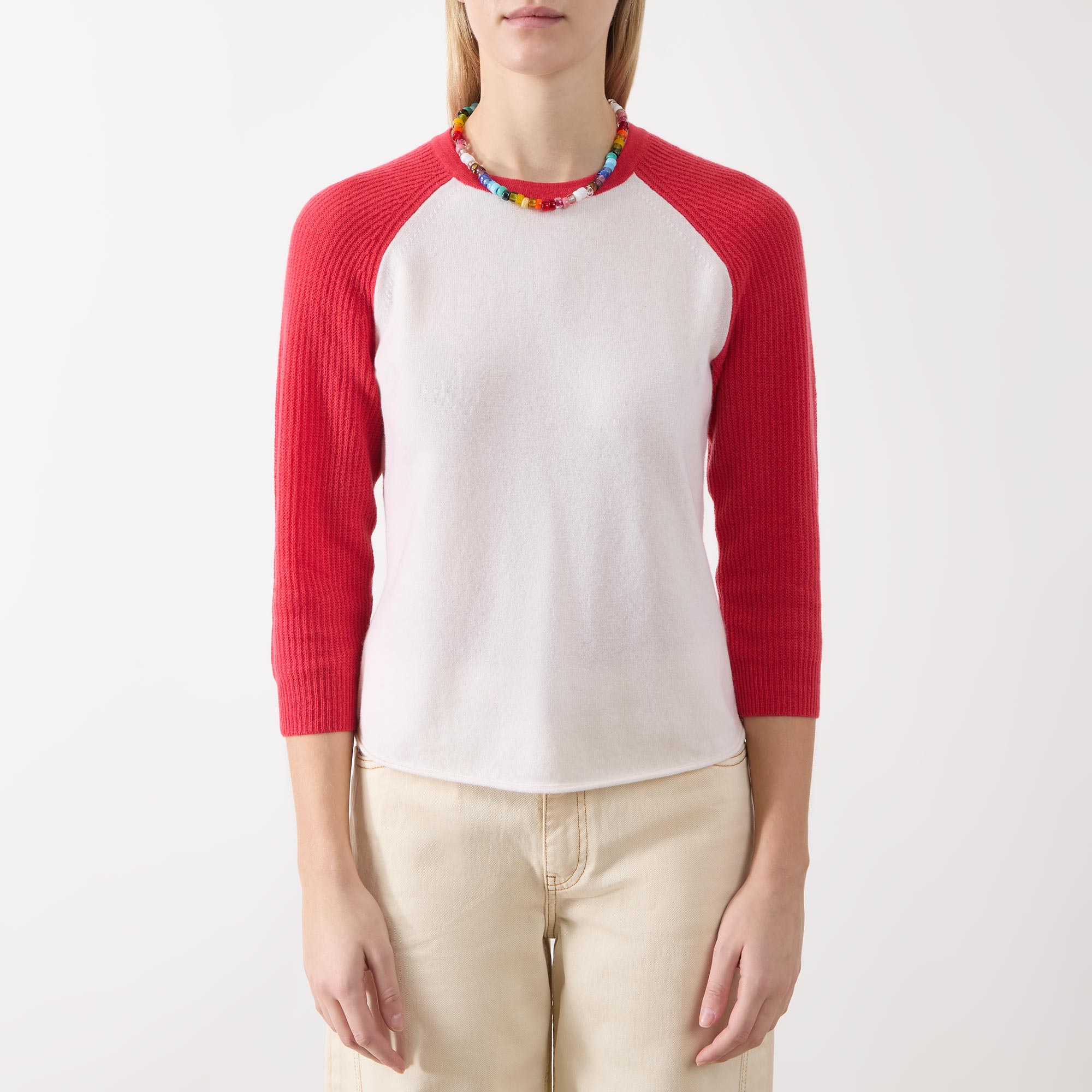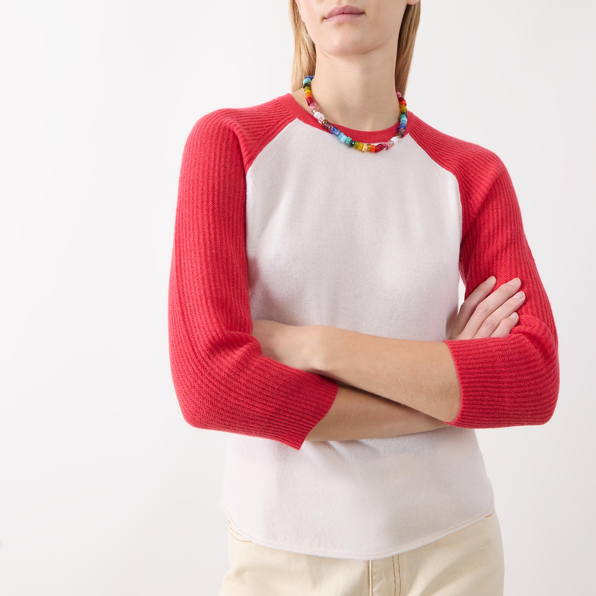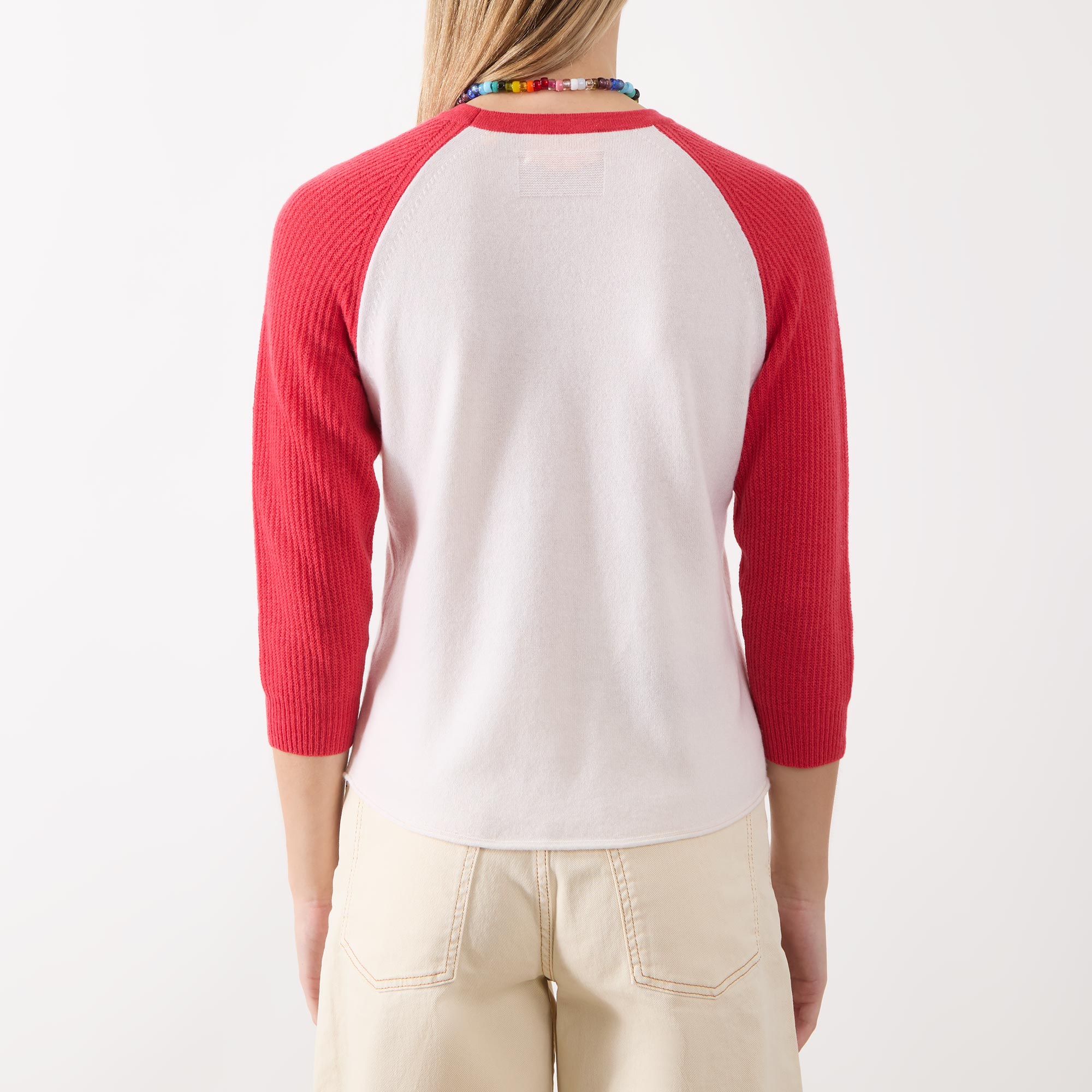 - Round neckline, three-quarter-length sleeves, straight hemline, baseball style, knit structure, lightweight feel
