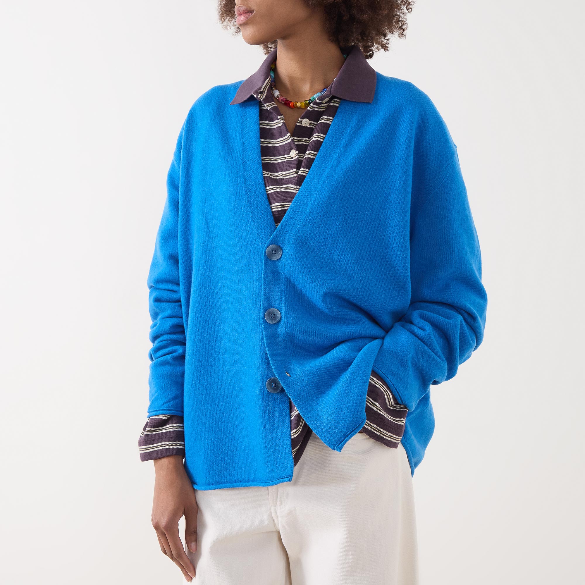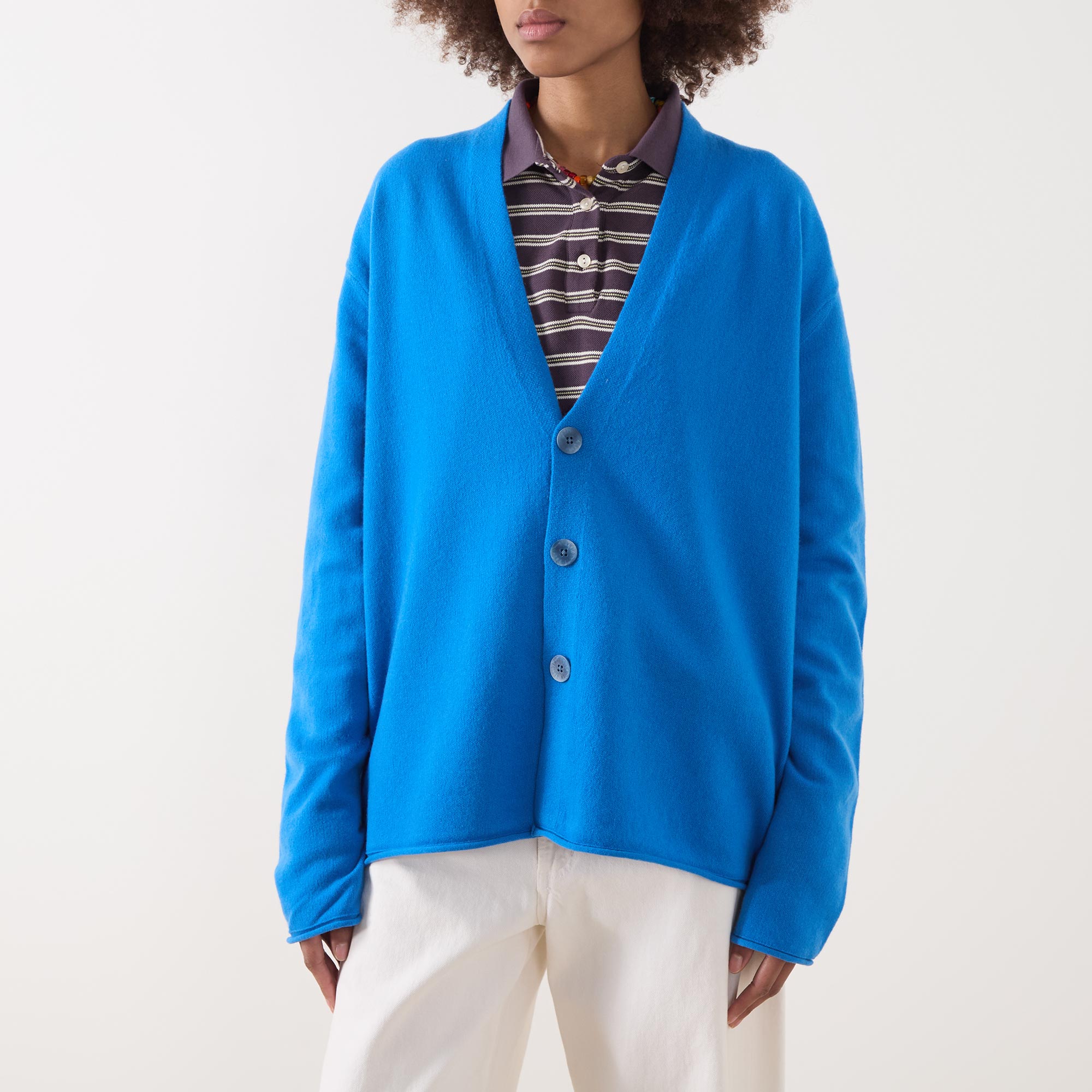 - V-neckline, shawl collar, three-button closure, medium-weight knit, rolled hem and cuffs, signature branding to back neck