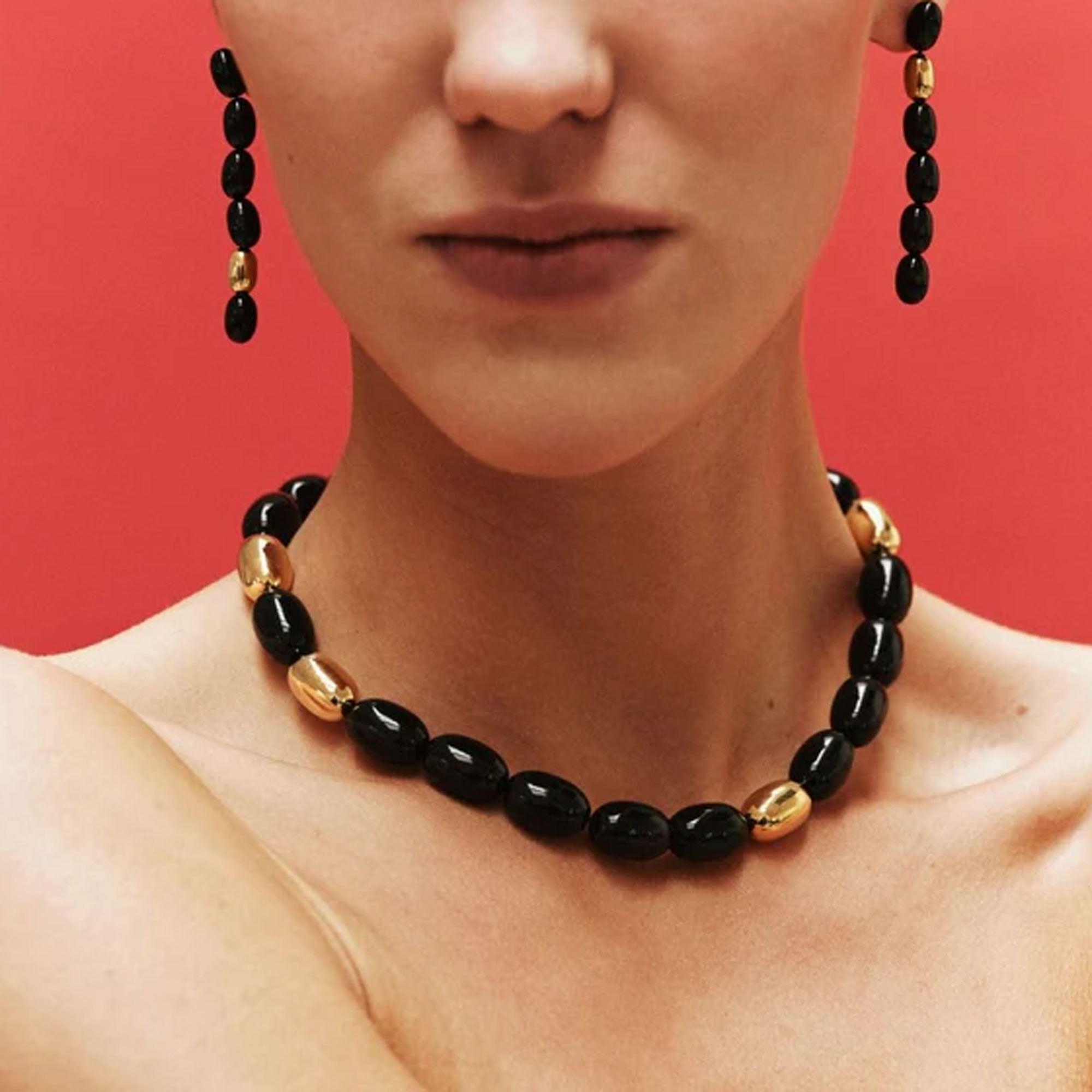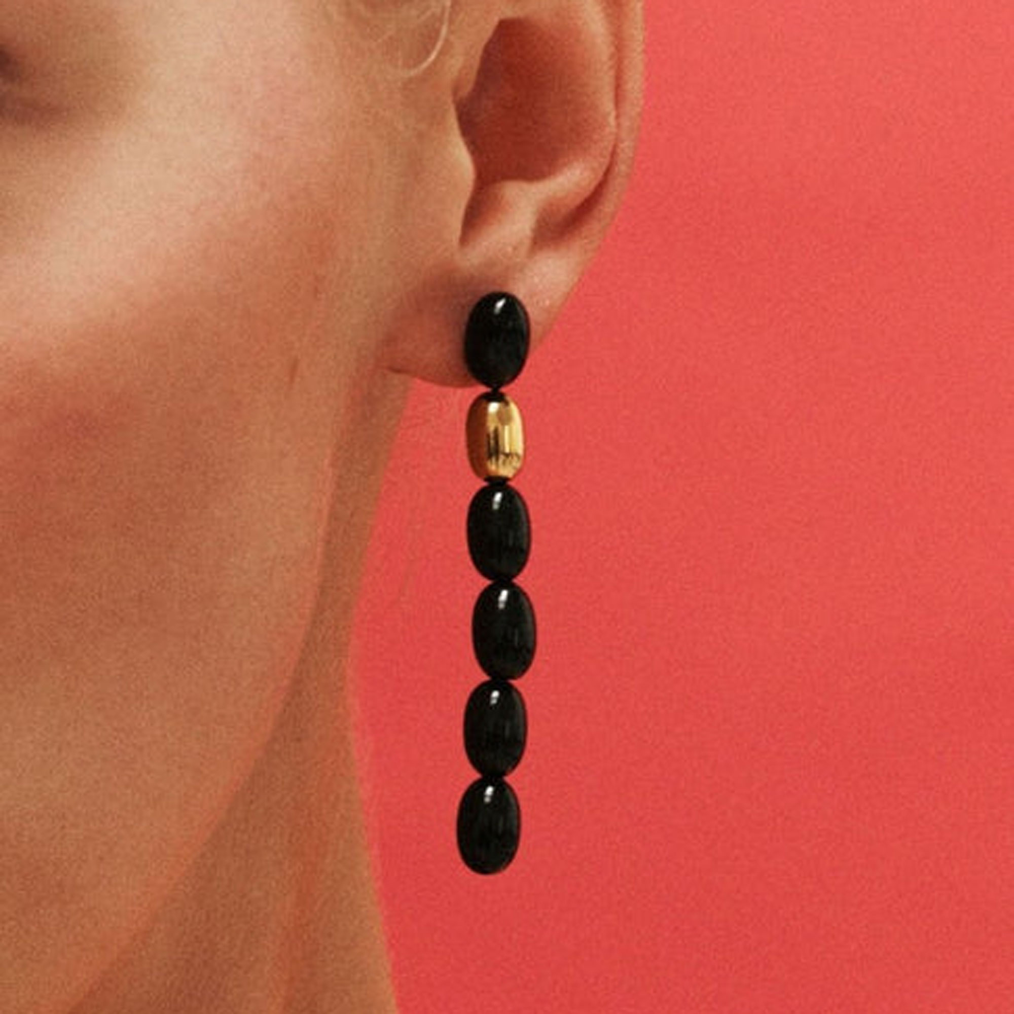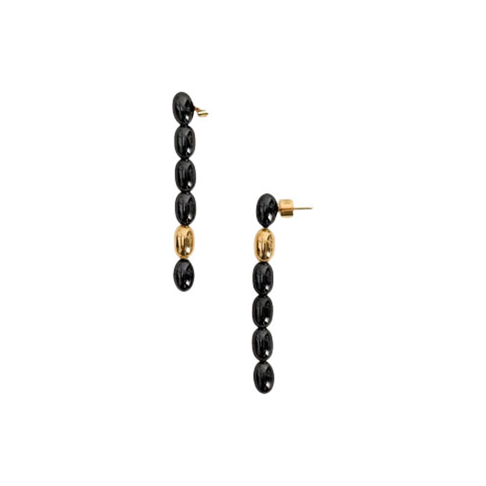 - Composition and Care: PVD 18k gold-plated stainless bead mixed with resin black beads. Do not apply water or jewellery cleaning products as this may damage the pieces. Do not wear your jewellery swimming or in saunas or steam rooms. To keep the quality of your special piece, we suggest avoiding water contact. As we have a chunky statement styles, we suggest storing and traveling with jewellery in a protected case to avoid the posts being damaged