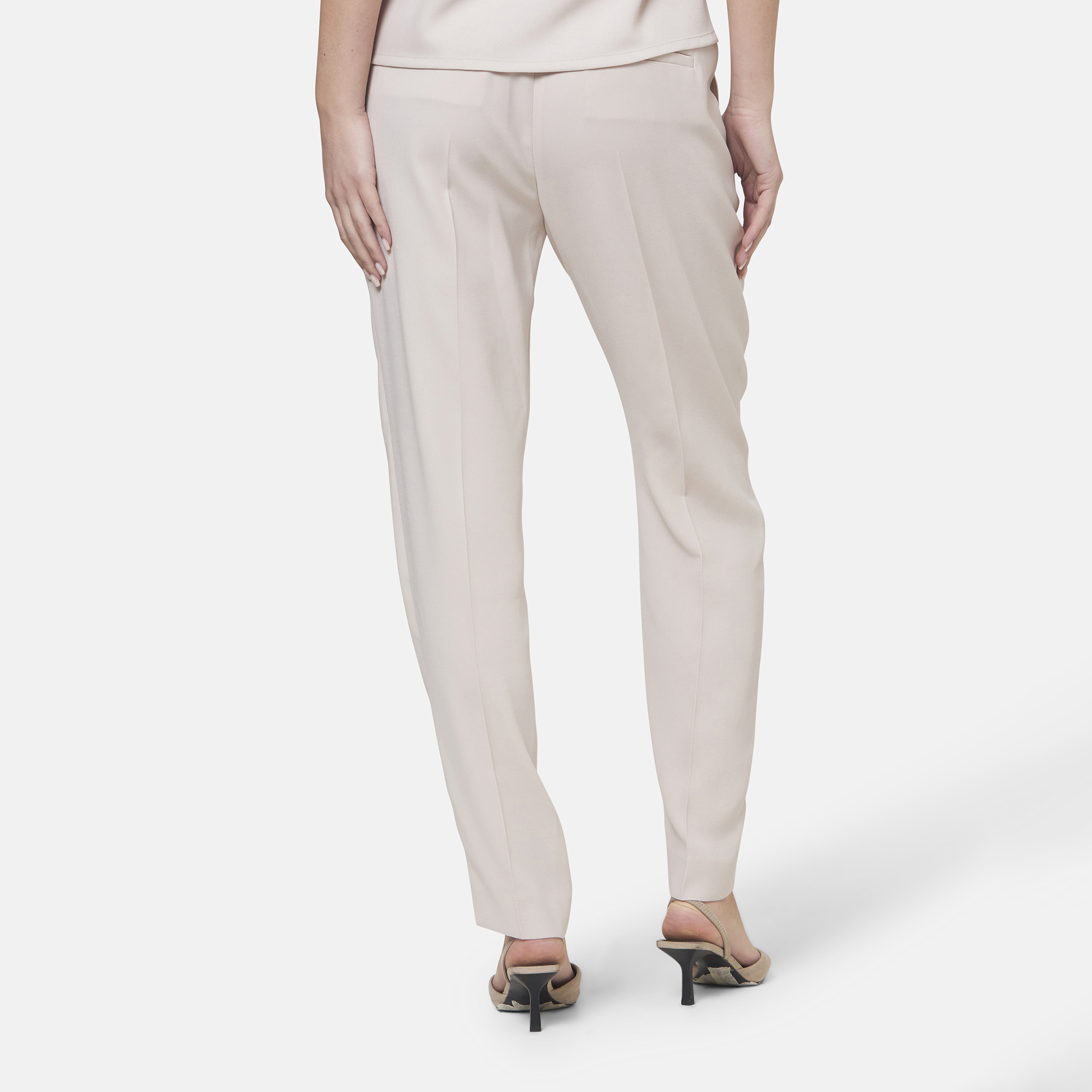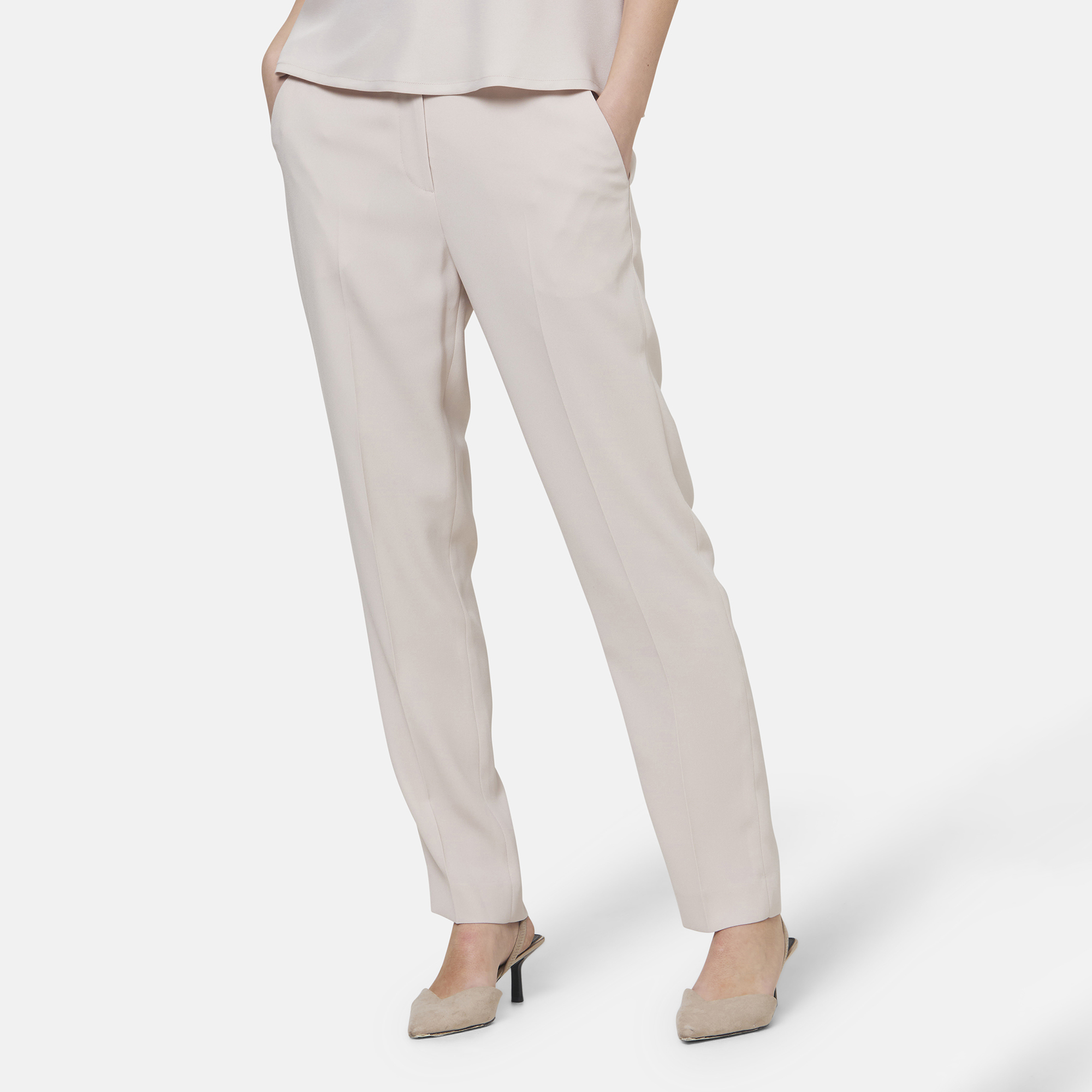 - Flat-front design, natural waist, relaxed narrow-leg silhouette, side pockets, semi-elasticated waistband