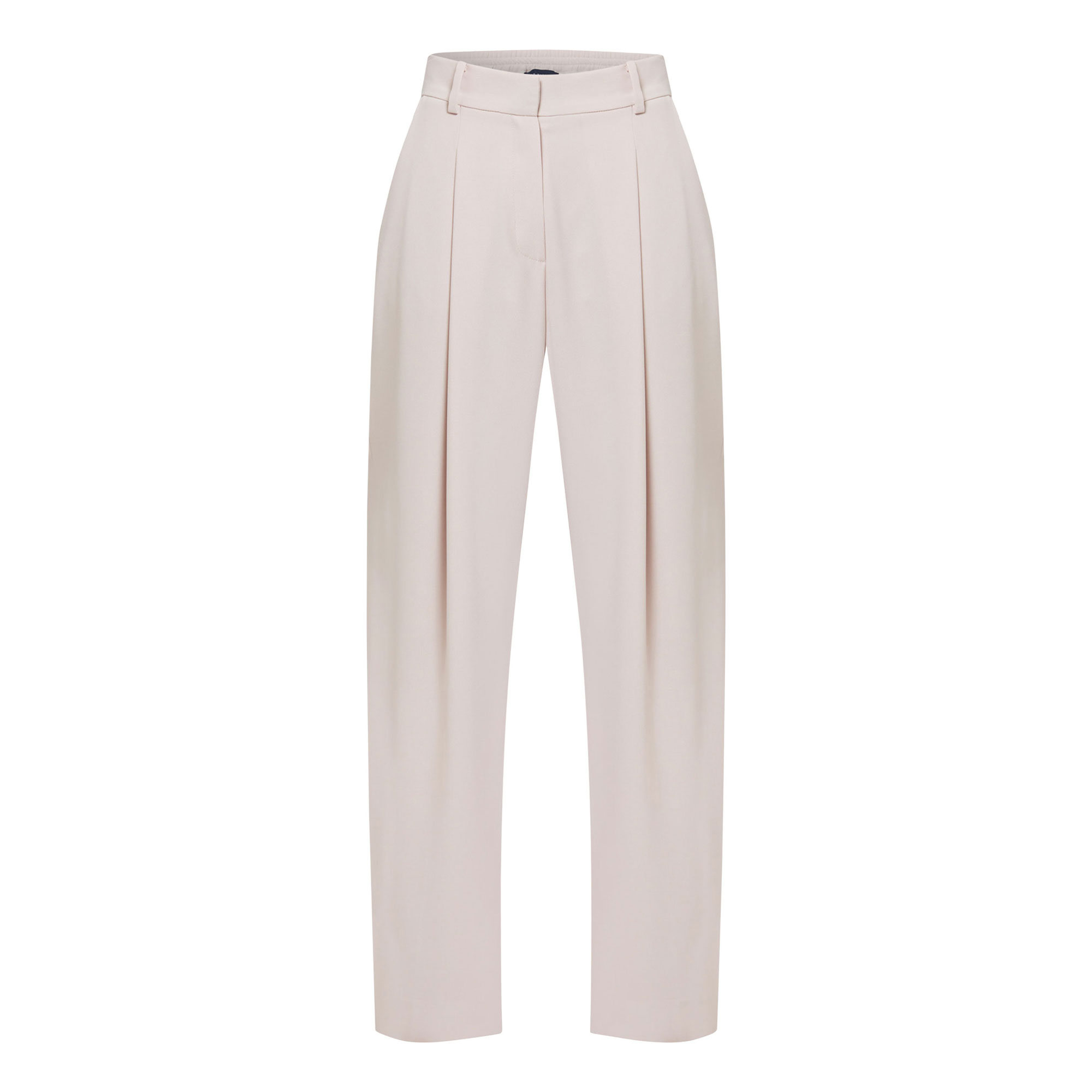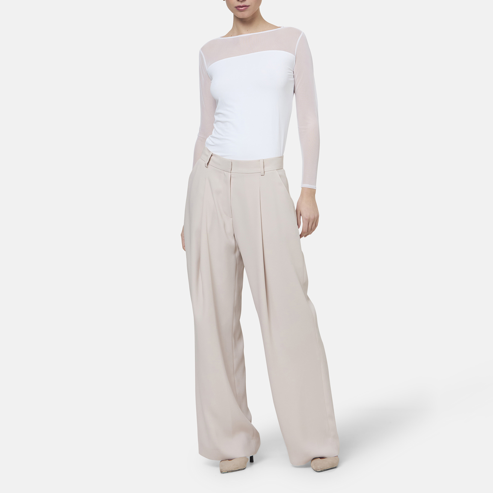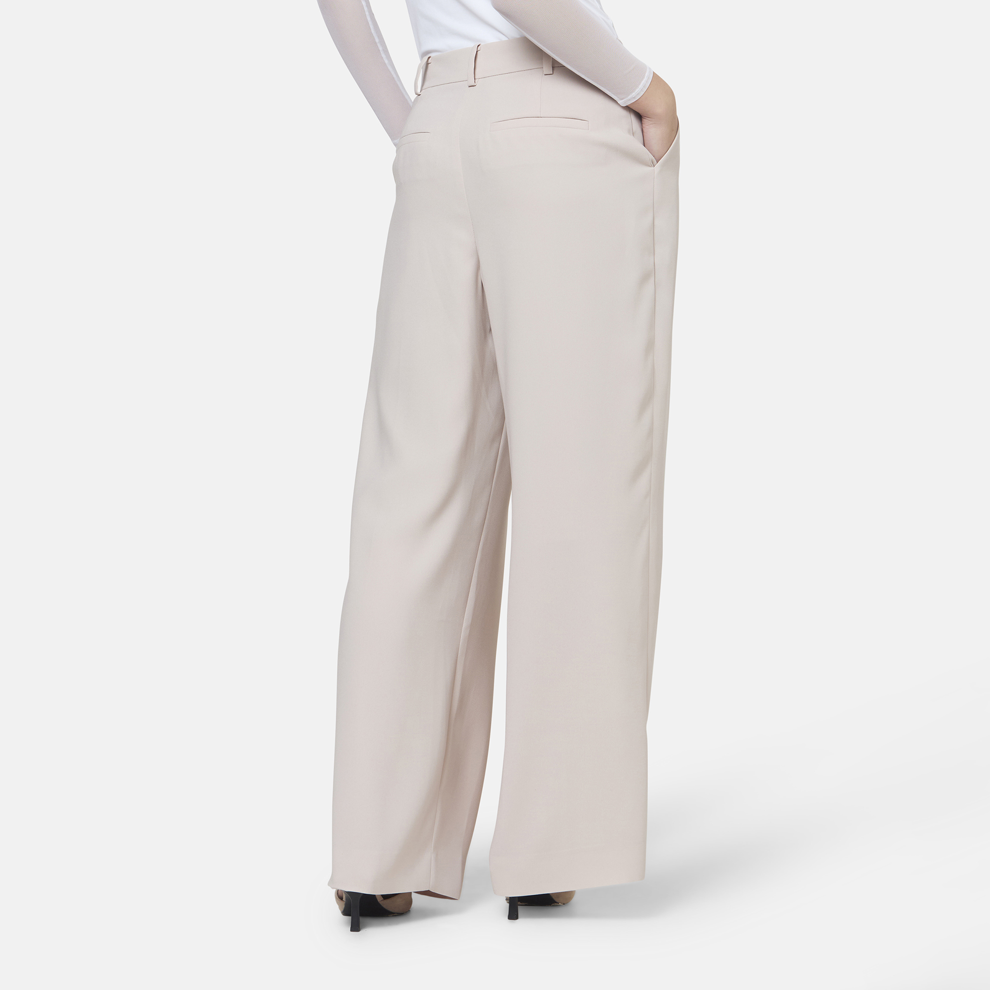 - Wide-leg silhouette, tailored style, natural waist, soft front pleats, pressed creases, side pockets, belt loops, back welt pockets