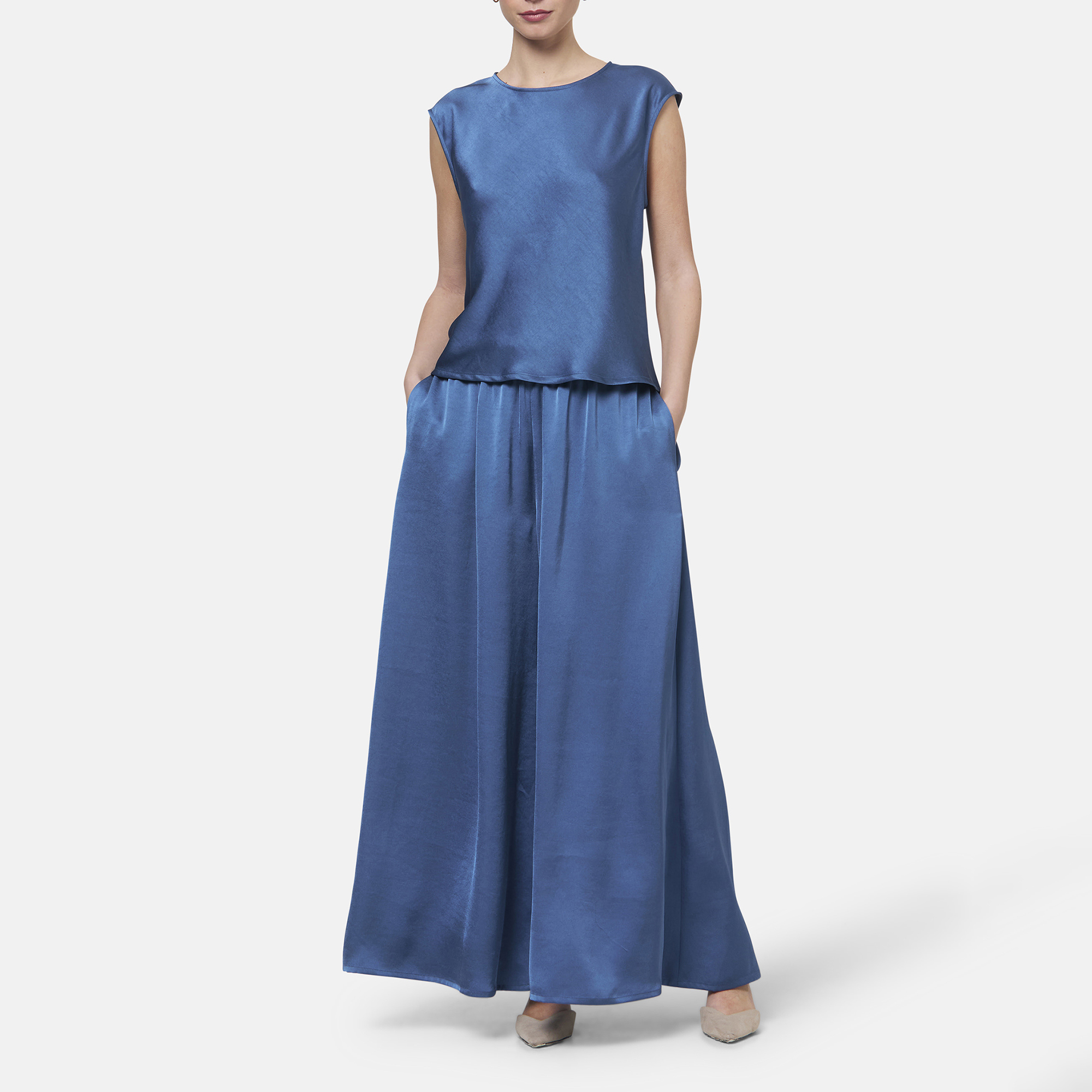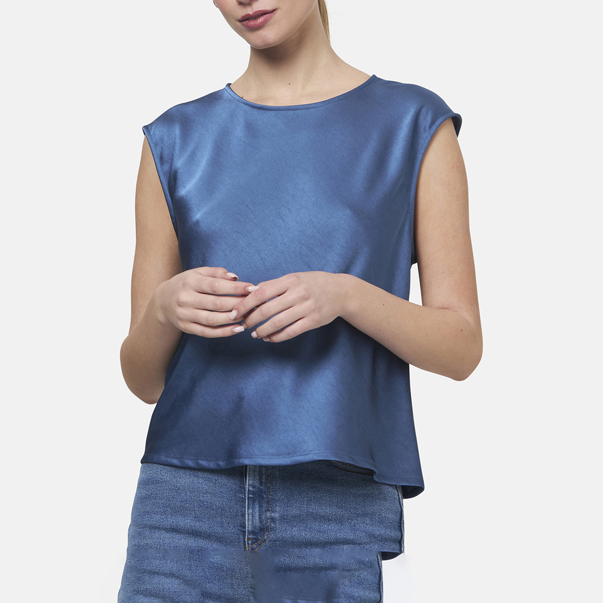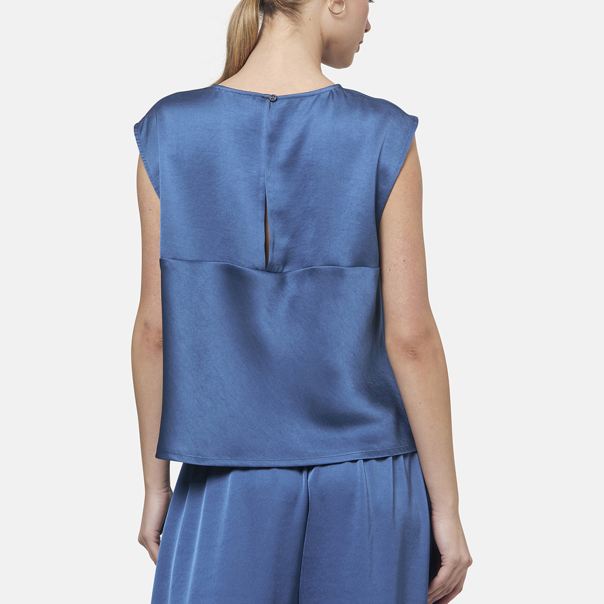 • Boat neckline, rear keyhole and button fastening, cap sleeves, straight hem, tonal stitching, satin finish