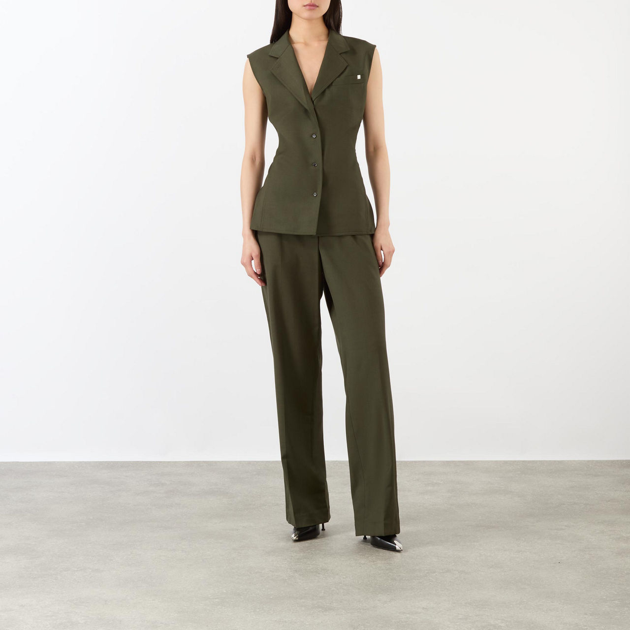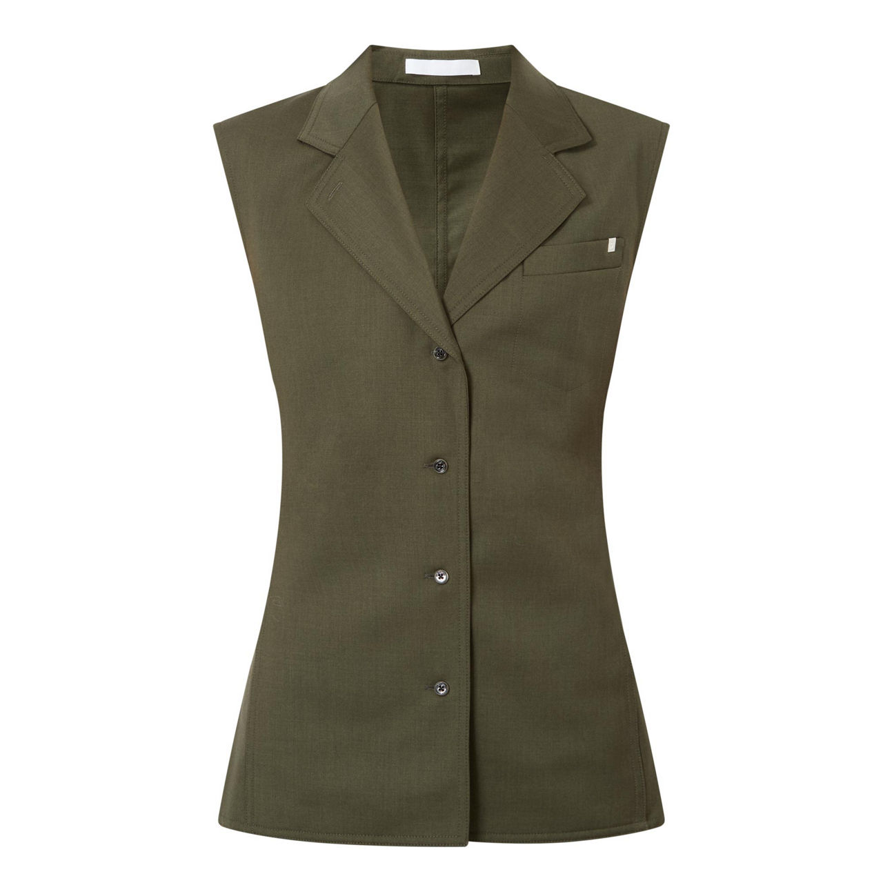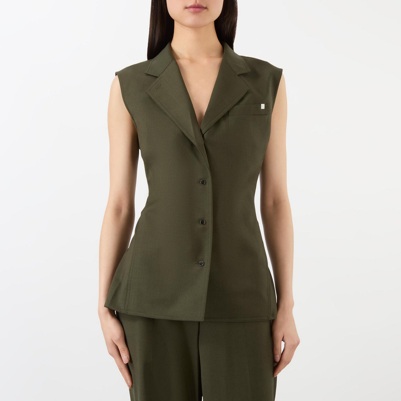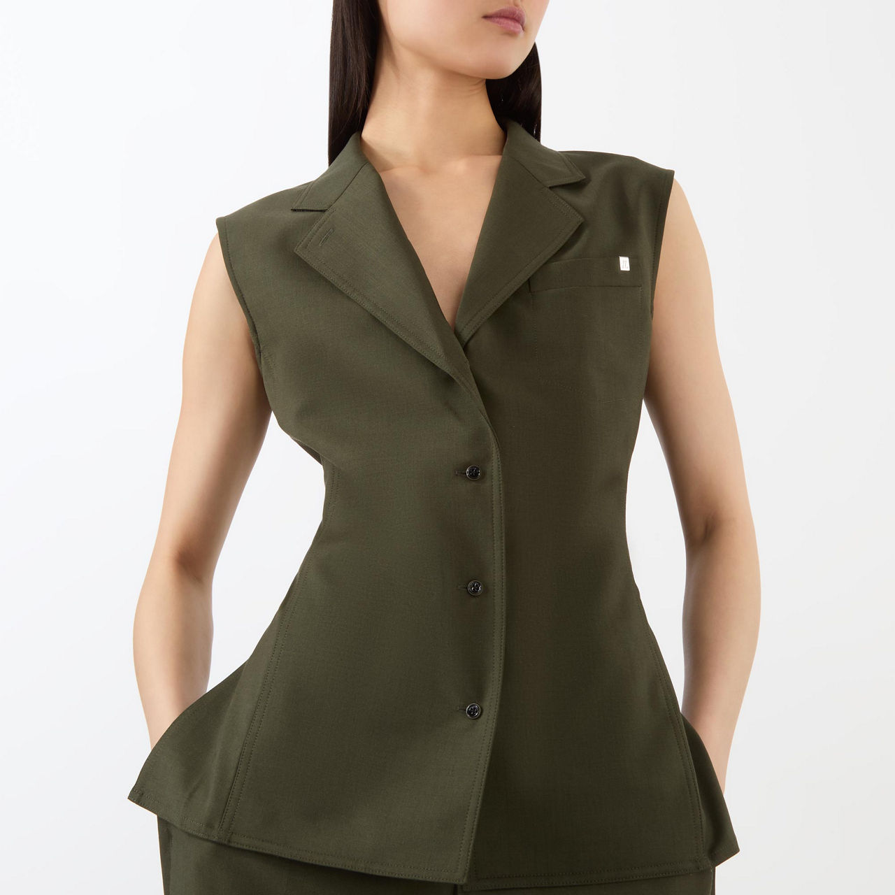 • Notch lapel collar, sleeveless design, front button fastening, one chest welt pocket, straight hem, side vents, metal logo clip