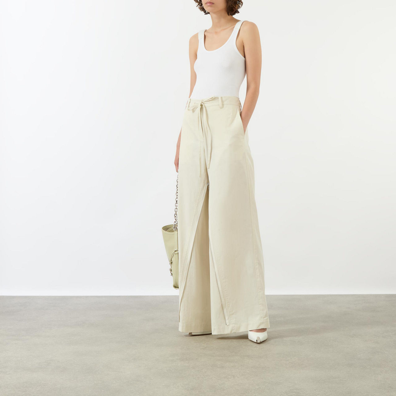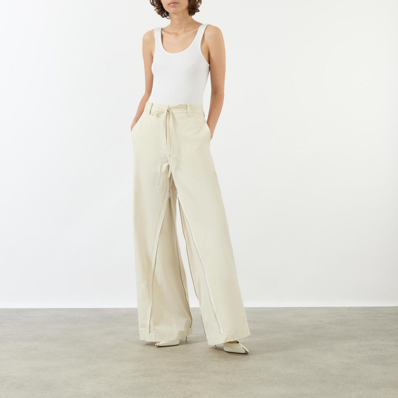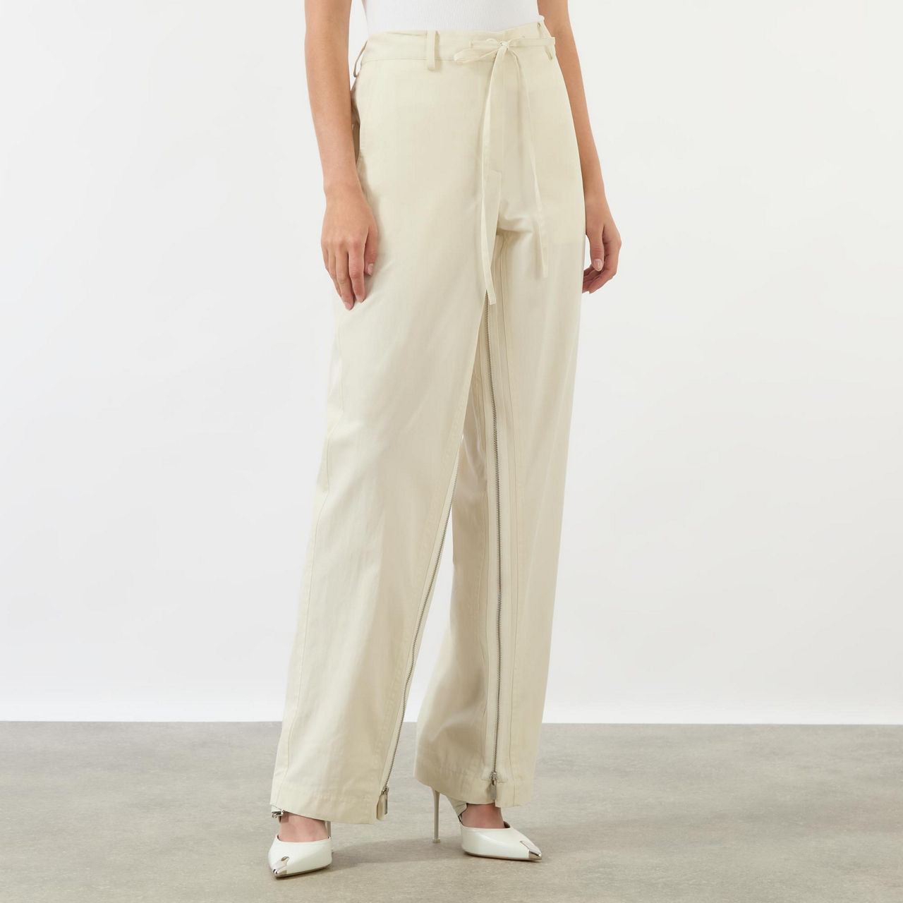 - Tie belt detail, wide leg, full-length inseam zips, side seam pockets
