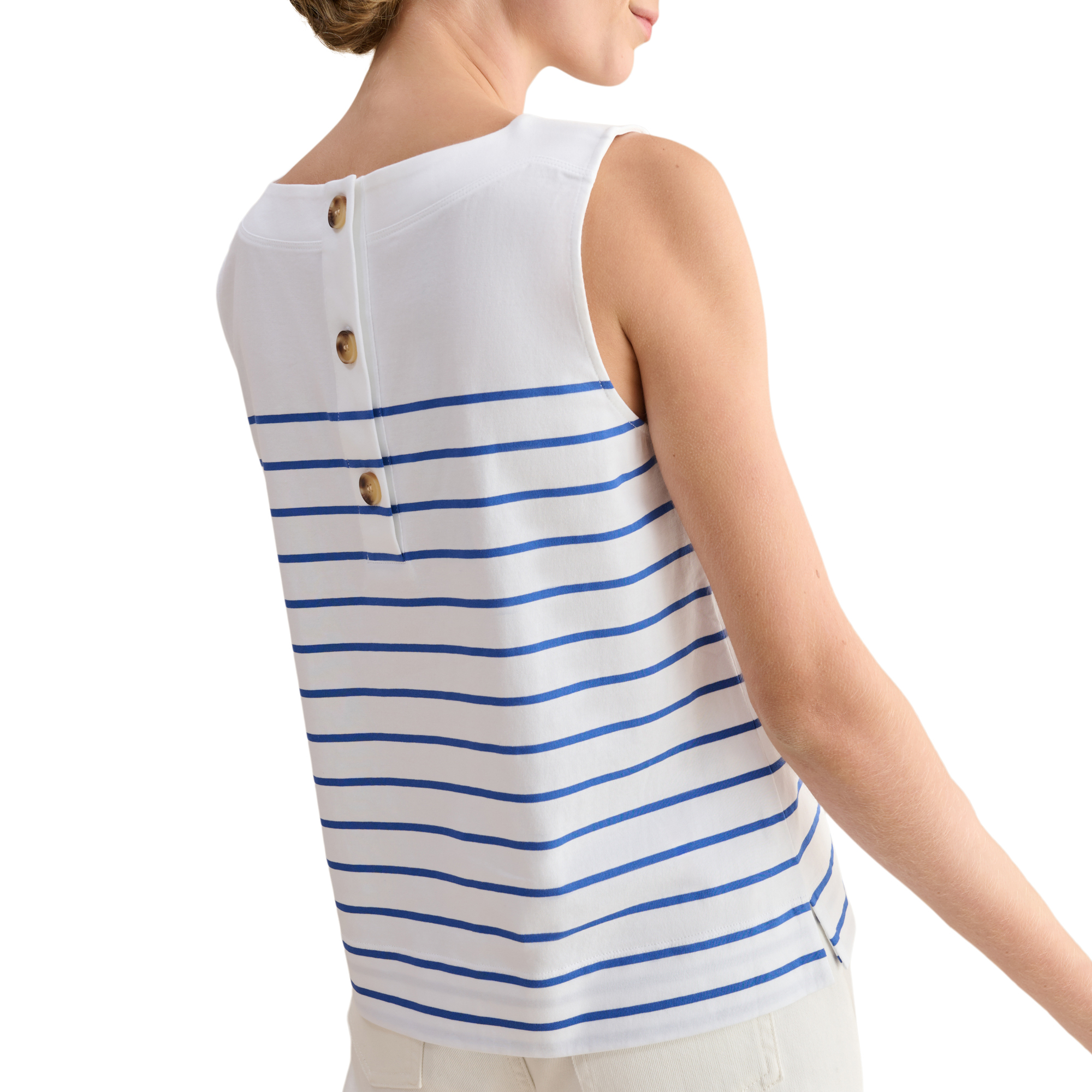 - Sleeveless, back button detailing, breathable, boat neckline, nautical stripes