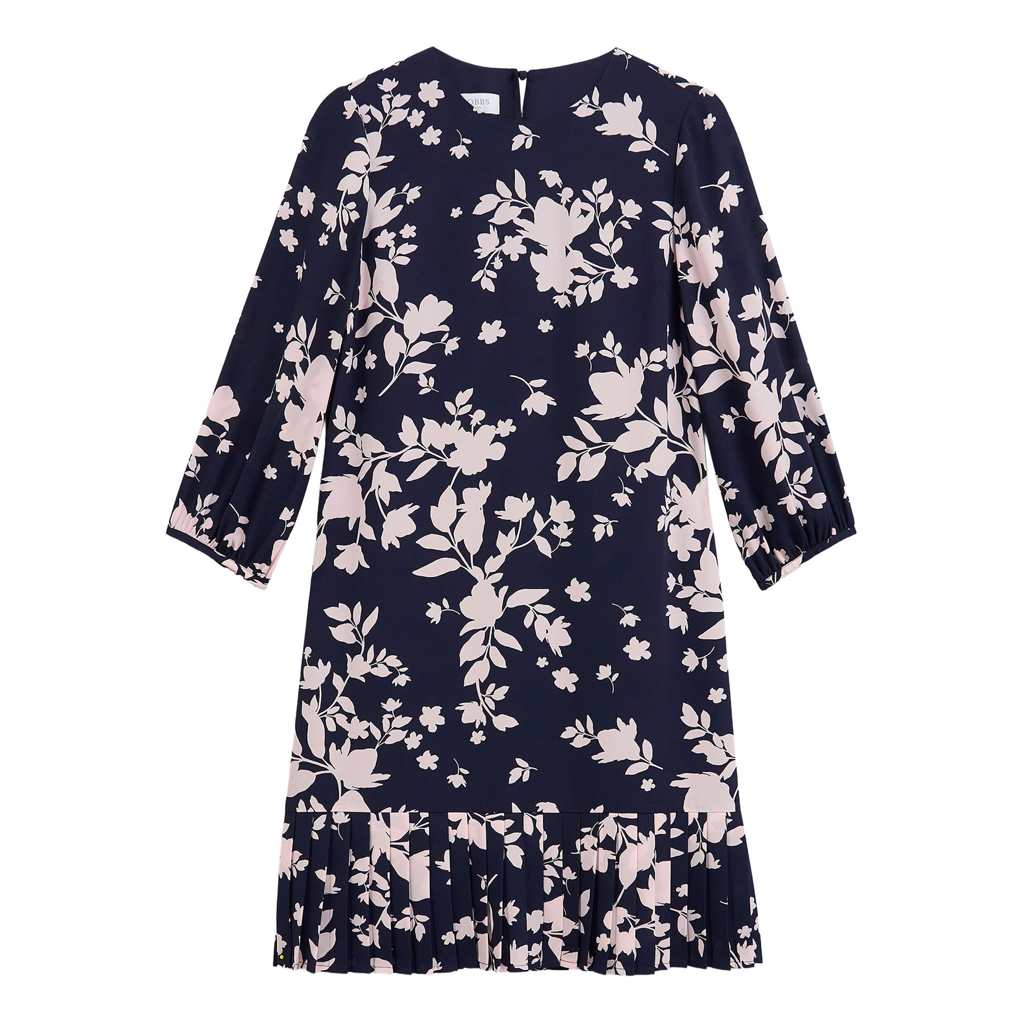 - Mini length, pleated hem, floral print, three-quarter length sleeves, A-line silhouette, crew neckline, zip and hook and eye fastening, woven, body lining