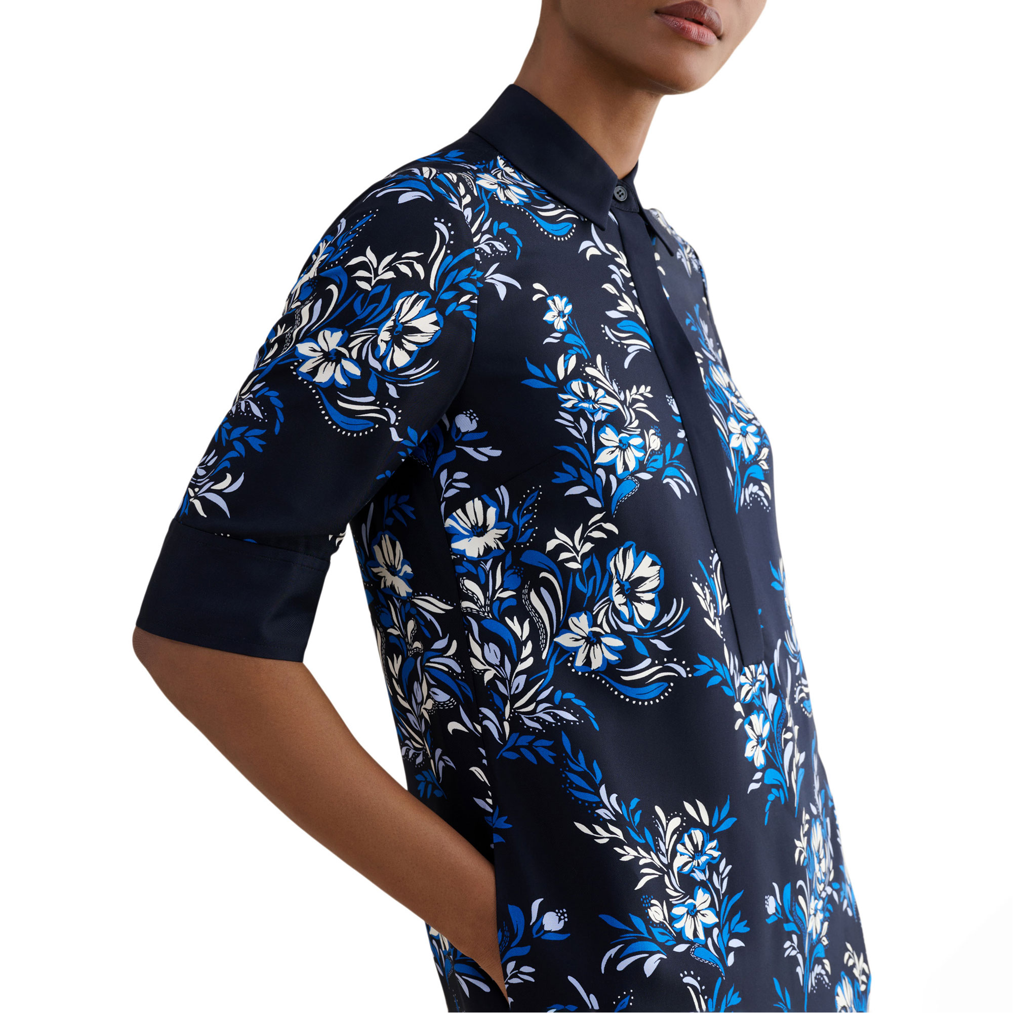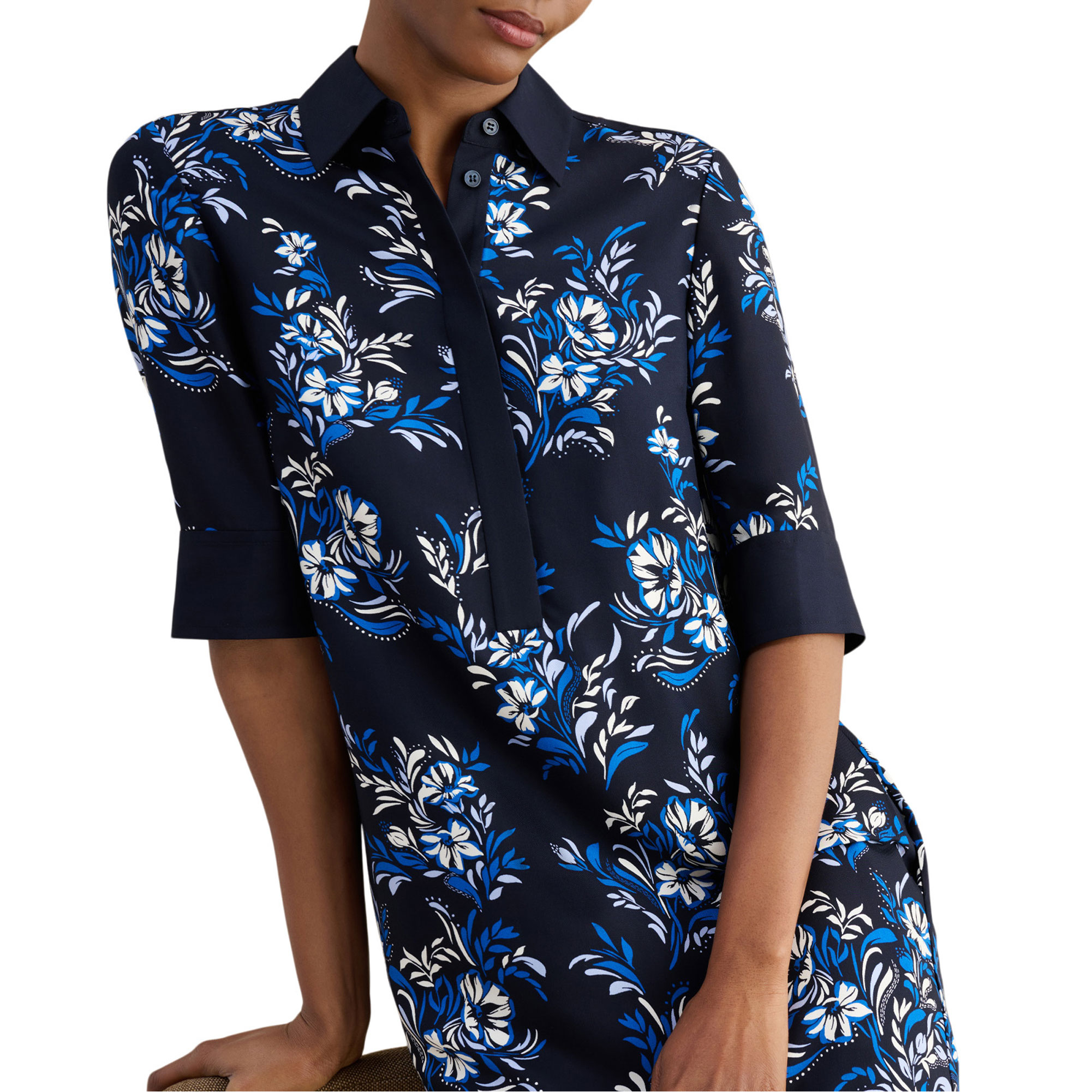 - Floral print, tunic silhouette, contrast trims, collared neckline, concealed button placket, mini length, three-quarter-length sleeves, side pockets, woven