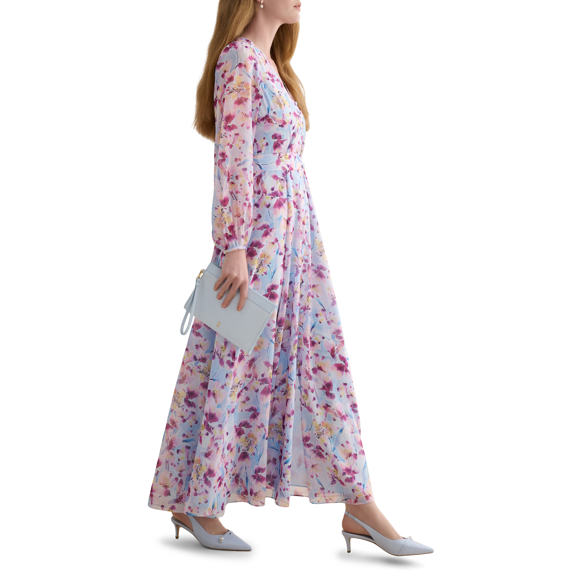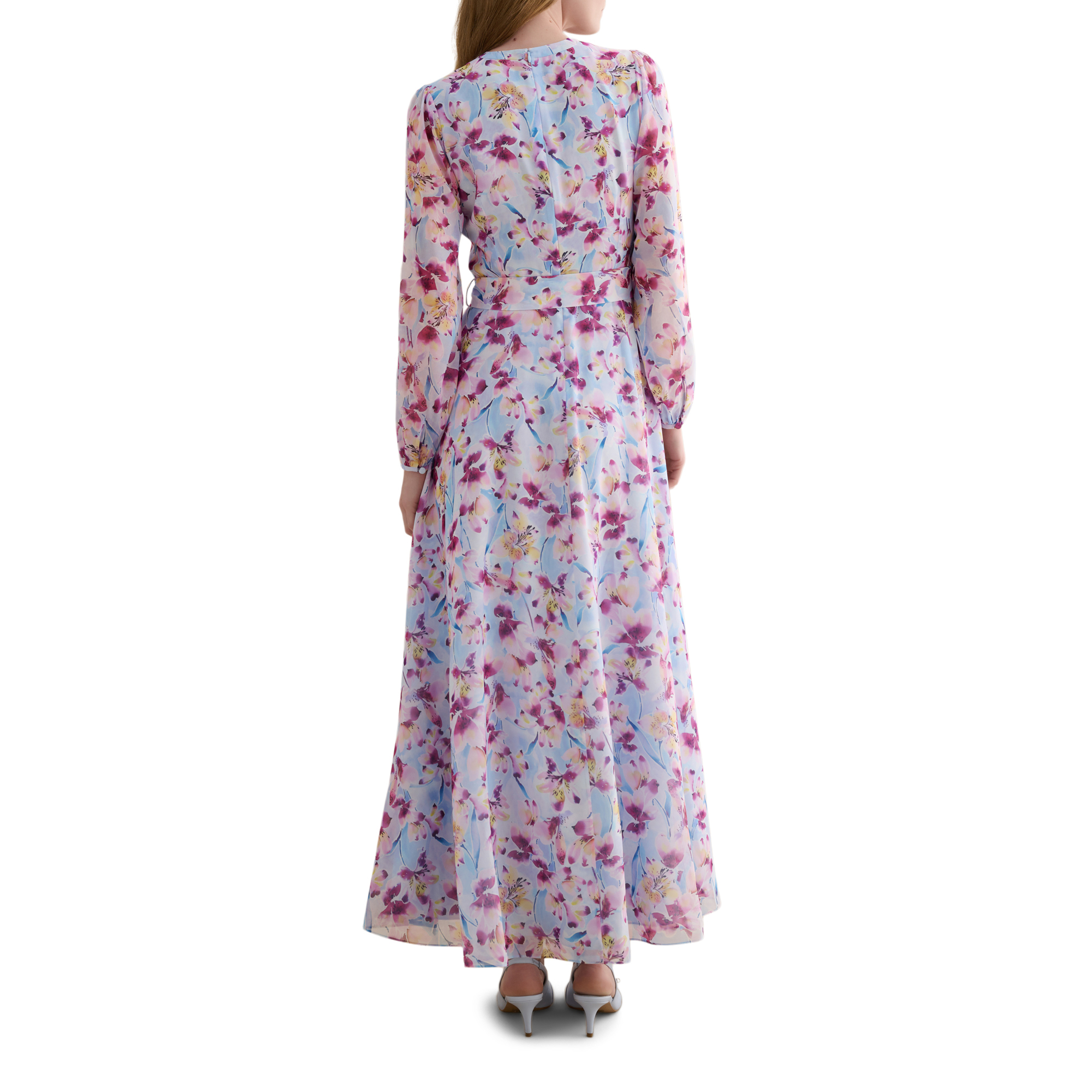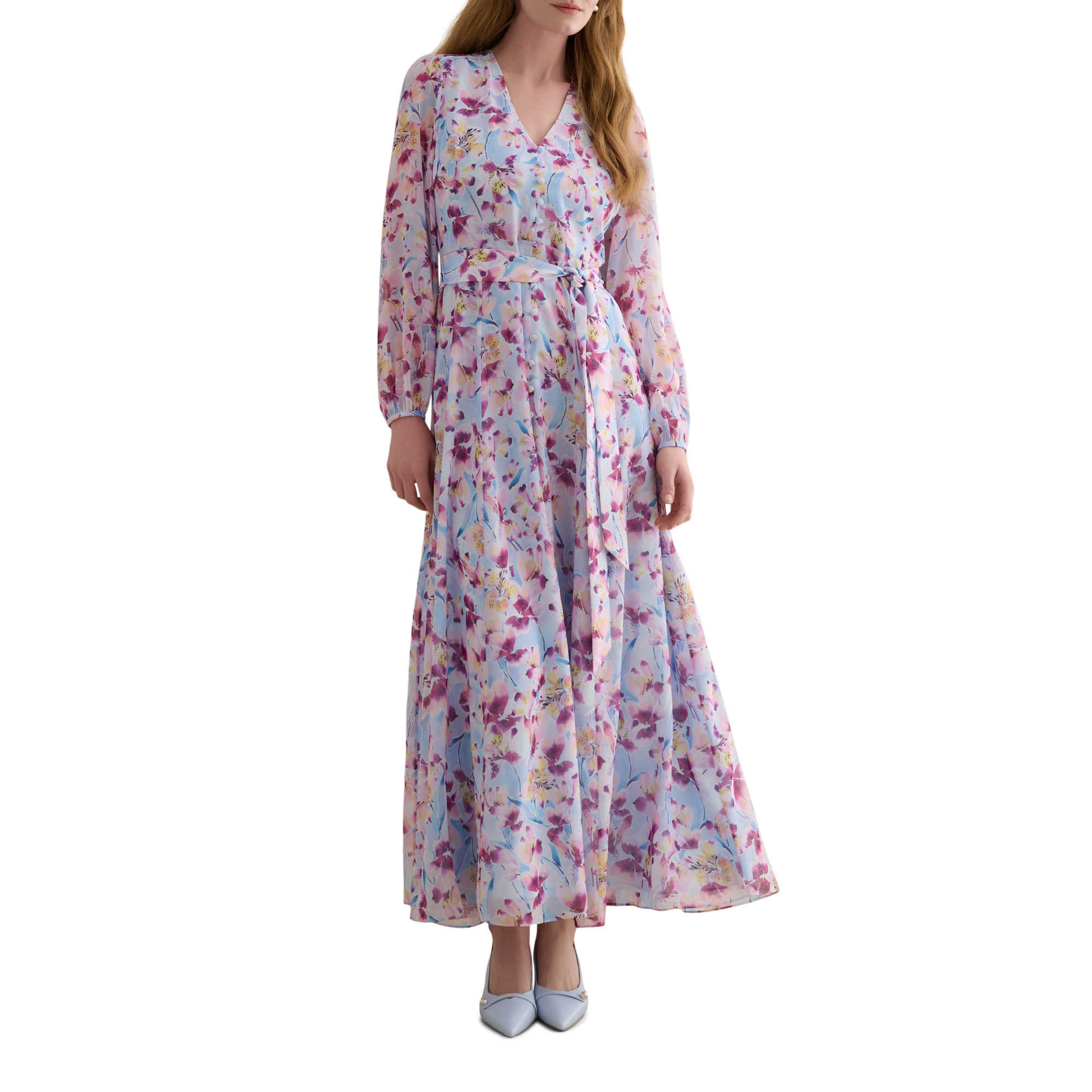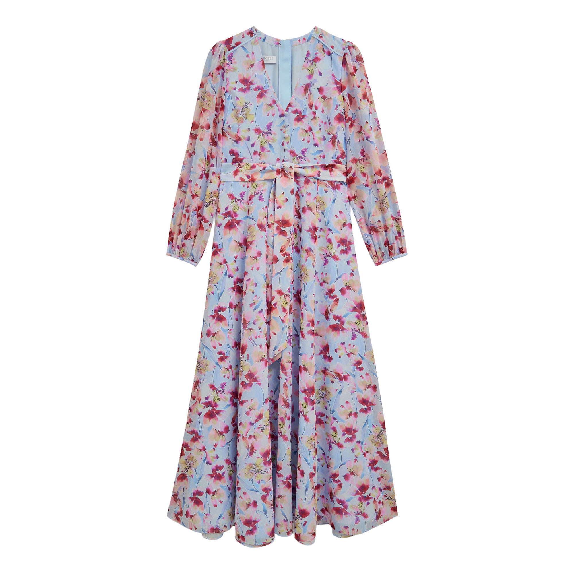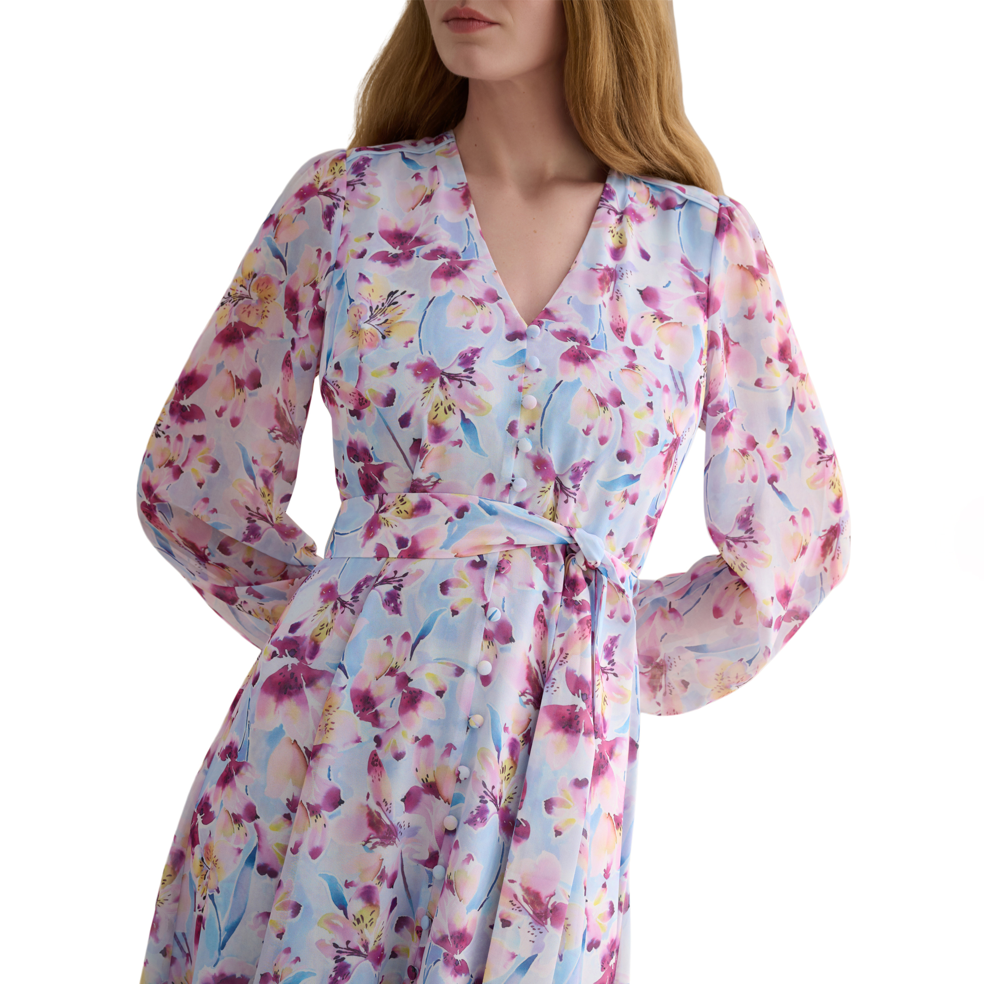 - Chiffon-style fabric, fabric-covered buttons, semi-sheer long blouson sleeves, in-seam side pockets, V-neckline, fit and flare silhouette, floral print, zip and hook and eye fastening, fully lined