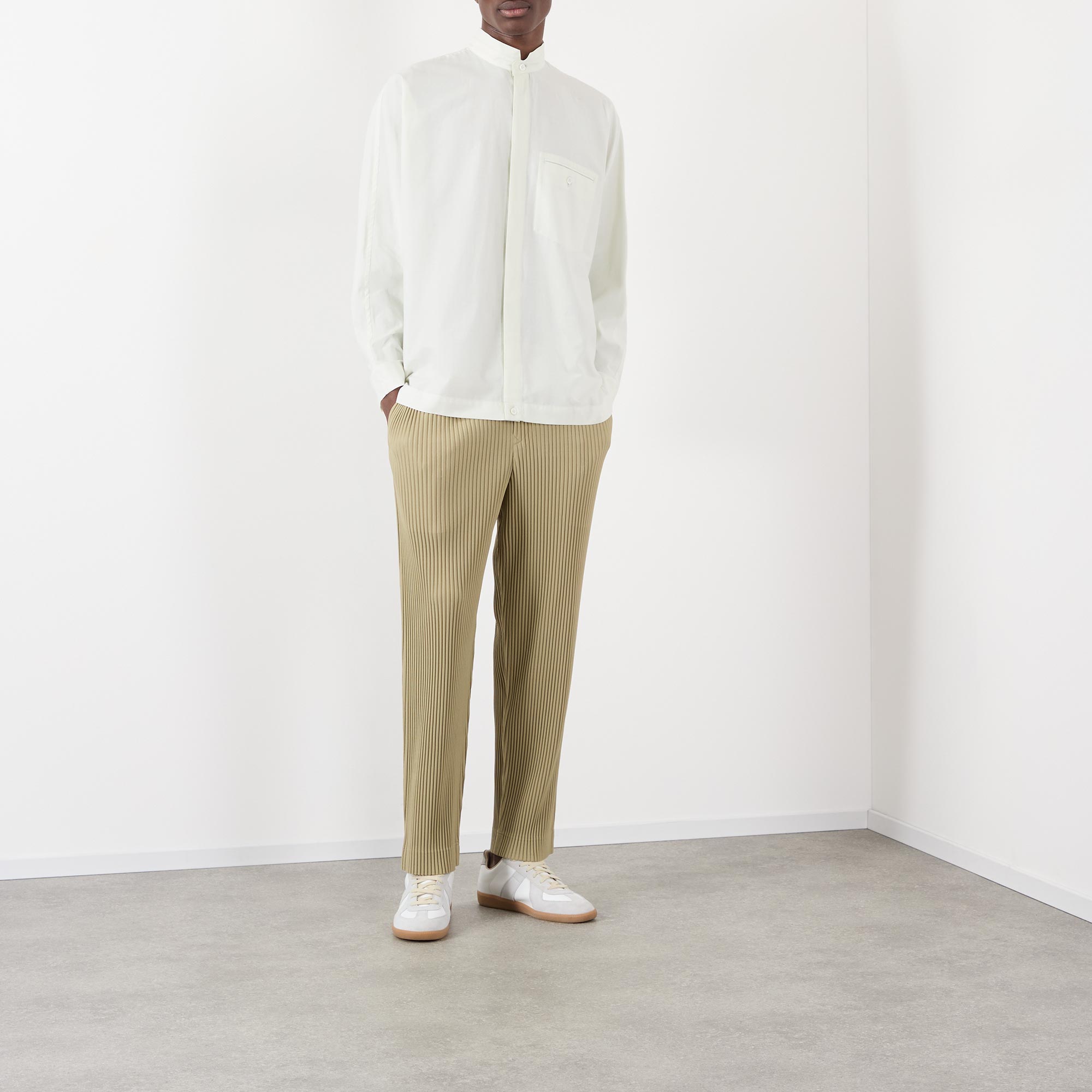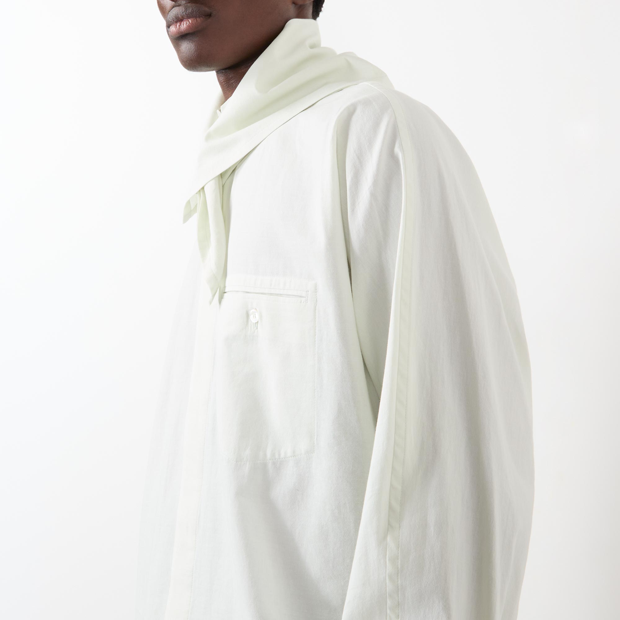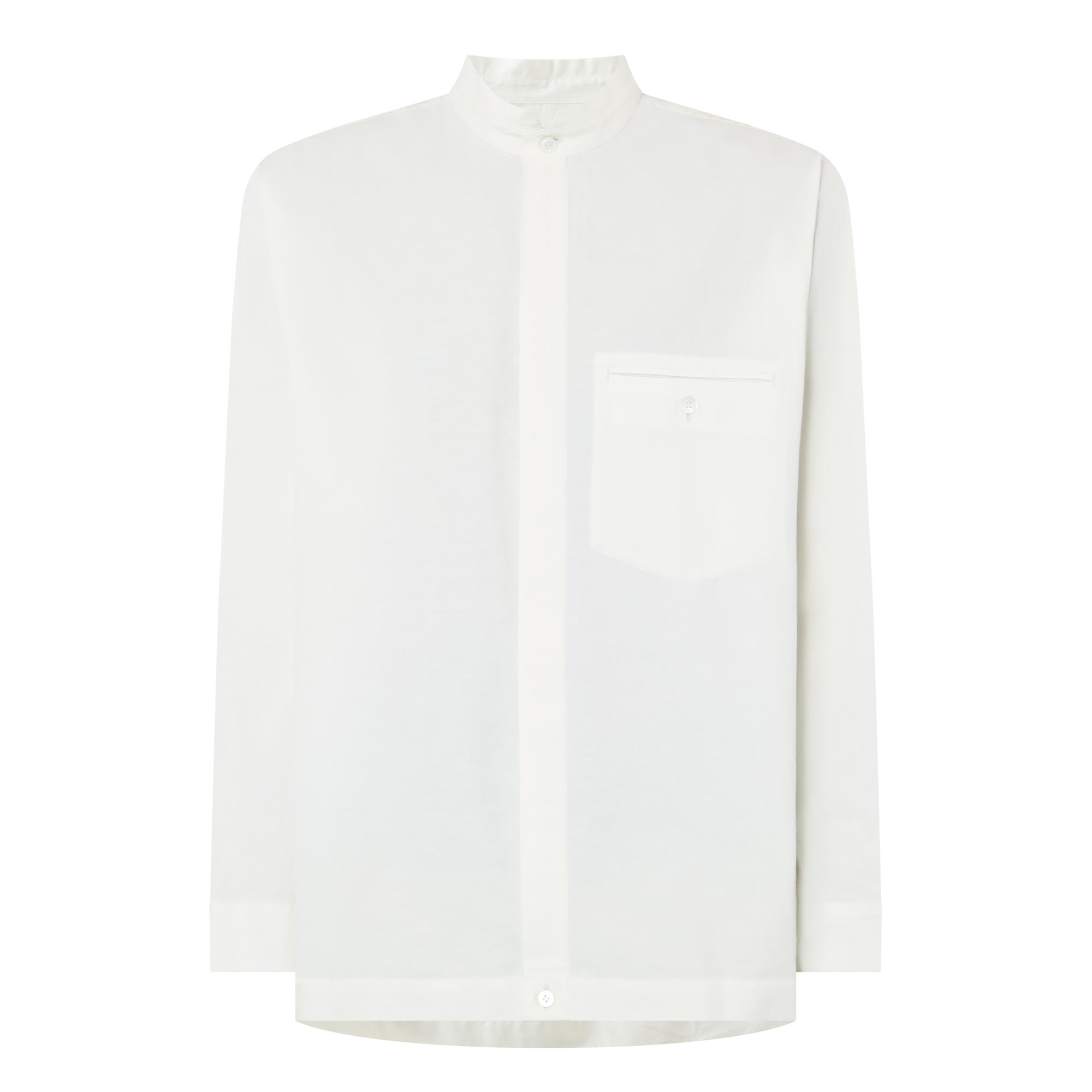 • Stand collar, long sleeves, buttoned cuffs, one chest pocket with button fastening, concealed front fastening, curved hem, rear box pleat